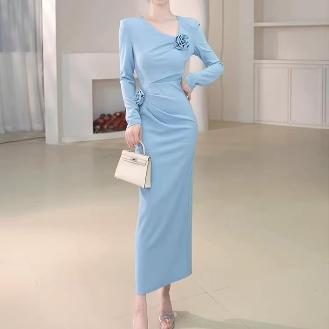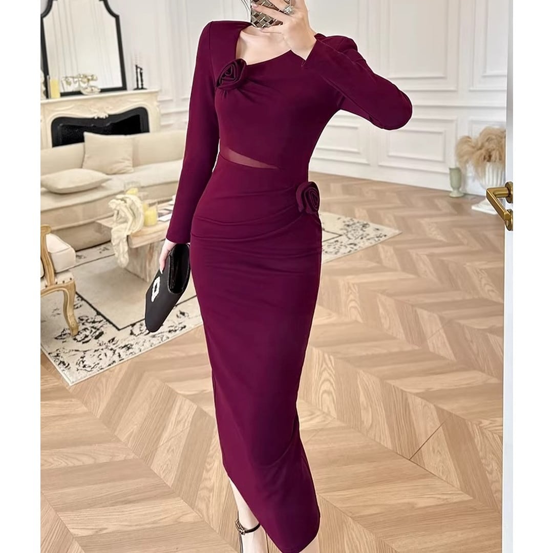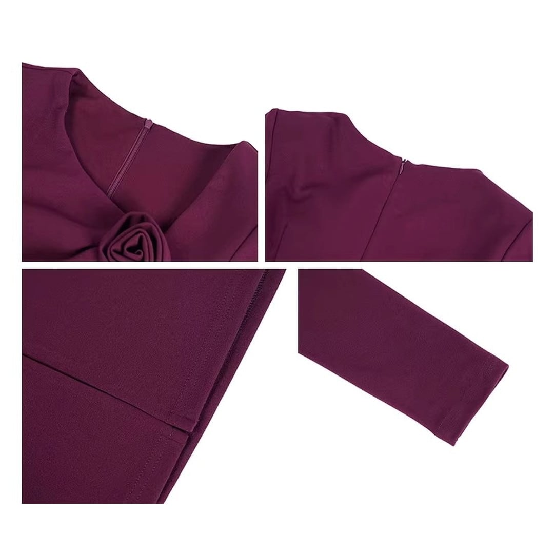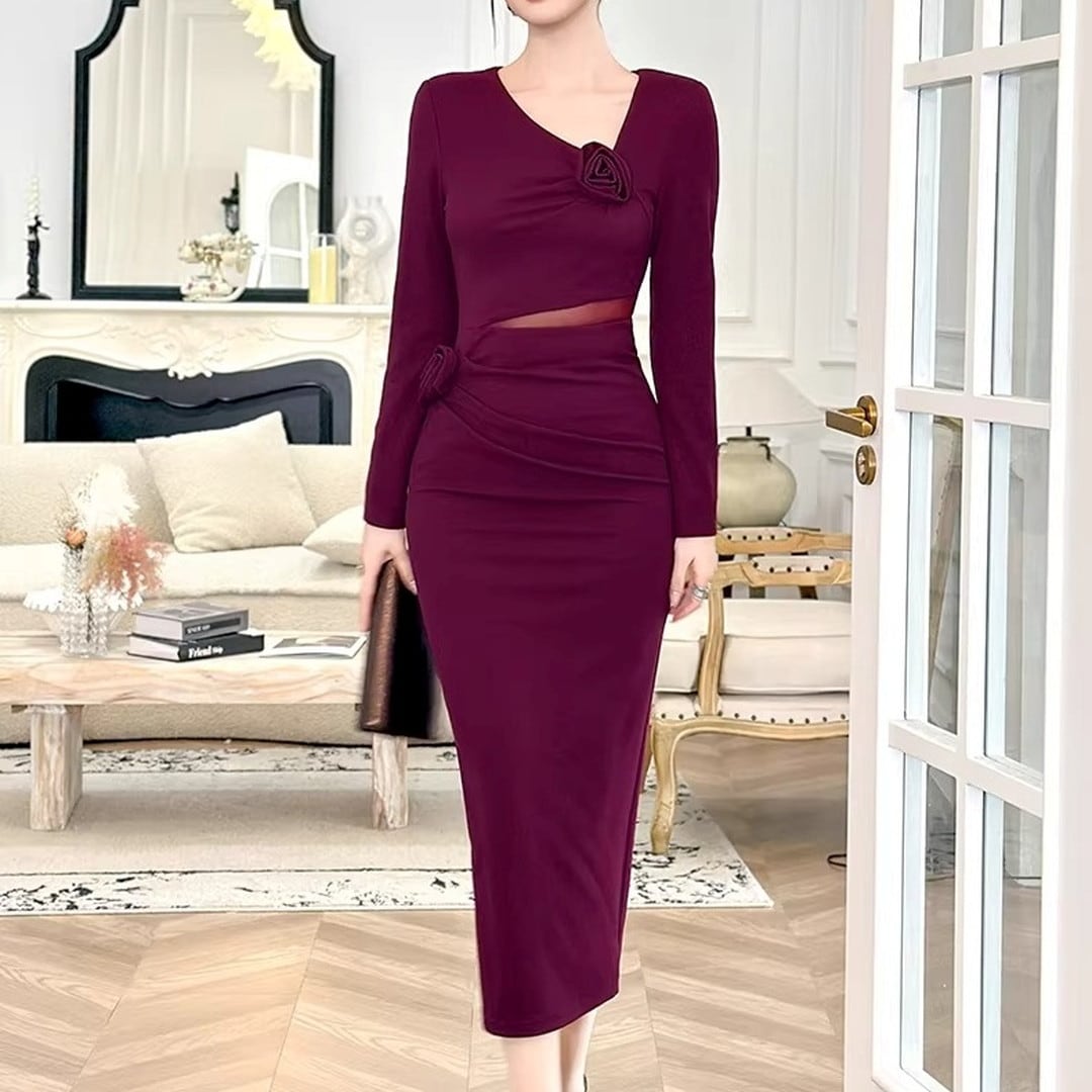 エレガントなシルエットが魅力の長袖ミディ丈タイトドレス。美しいボディラインを演出し、大人の女性らしさを引き立てます。胸元のデザインがアクセントとなり、華やかさをプラス。ちょっとしたお呼ばれやパーティーシーンにもおすすめです。