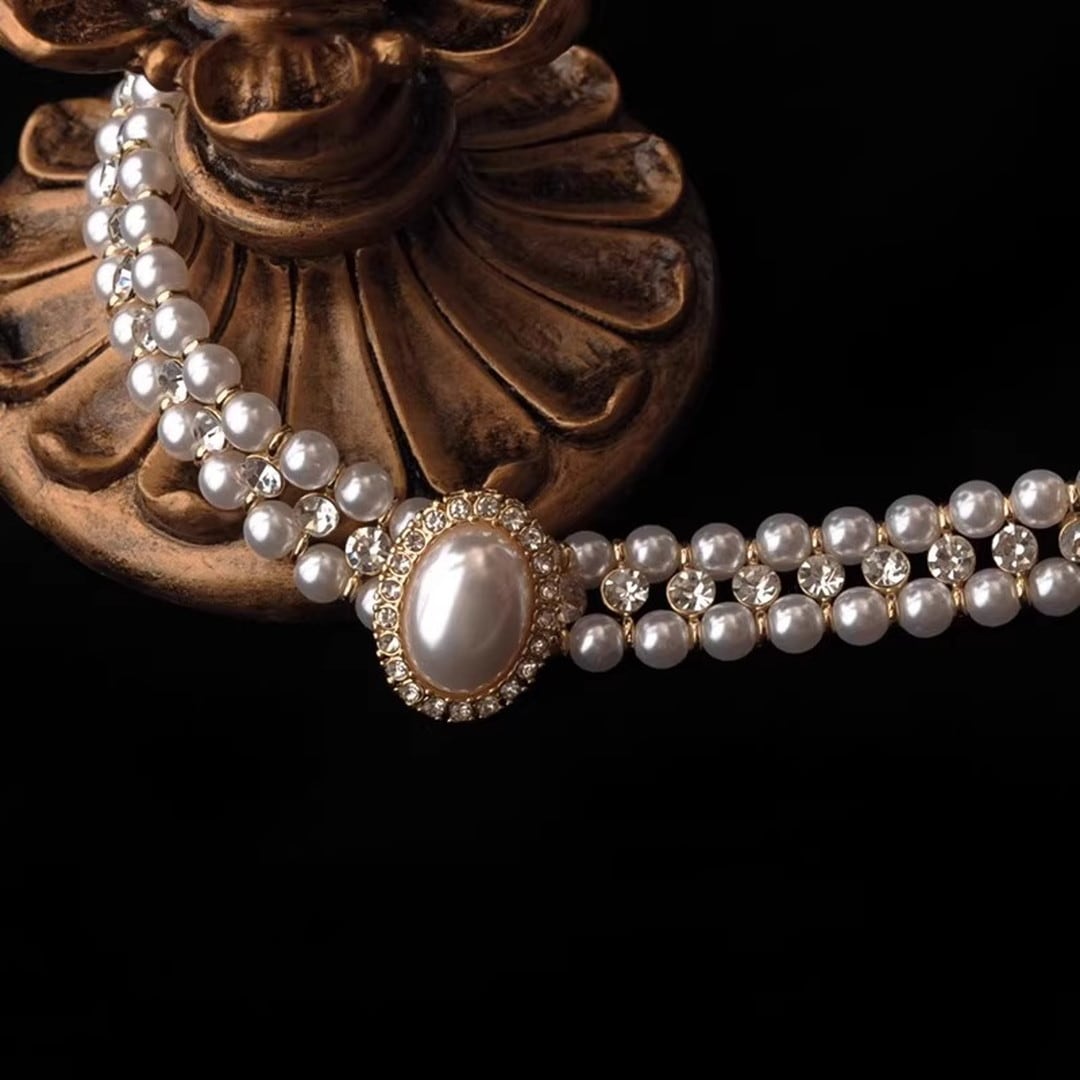 二連のビーズが首元を華やかに演出し、中央のオーバル型の装飾が目を引きます。