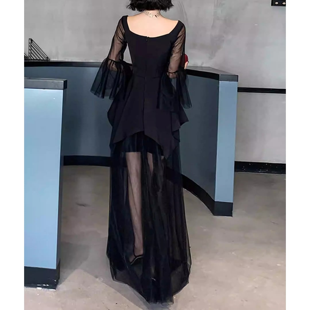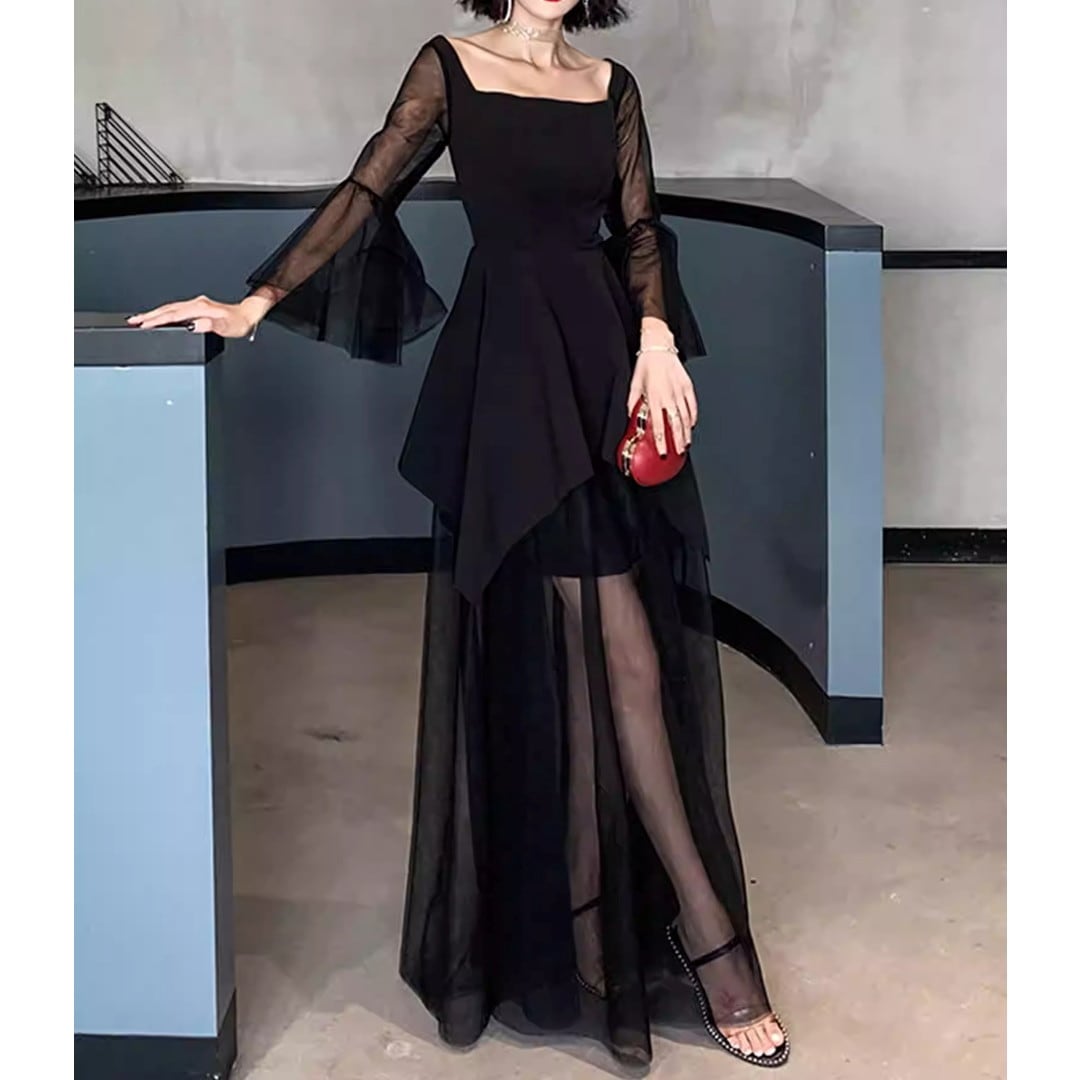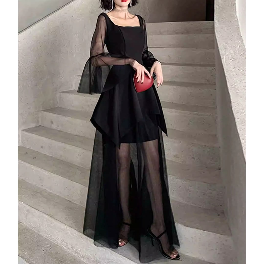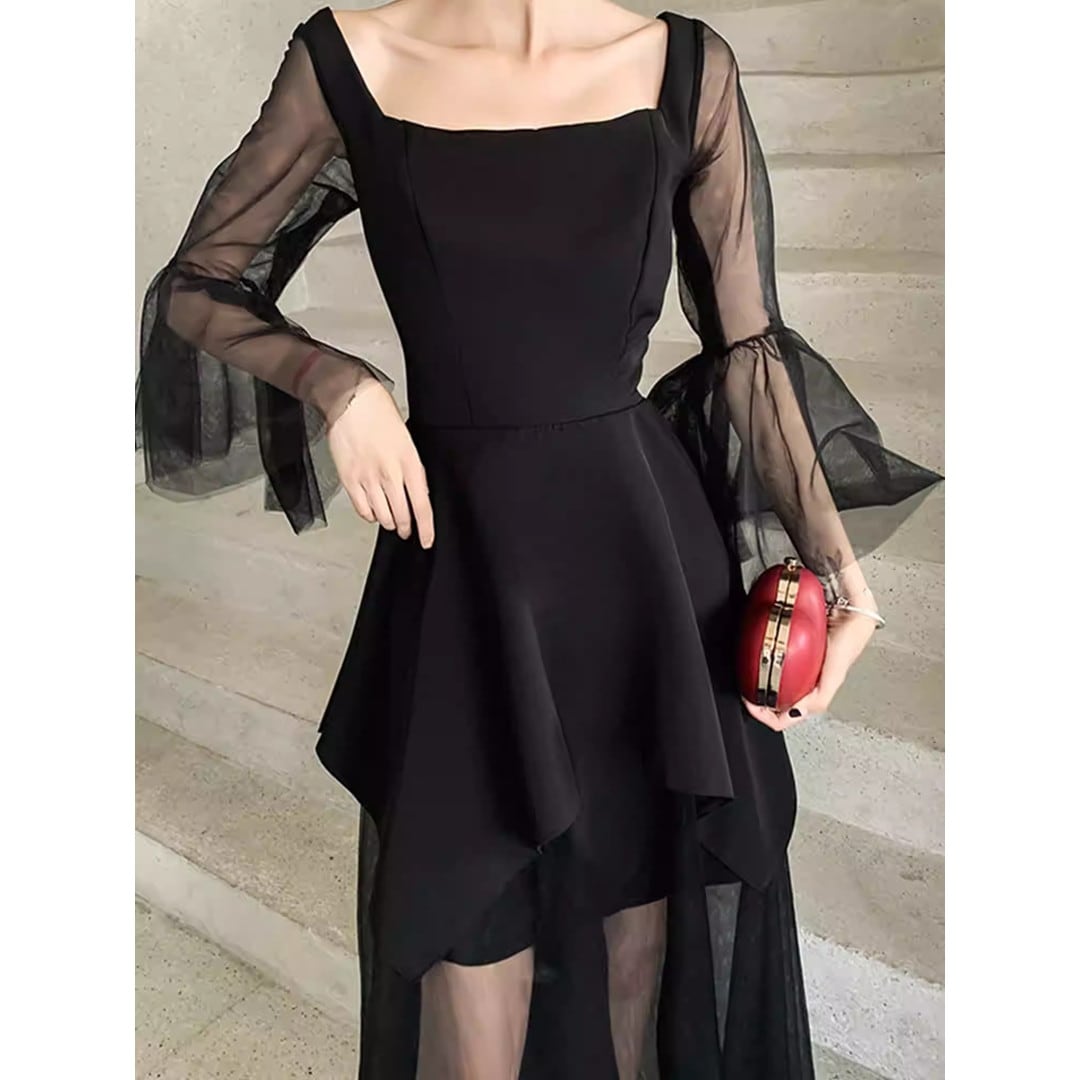 スクエアネックがデコルテを美しく見せる、ロングスリーブミディドレス。アシンメトリーな裾のデザインが、動きのあるシルエットを演出します。特別な日のディナーやパーティーシーンはもちろん、普段使いにもおすすめです。