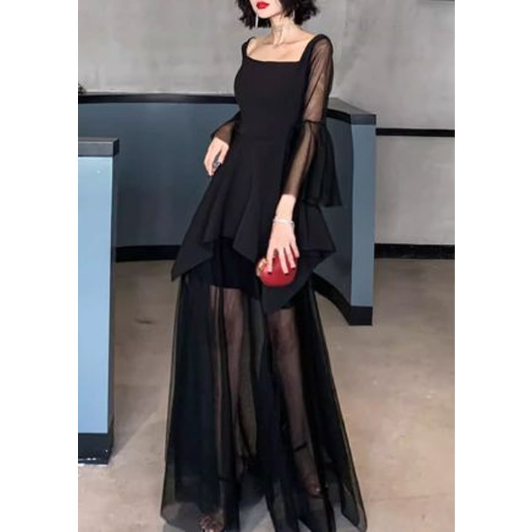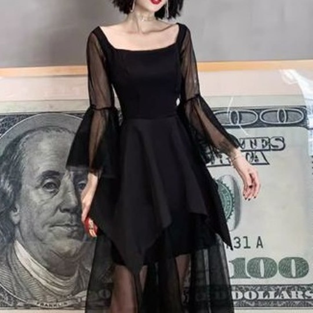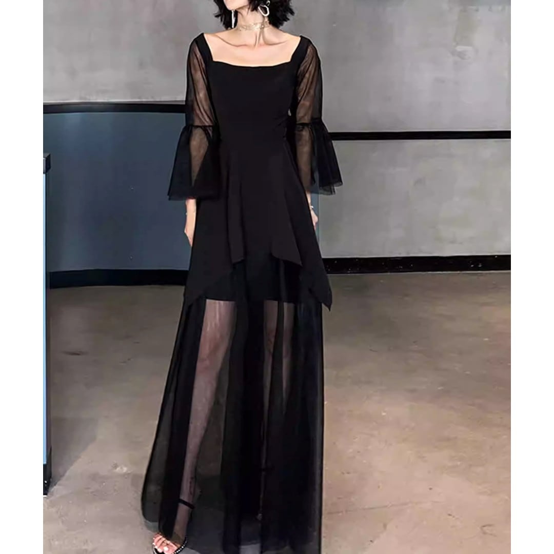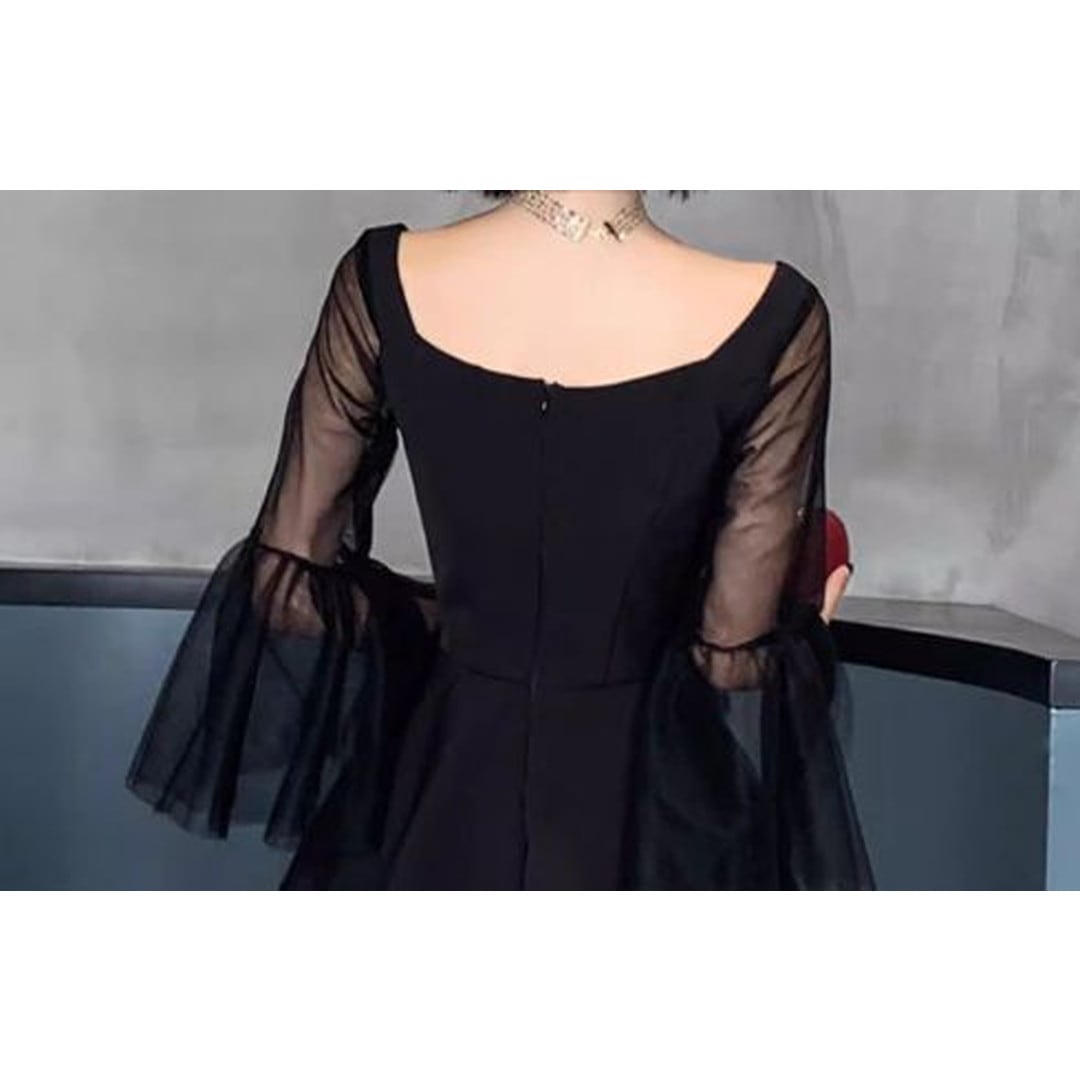 スクエアネックがデコルテを美しく見せる、ロングスリーブミディドレス。アシンメトリーな裾のデザインが、動きのあるシルエットを演出します。特別な日のディナーやパーティーシーンはもちろん、普段使いにもおすすめです。