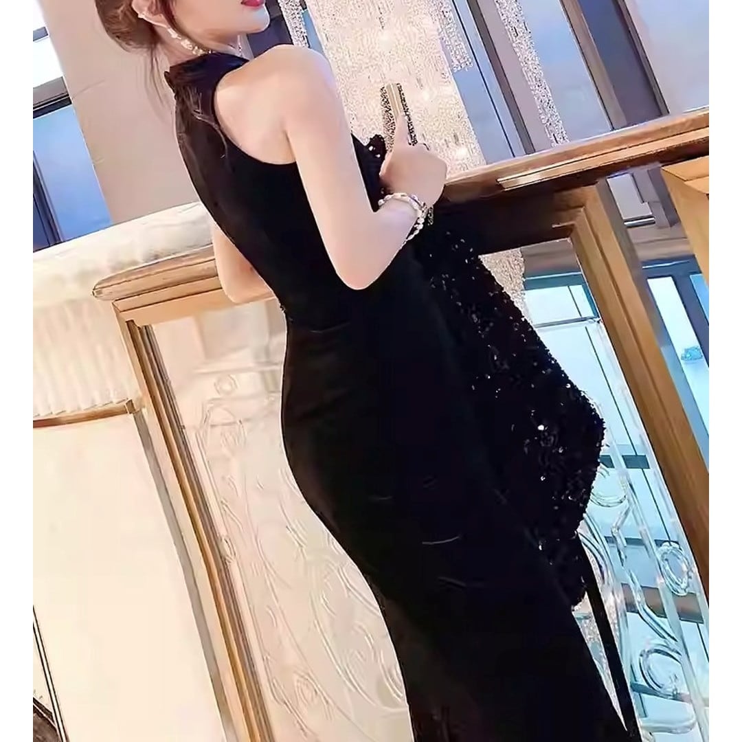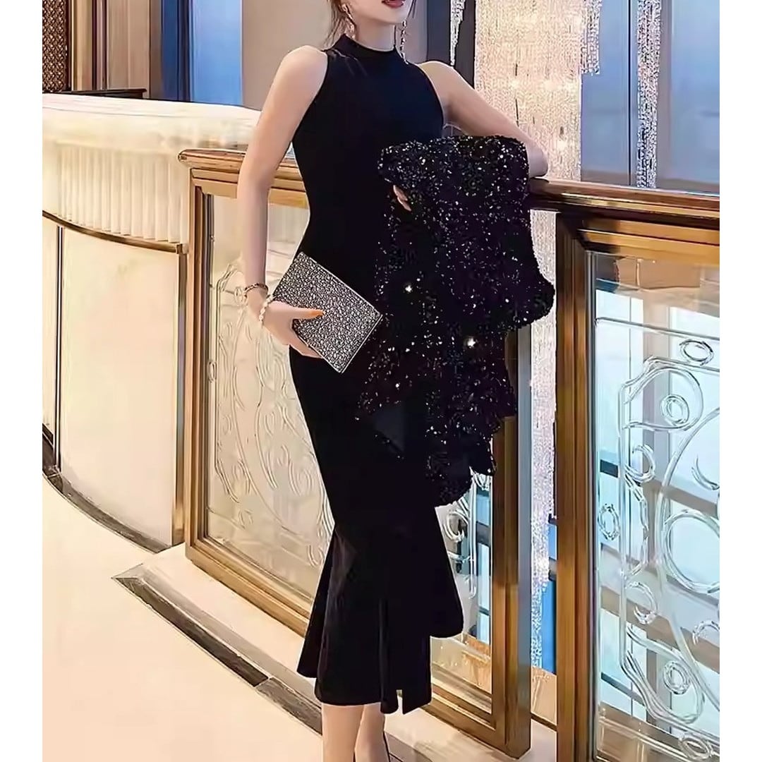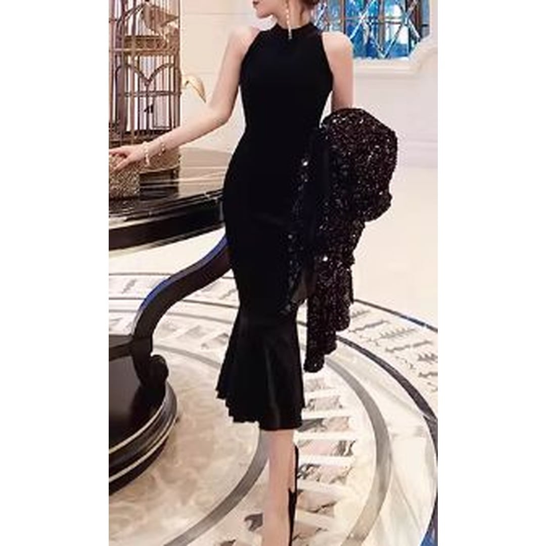 ノースリーブのデザインが、すっきりとした印象を与え、マーメイドラインが女性らしい曲線を際立たせます。
