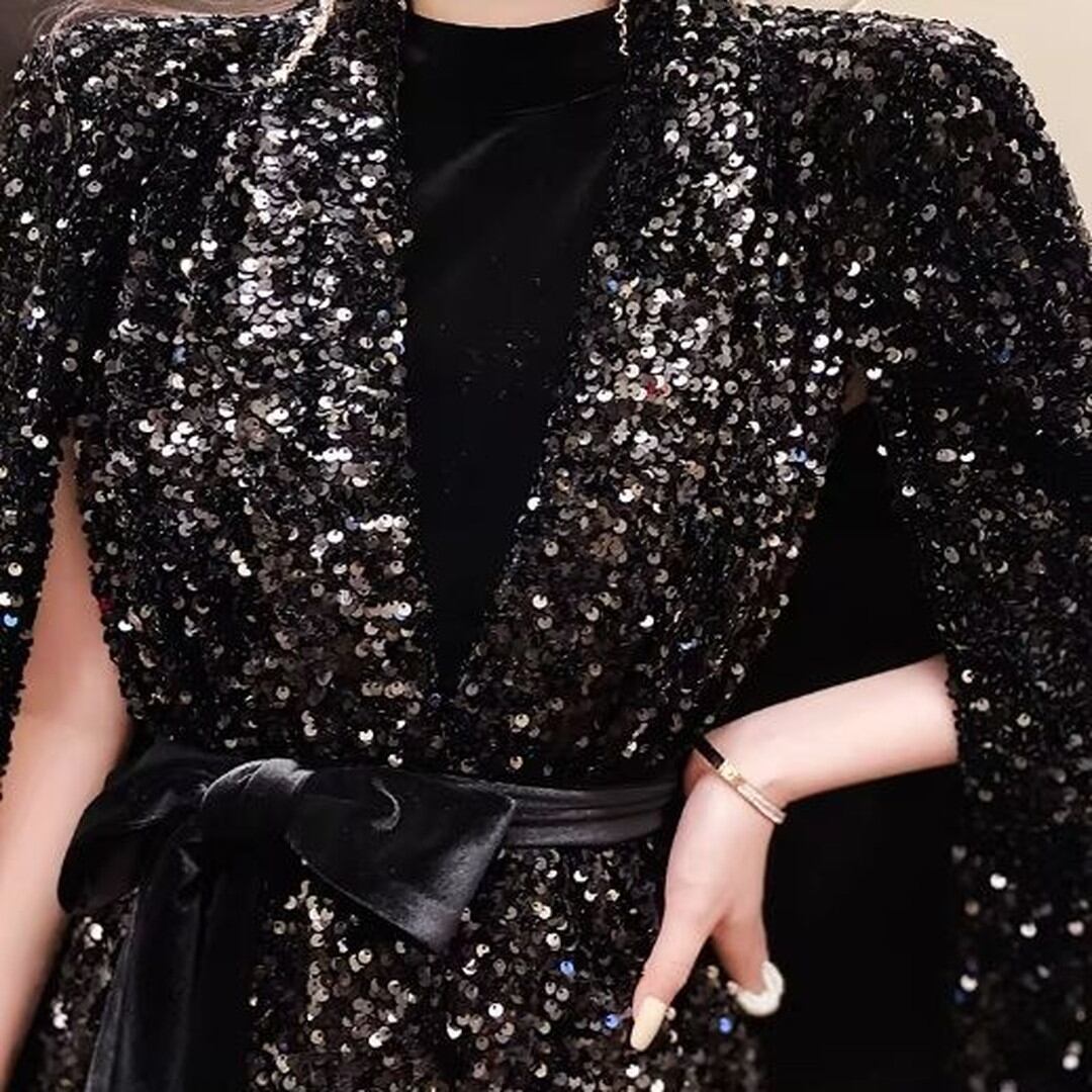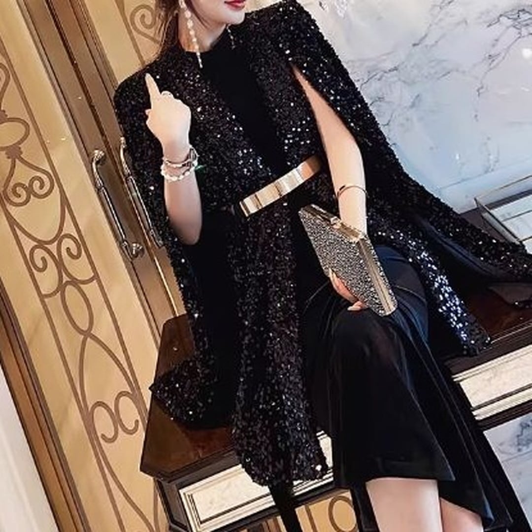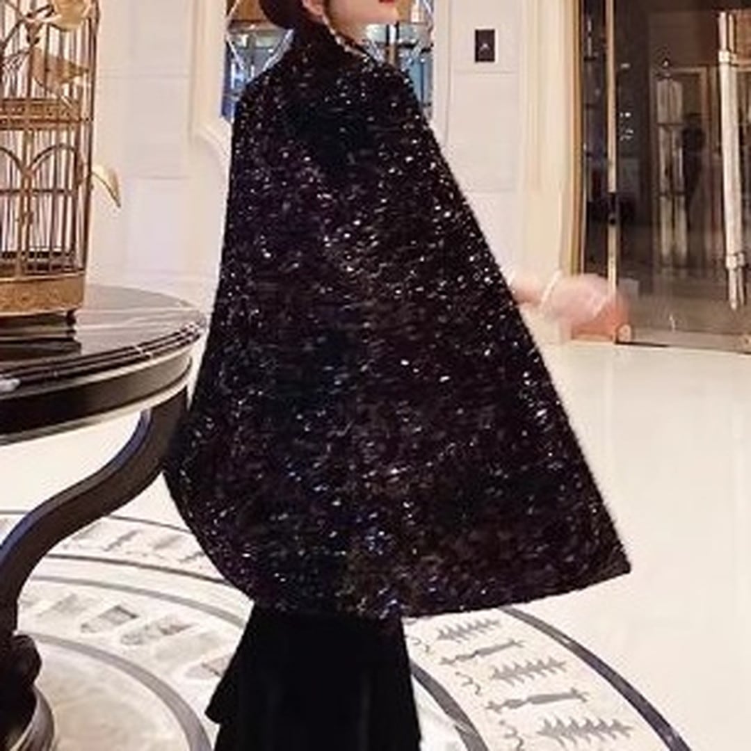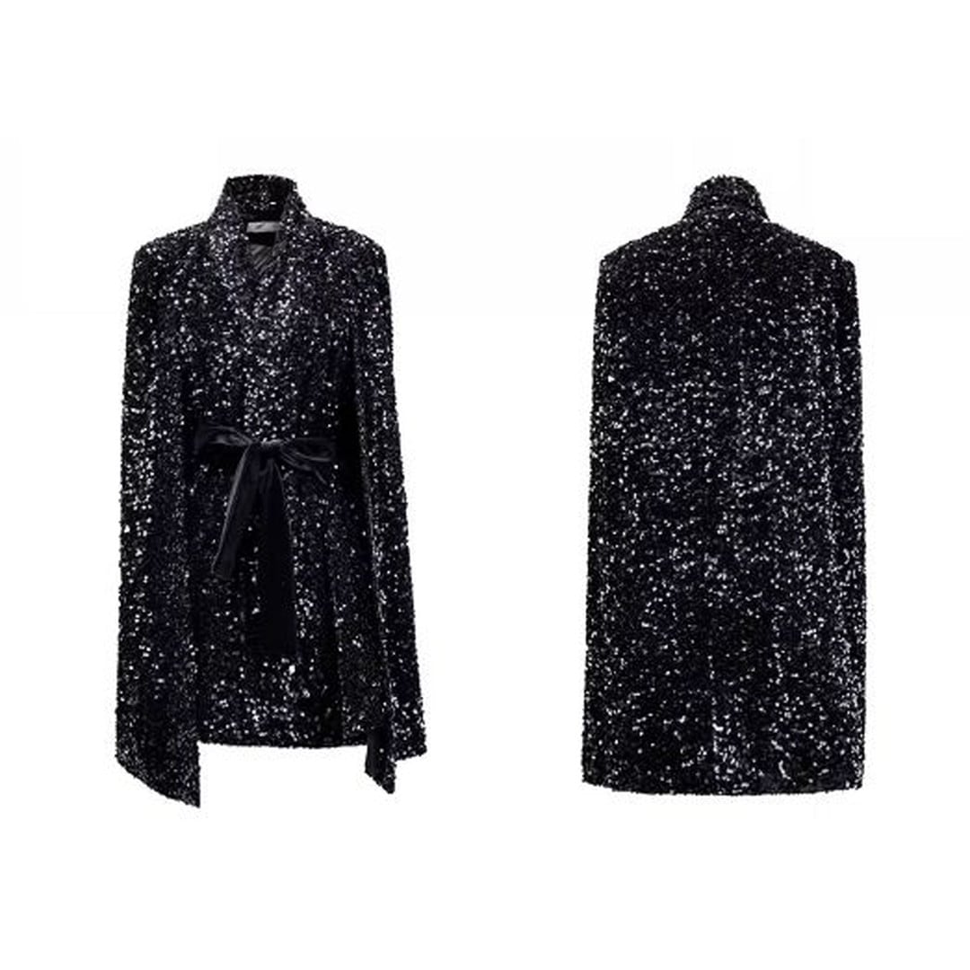 煌びやかなスパンコールが目を引くケープジャケット。ヒップレングス丈で、スタイルアップ効果も期待できます。付属のベルトでウエストマークすれば、よりフェミニンな印象に。パーティーシーンはもちろん、普段使いのコーディネートにプラスして、華やかさを演出するのもおすすめです。