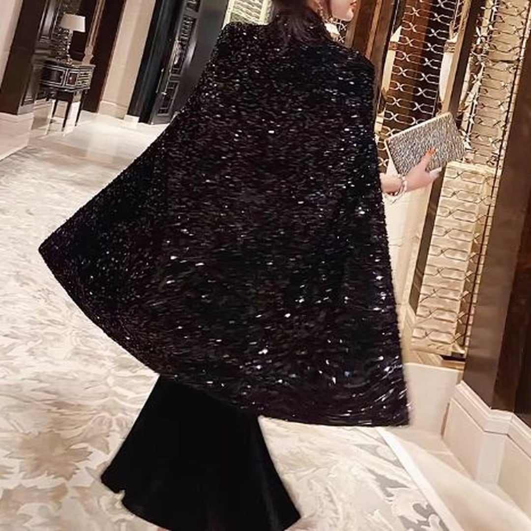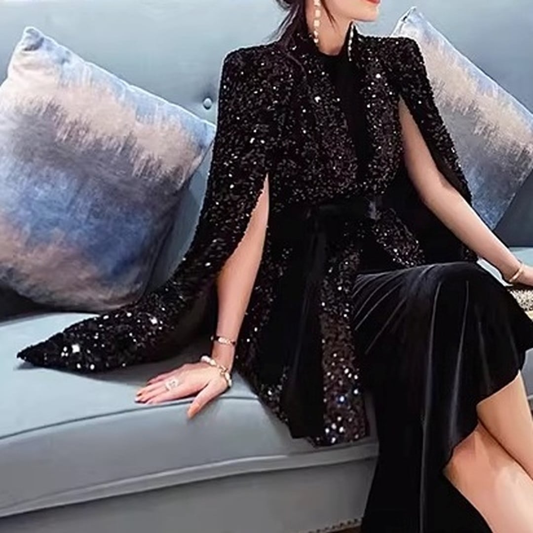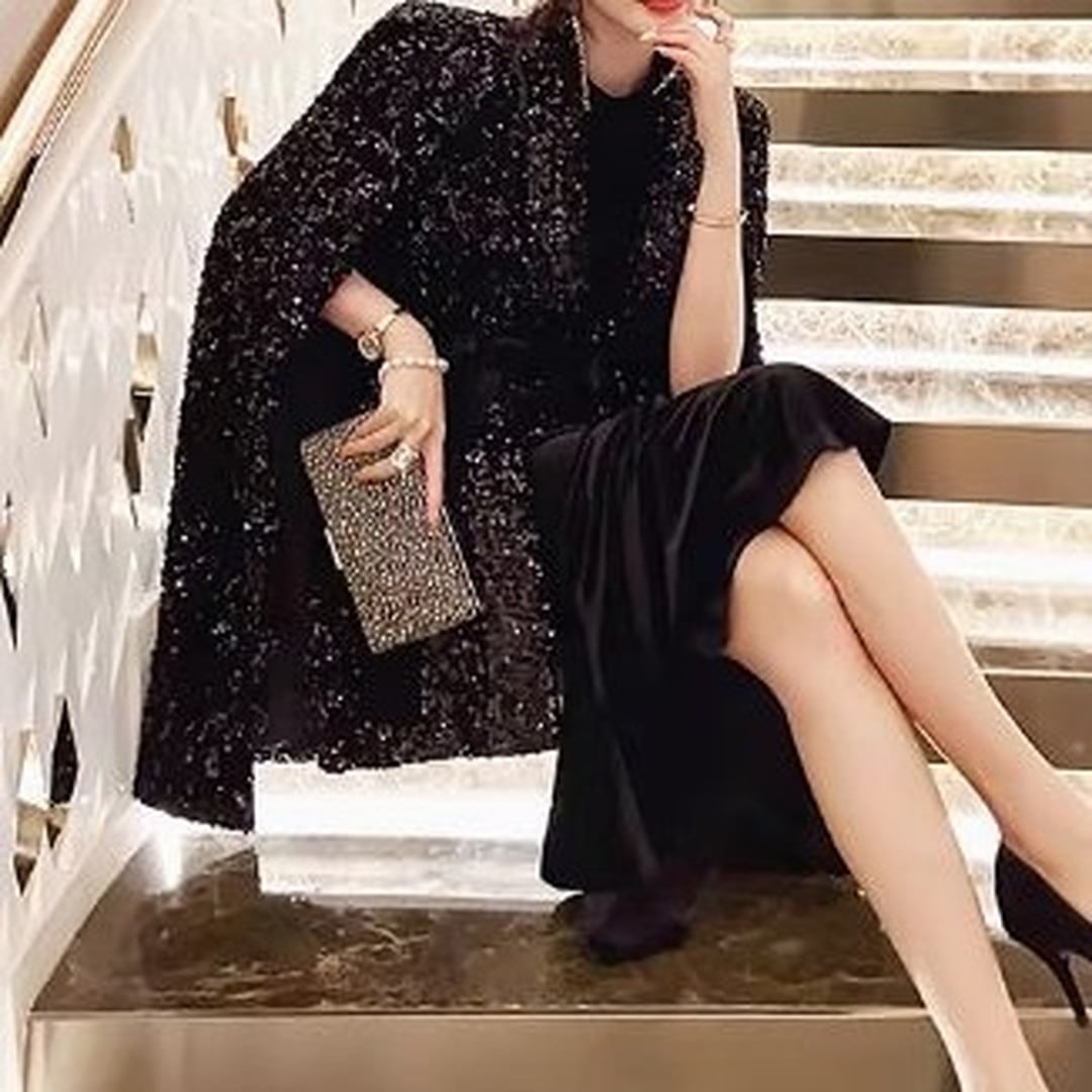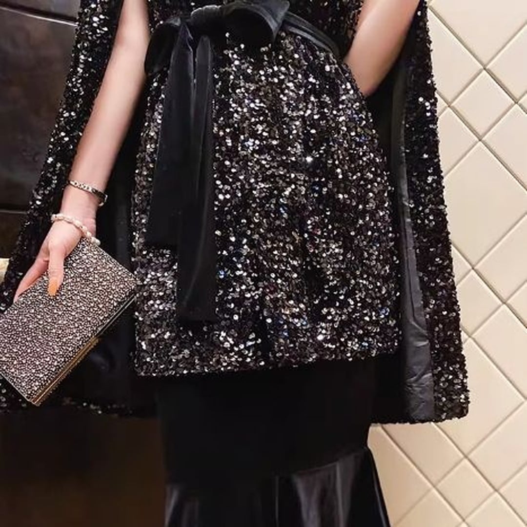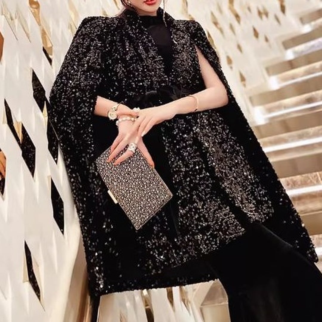 煌びやかなスパンコールが目を引くケープジャケット。ヒップレングス丈で、スタイルアップ効果も期待できます。付属のベルトでウエストマークすれば、よりフェミニンな印象に。パーティーシーンはもちろん、普段使いのコーディネートにプラスして、華やかさを演出するのもおすすめです。