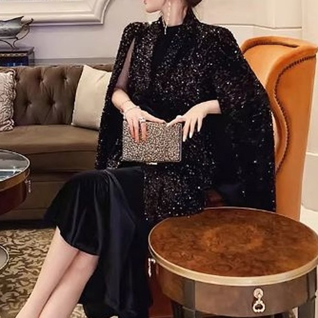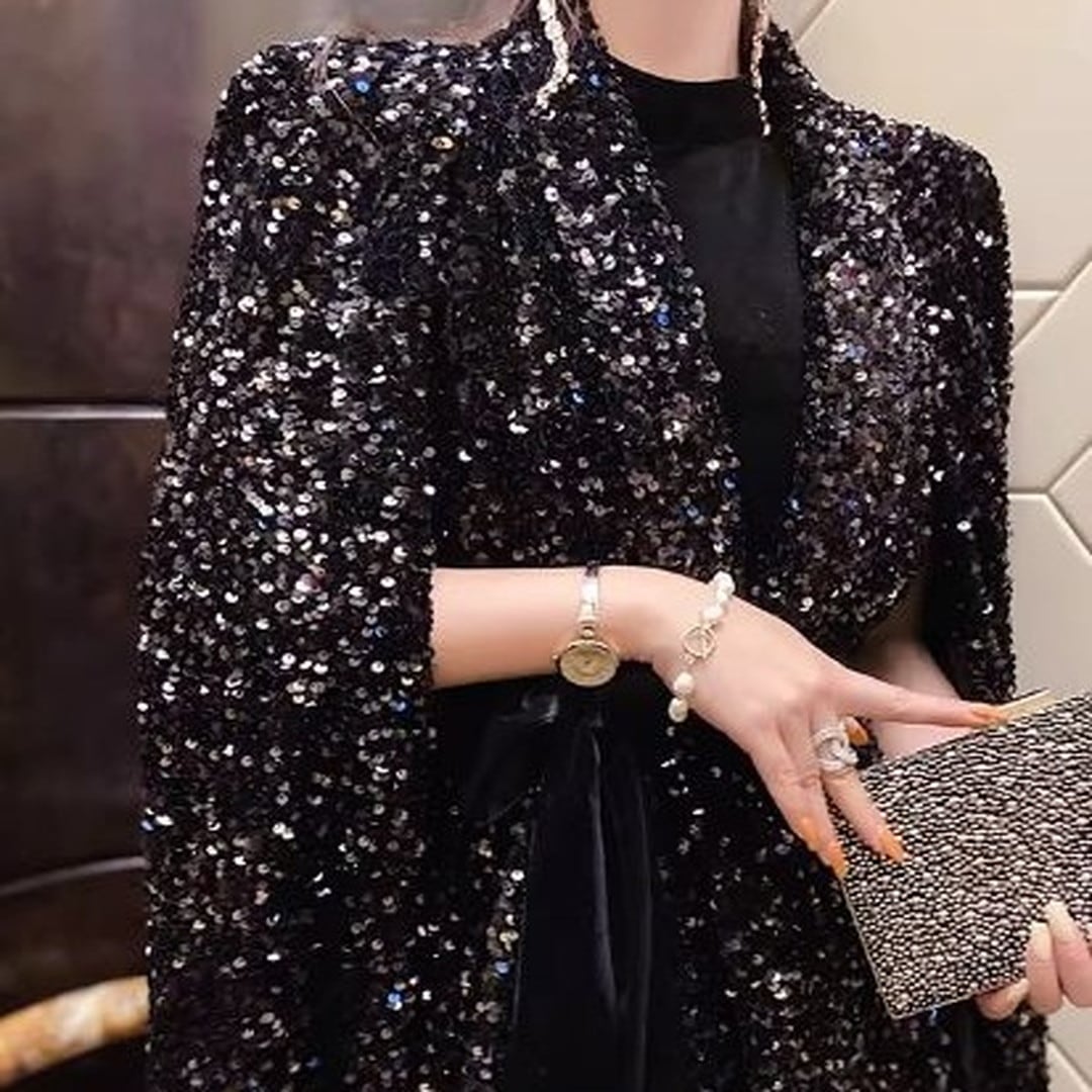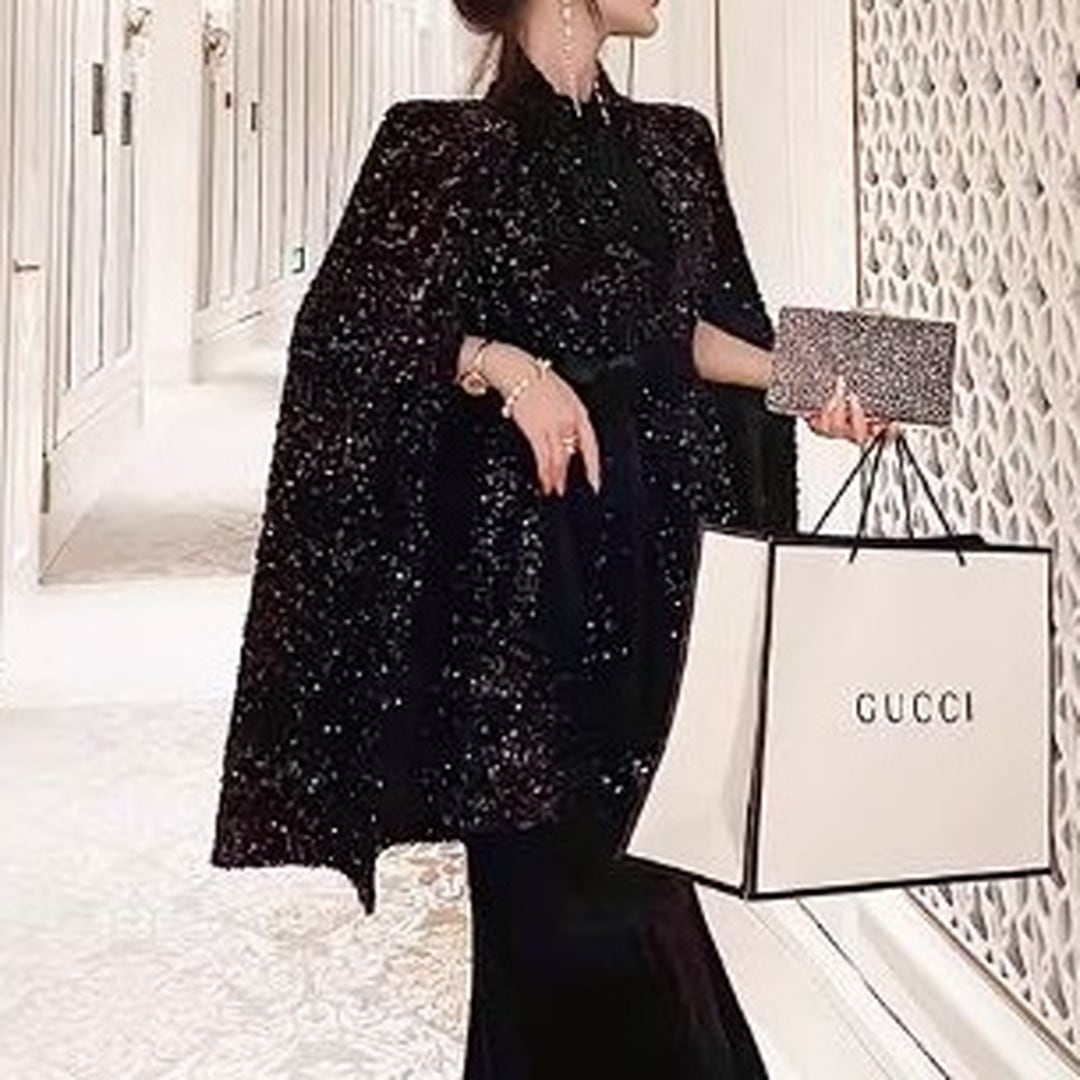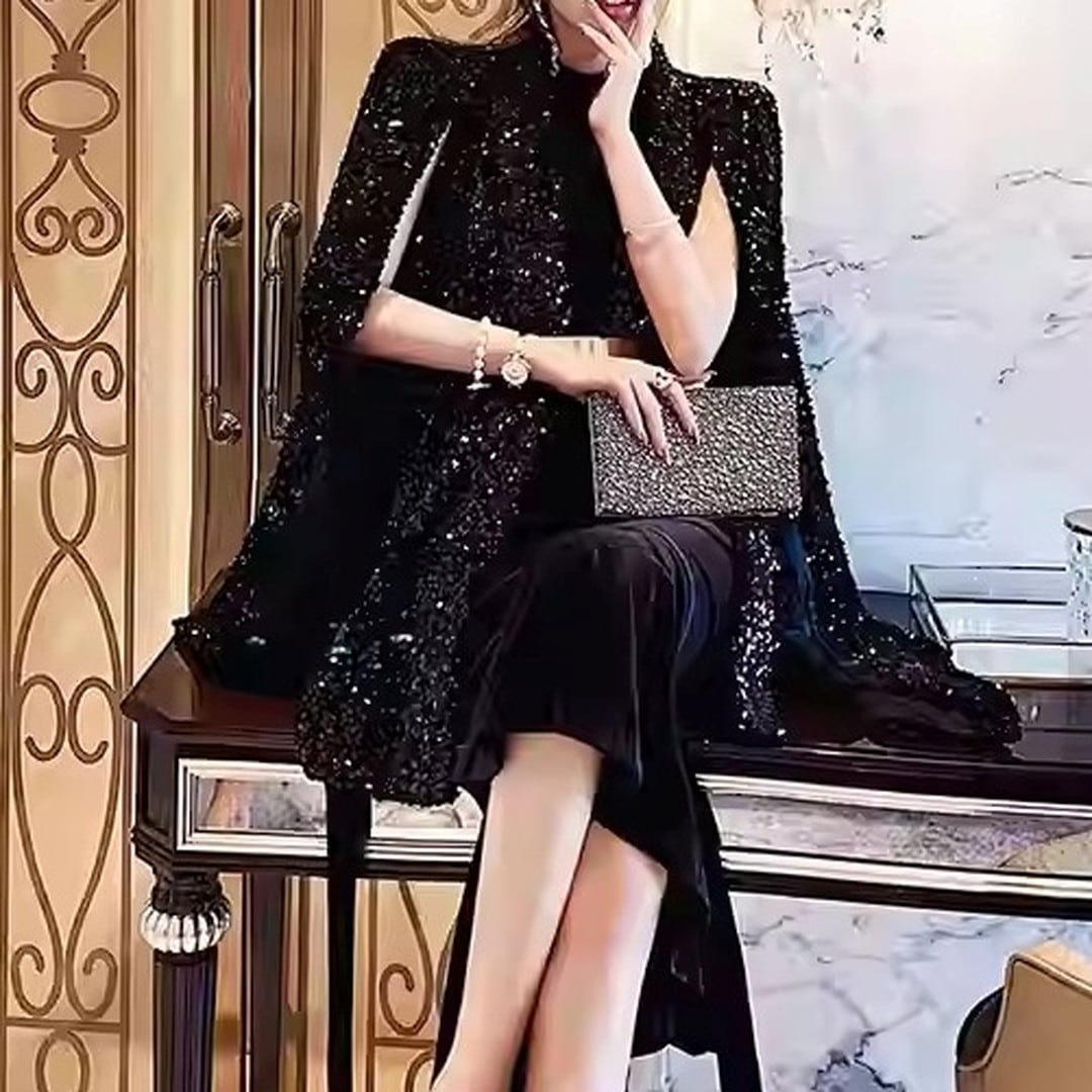 煌びやかなスパンコールが目を引くケープジャケット。ヒップレングス丈で、スタイルアップ効果も期待できます。付属のベルトでウエストマークすれば、よりフェミニンな印象に。パーティーシーンはもちろん、普段使いのコーディネートにプラスして、華やかさを演出するのもおすすめです。