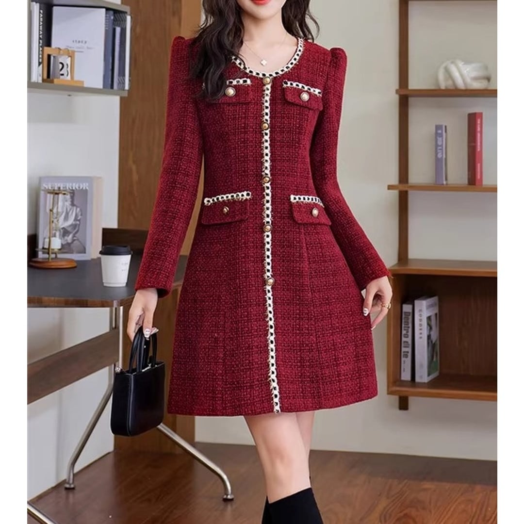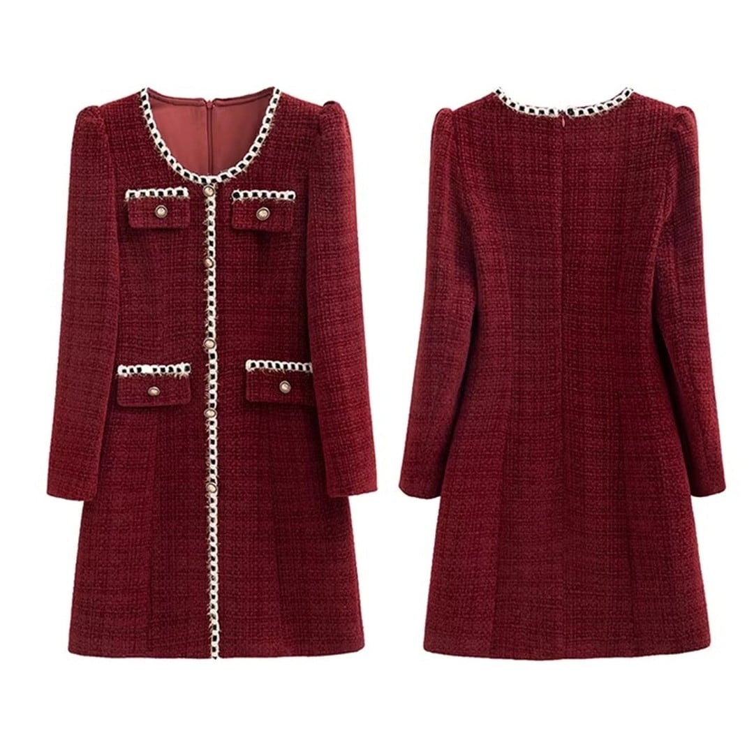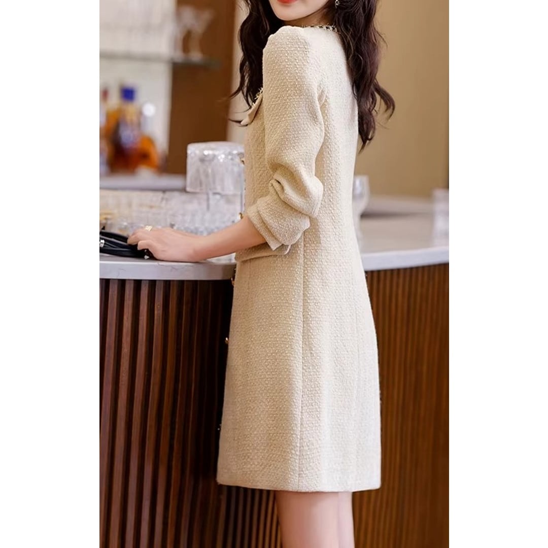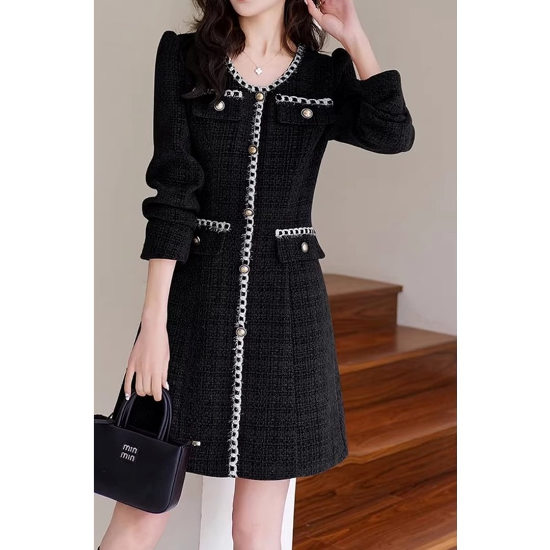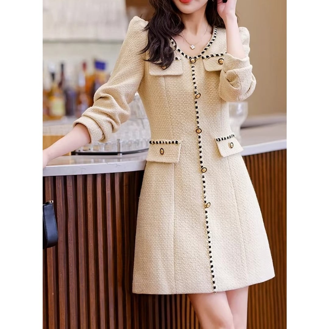 上品な印象を与えるミニ丈の長袖ワンピース。フロントボタンとツイード調のデザインが特徴です。ちょっとしたお出かけや、普段使いにもおすすめです。アクセサリーやバッグを合わせることで、さらに華やかな印象になります。