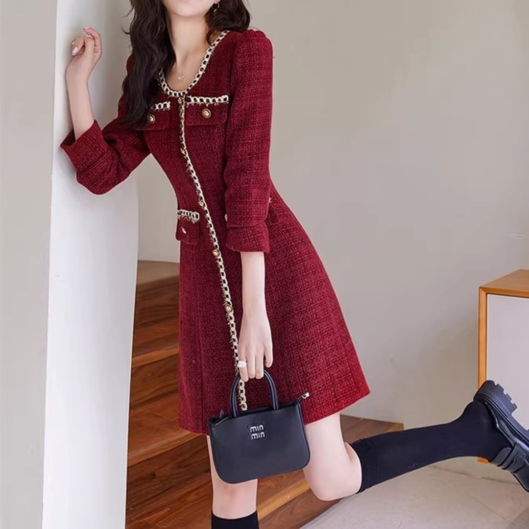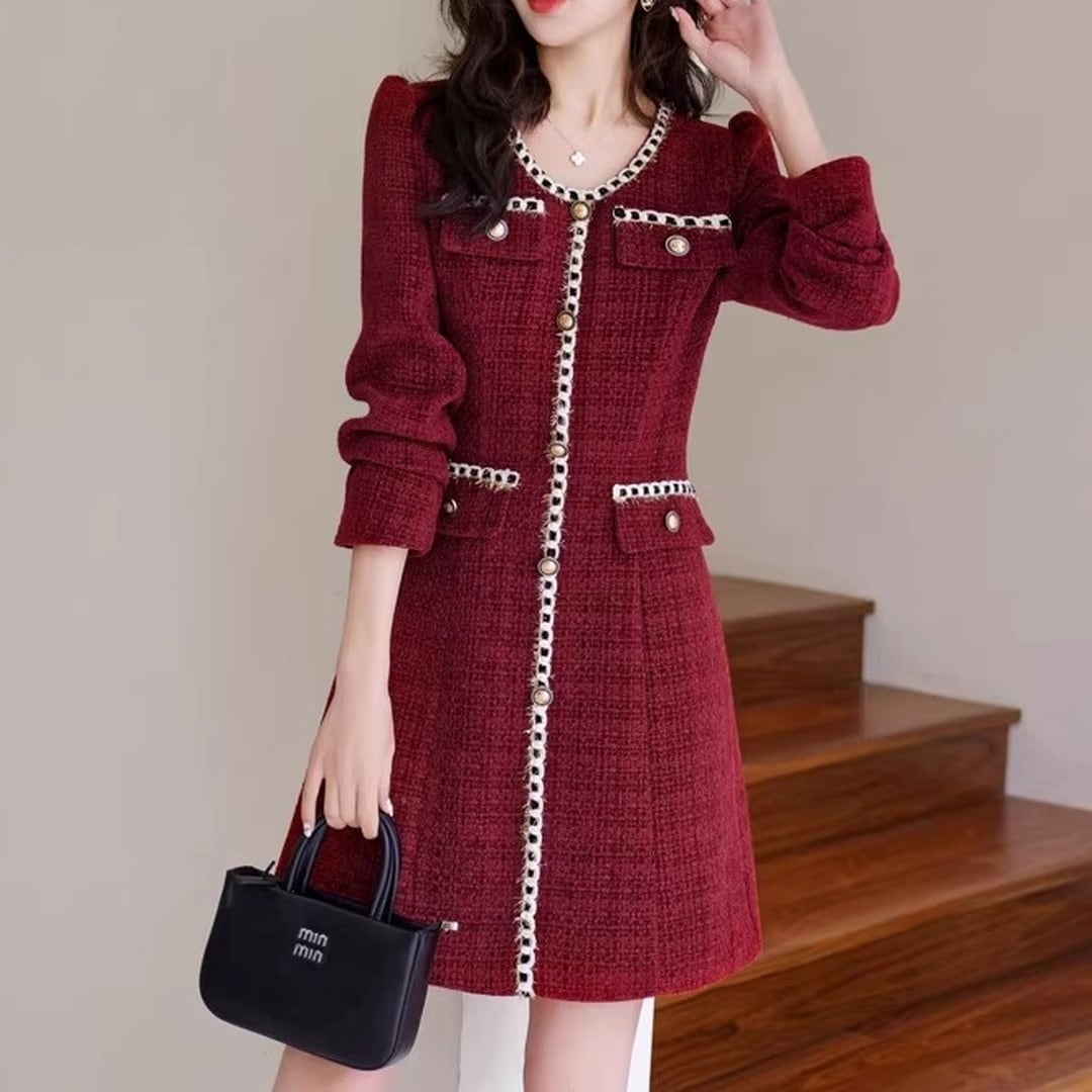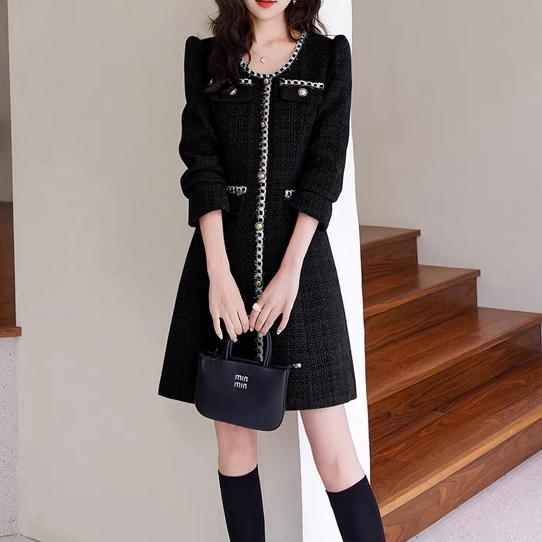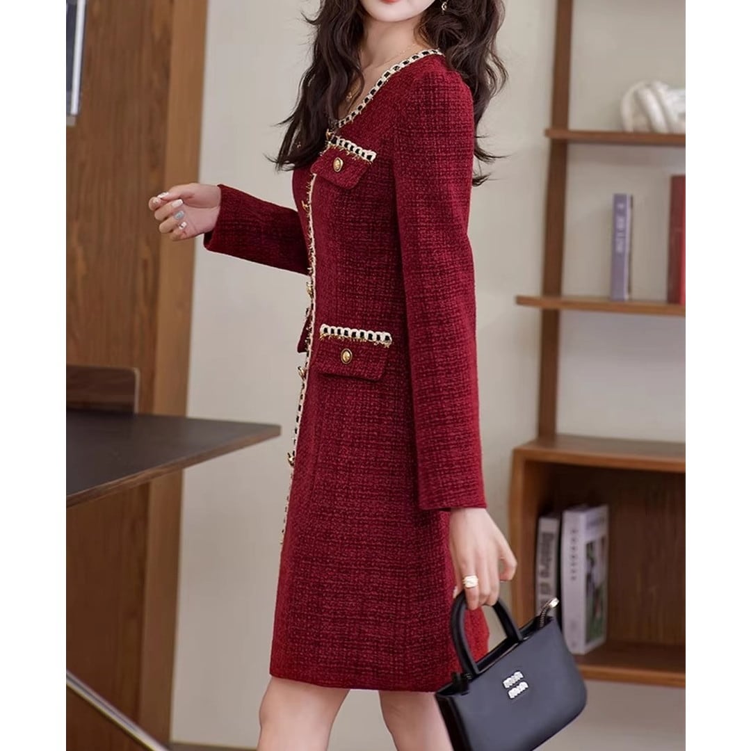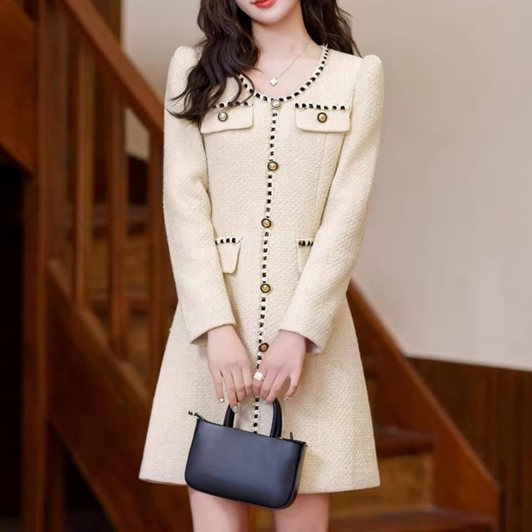 上品な印象を与えるミニ丈の長袖ワンピース。フロントボタンとツイード調のデザインが特徴です。ちょっとしたお出かけや、普段使いにもおすすめです。アクセサリーやバッグを合わせることで、さらに華やかな印象になります。