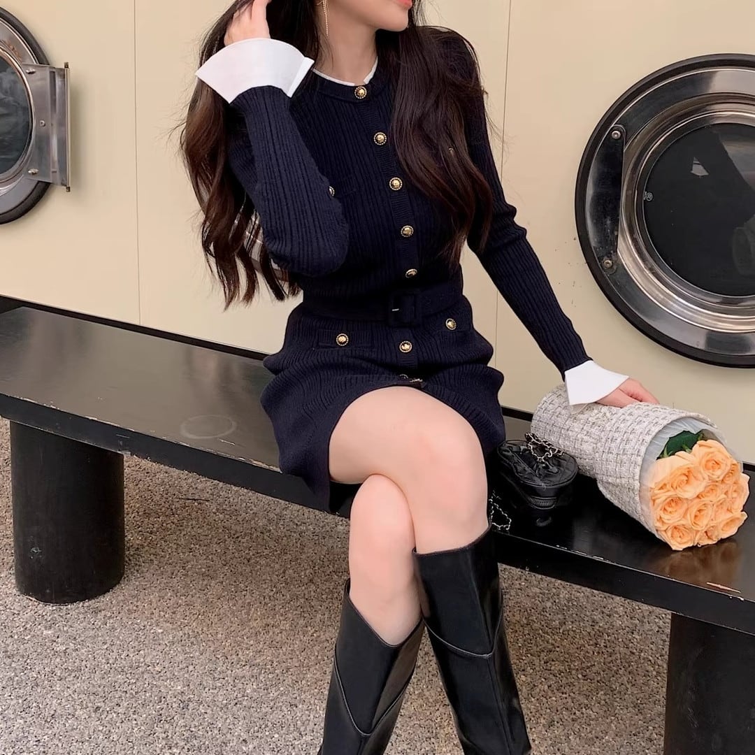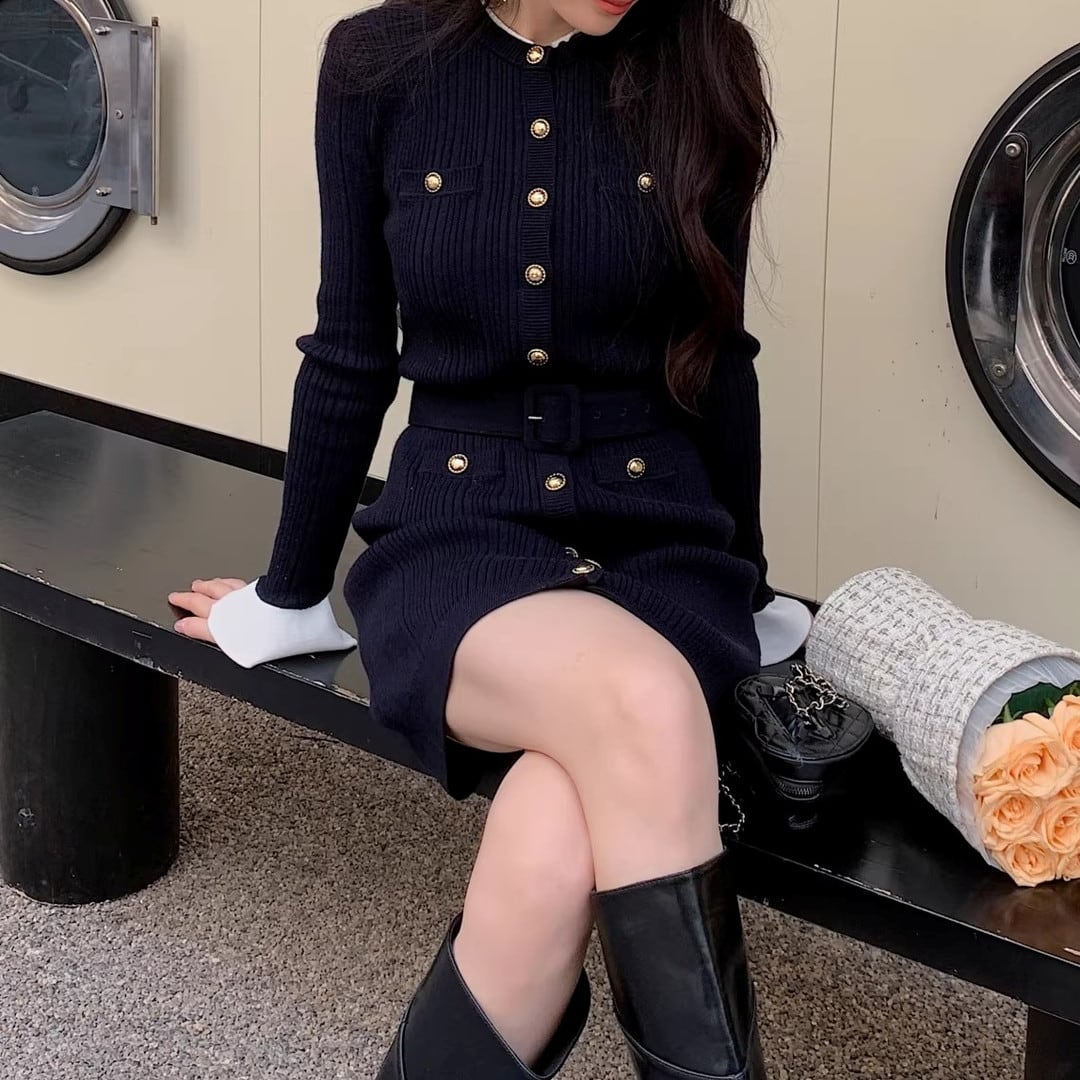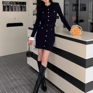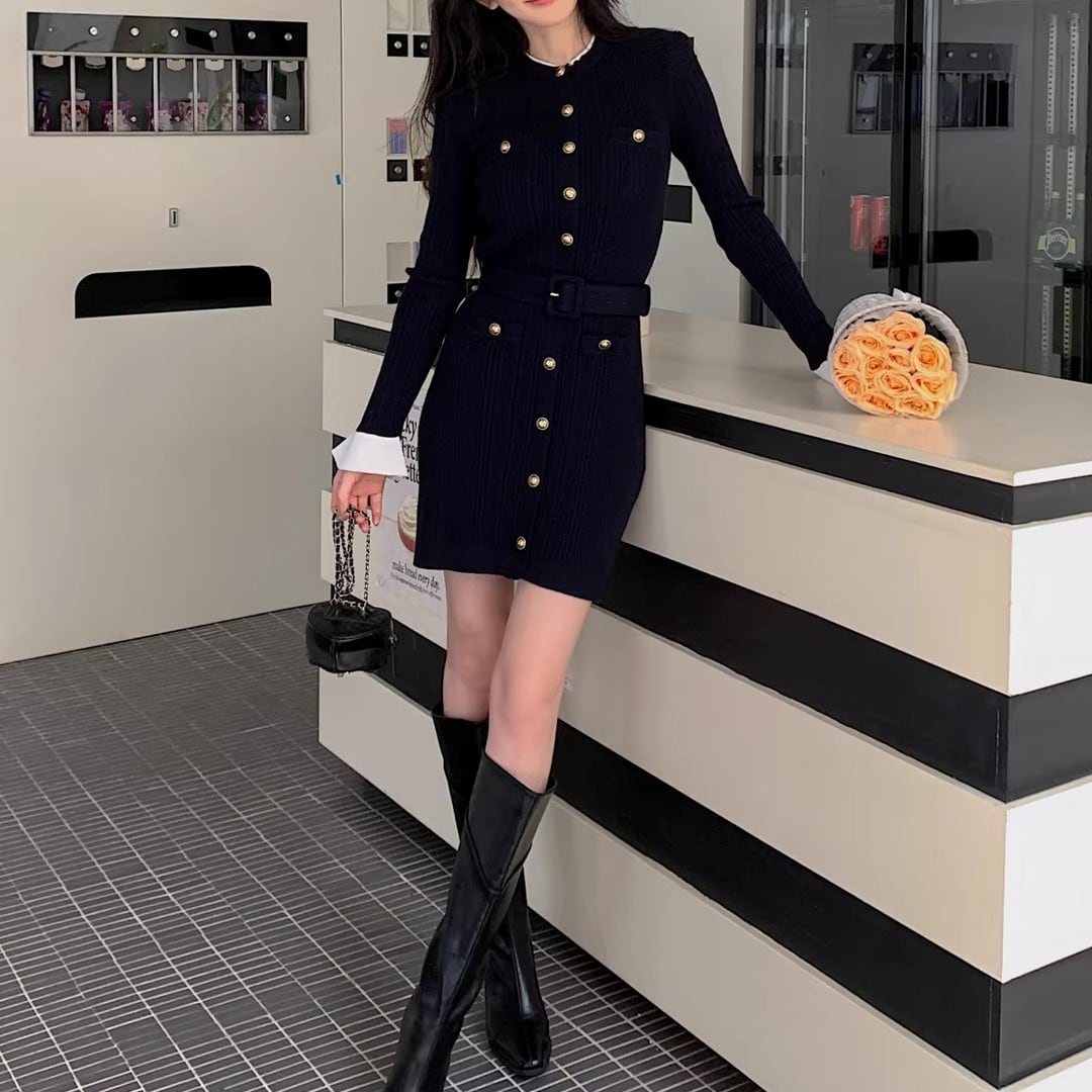 長袖のミニニットドレスで、洗練されたスタイルを演出。ウエストベルトがシルエットを美しく引き締め、スタイルアップ効果も期待できます。ちょっとしたお出かけから、特別な日の装いまで、幅広く活躍する一着です。