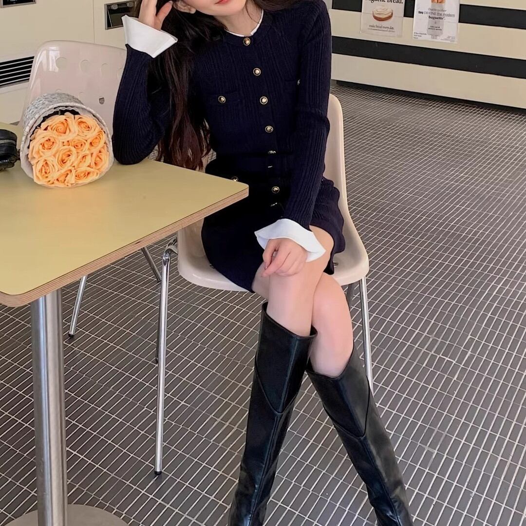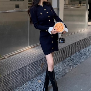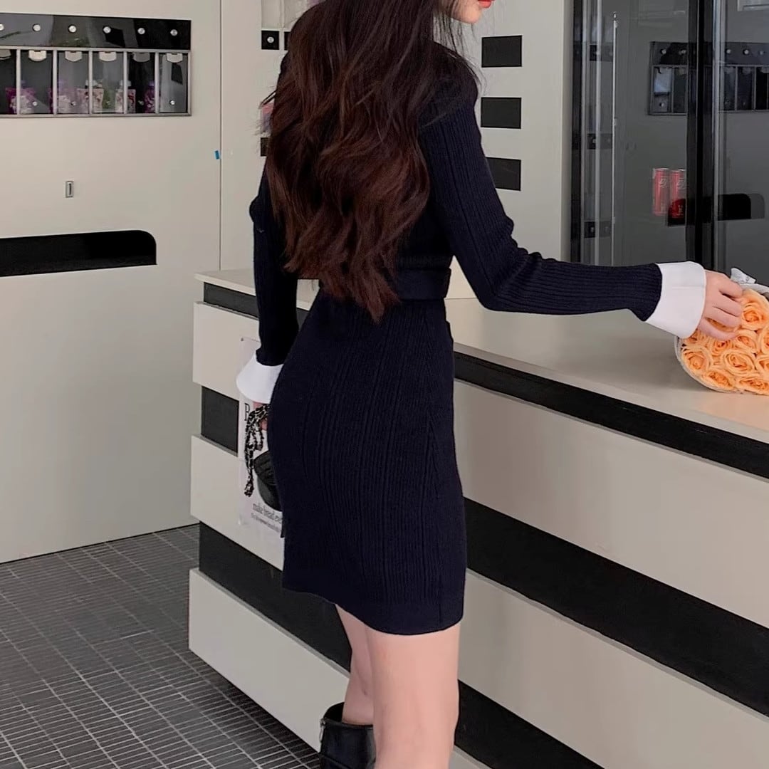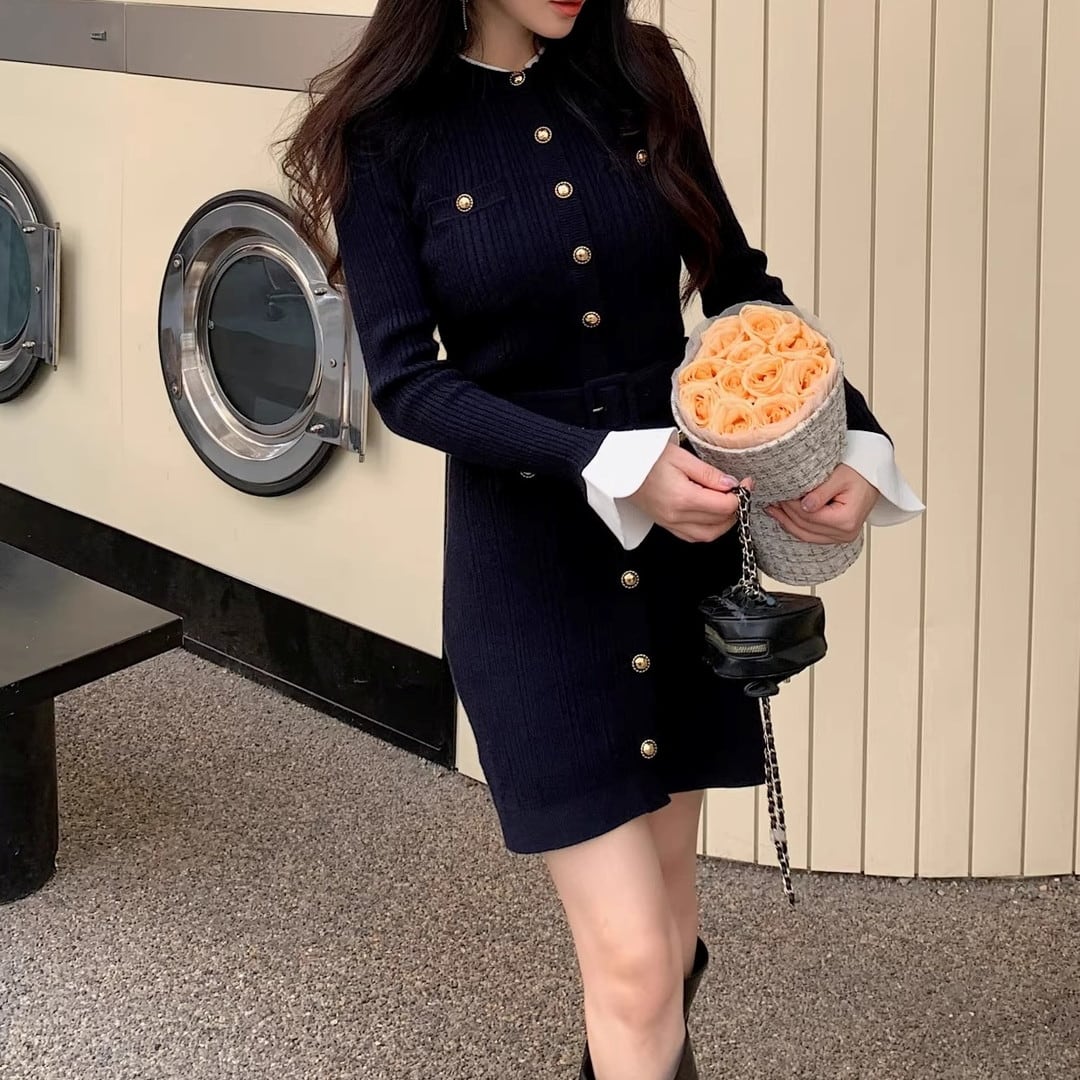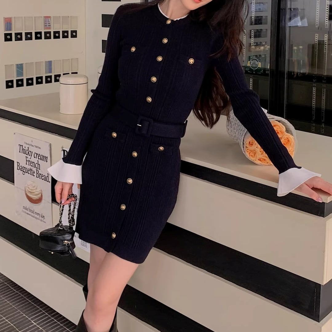 長袖のミニニットドレスで、洗練されたスタイルを演出。ウエストベルトがシルエットを美しく引き締め、スタイルアップ効果も期待できます。ちょっとしたお出かけから、特別な日の装いまで、幅広く活躍する一着です。