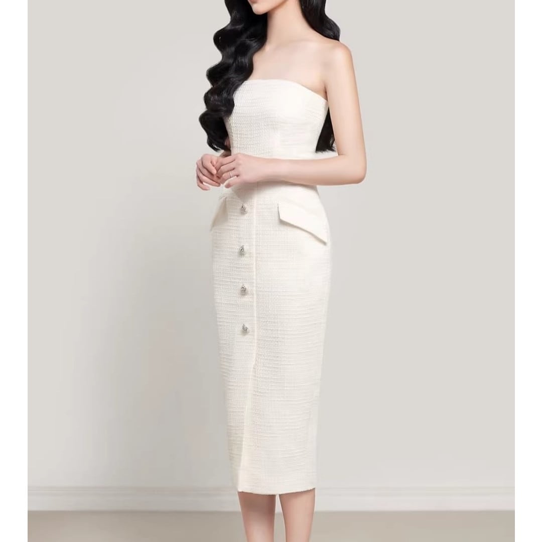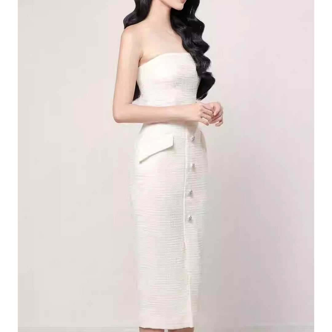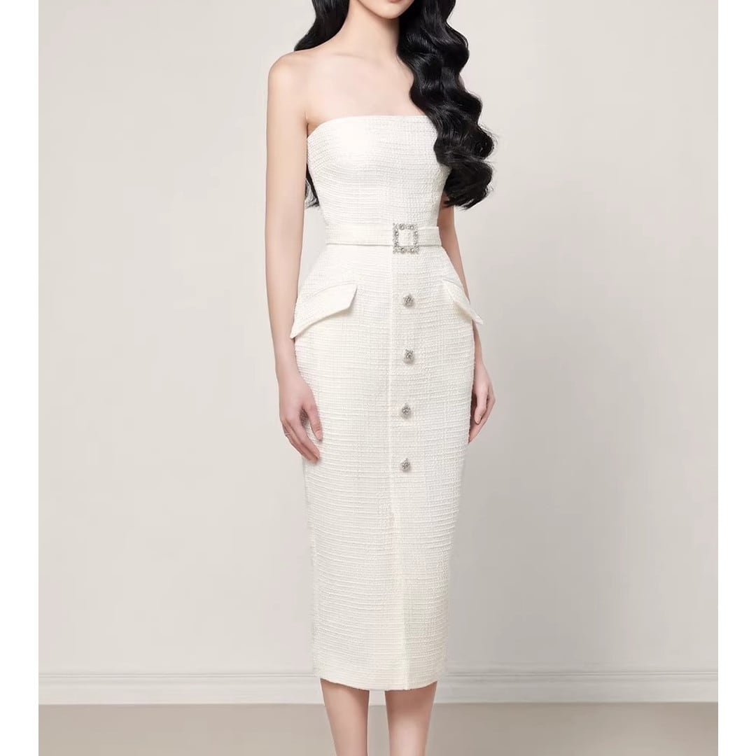 大人の女性らしさを演出する、ミディ丈のチューブトップドレス。付属のベルトでウエストマークすることで、より美しいシルエットを際立たせます。ちょっとしたお出かけから、特別な日の装いまで、幅広いシーンで活躍します。フロントボタンがアクセントとなり、上品な印象を与えます。