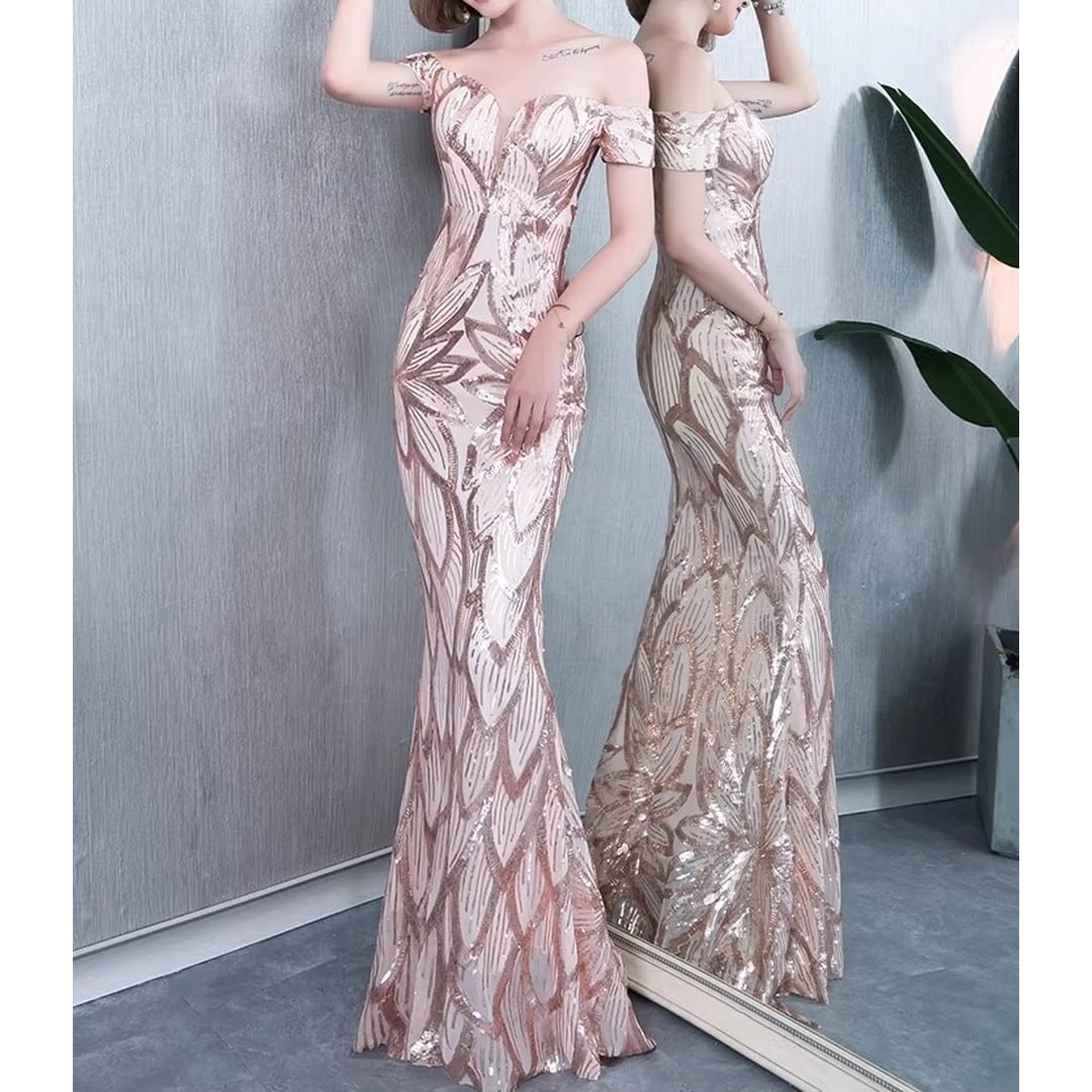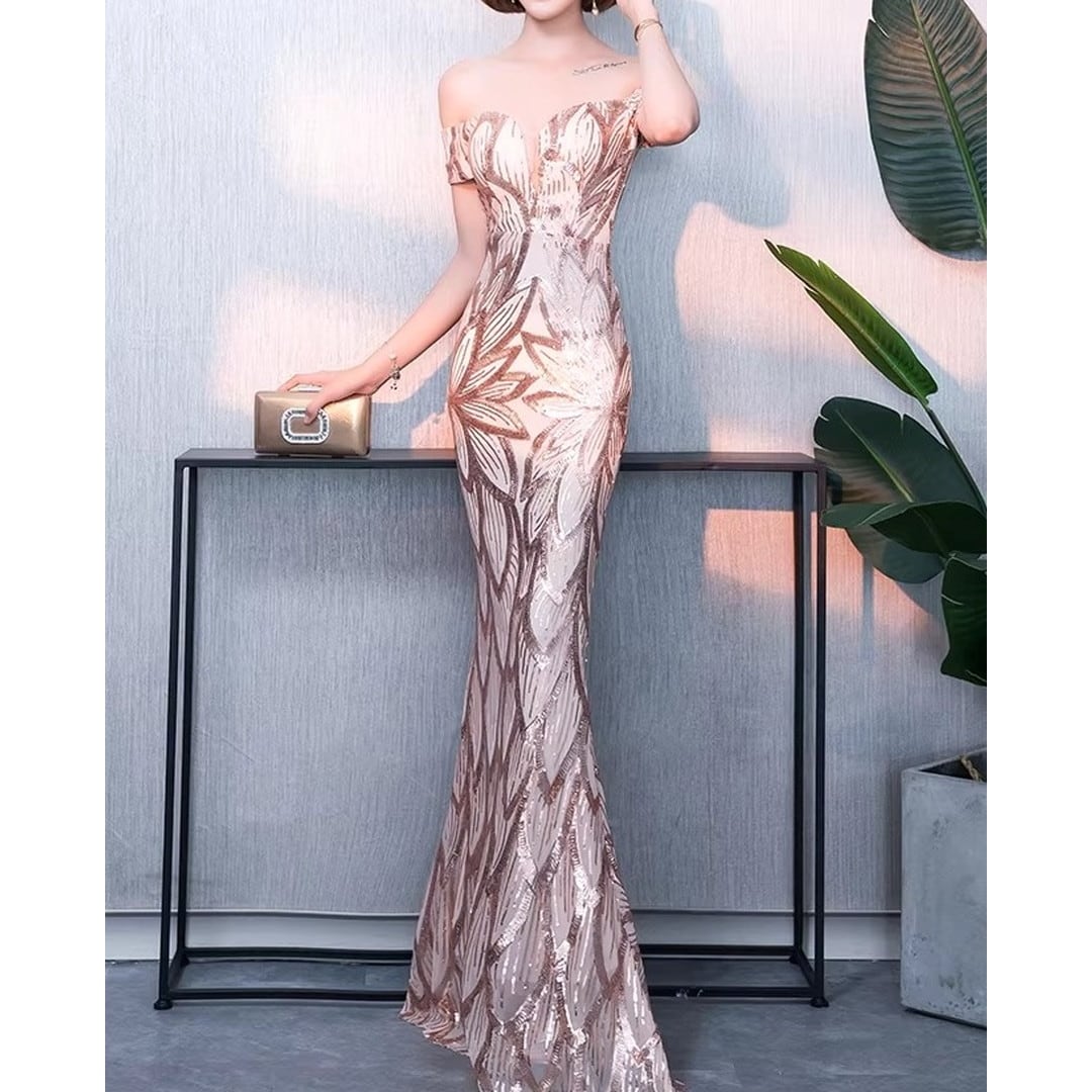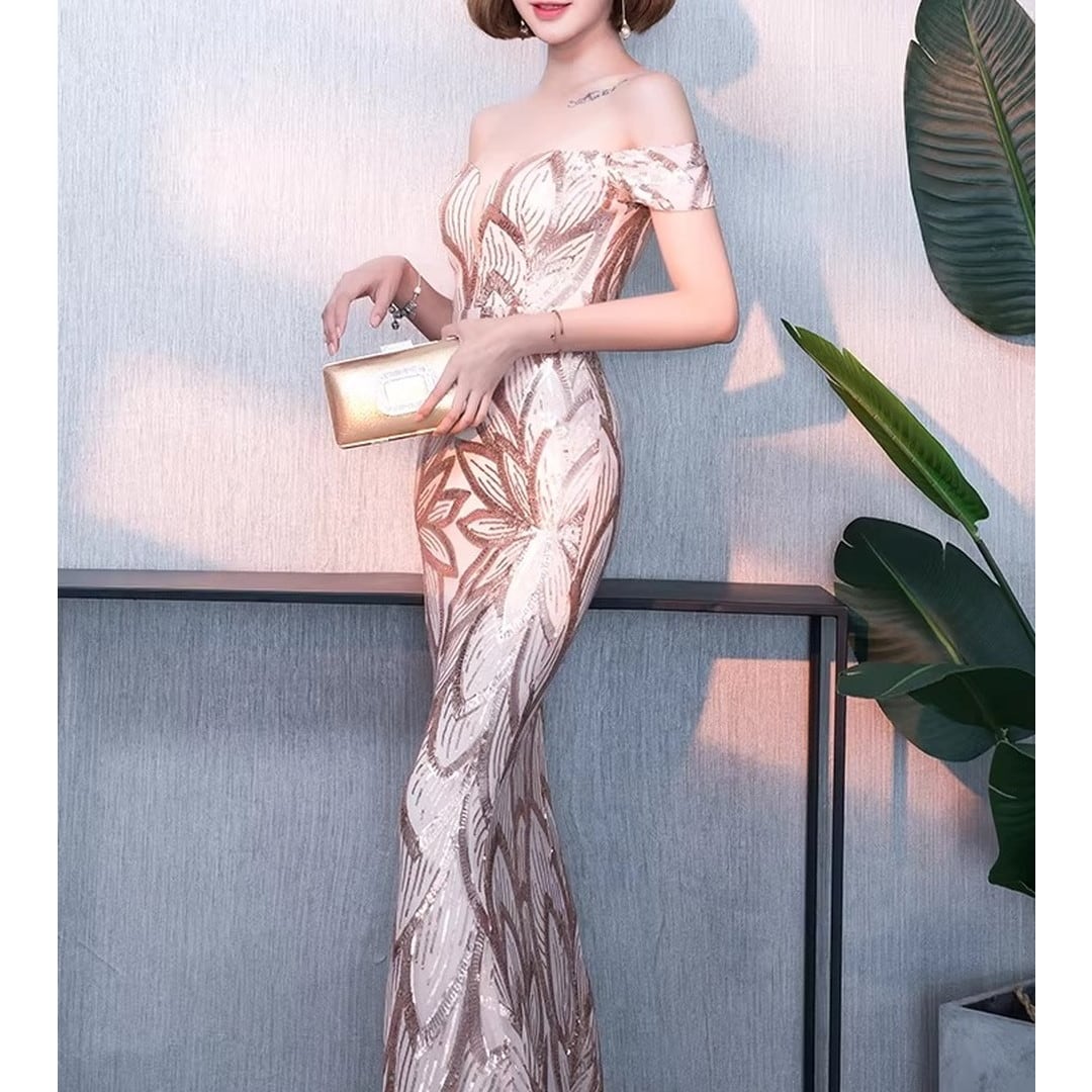 オフショルダーデザインがデコルテを美しく演出し、女性らしい魅力を引き立てます。パーティーや特別なイベントで、周囲の視線を惹きつけることでしょう。マーメイドラインがボディラインに沿って美しく広がり、優雅なシルエットを創り出します。