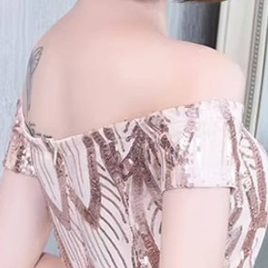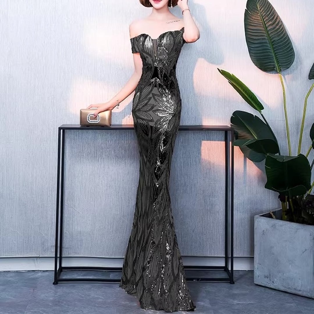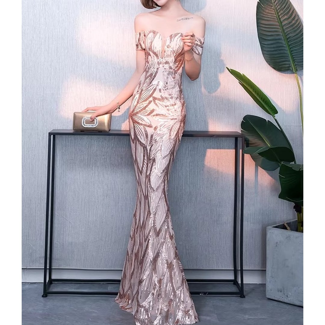 オフショルダーデザインがデコルテを美しく演出し、女性らしい魅力を引き立てます。パーティーや特別なイベントで、周囲の視線を惹きつけることでしょう。マーメイドラインがボディラインに沿って美しく広がり、優雅なシルエットを創り出します。