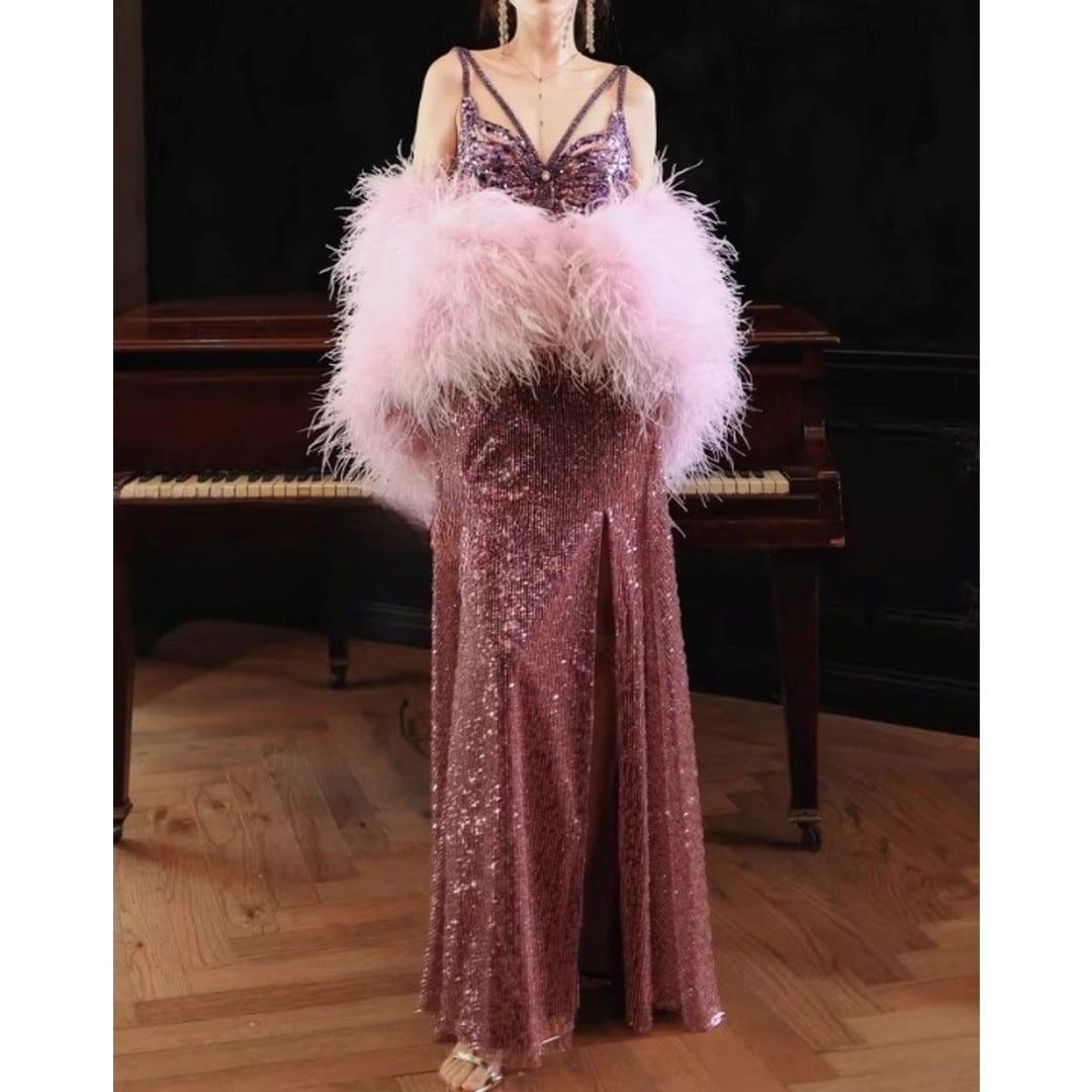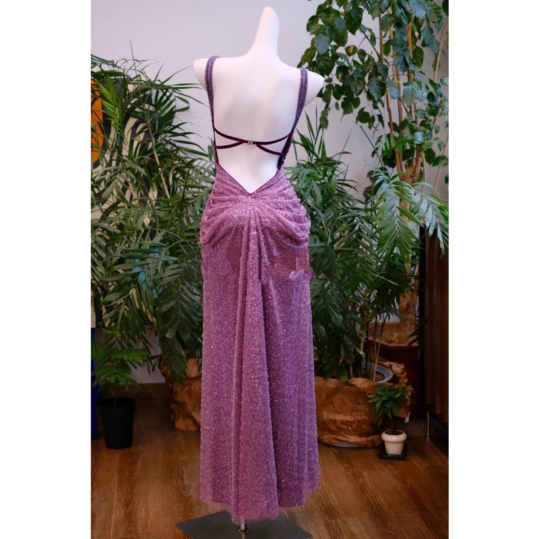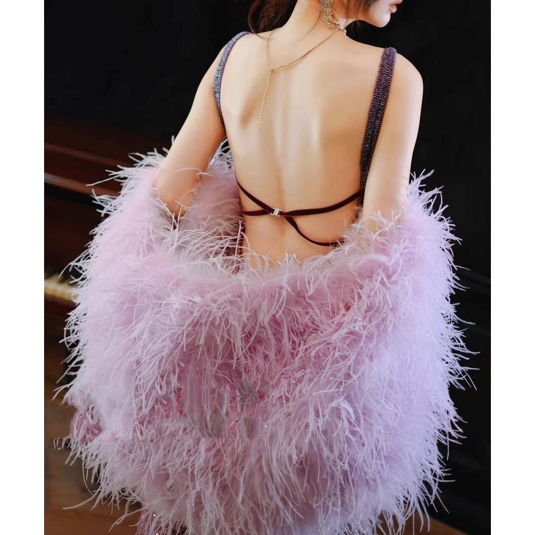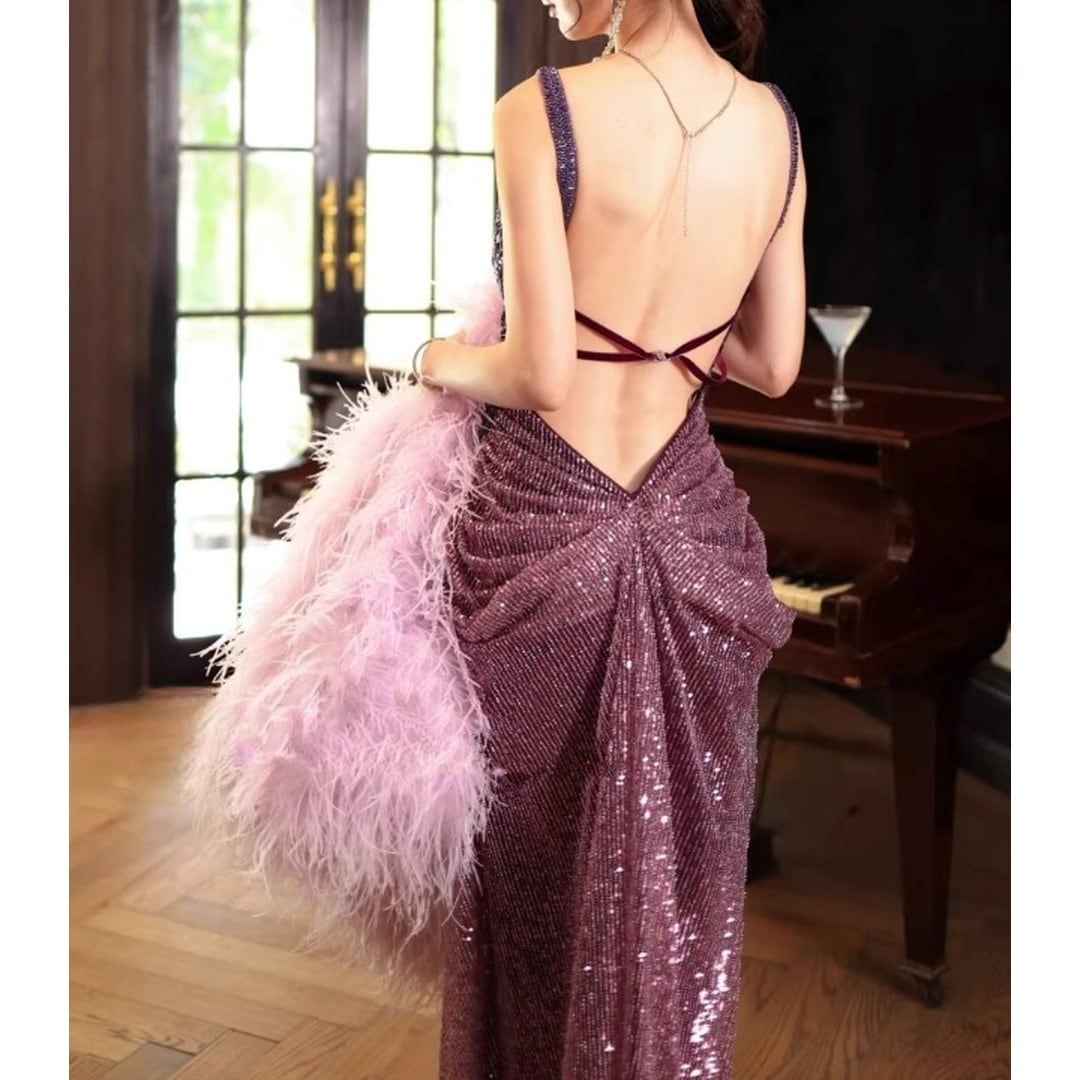 背中の開いたデザインが魅力的なマキシ丈ドレス。ストラップのデザインがアクセントとなり、より一層エレガントな印象を与えます。特別な日の装いや、パーティーシーンにおすすめです。