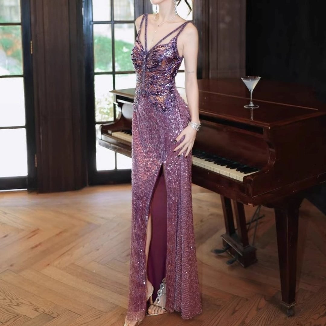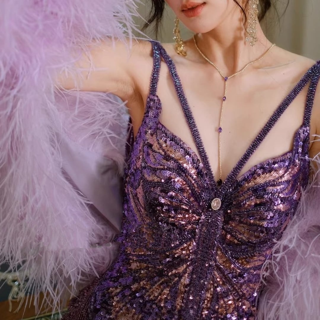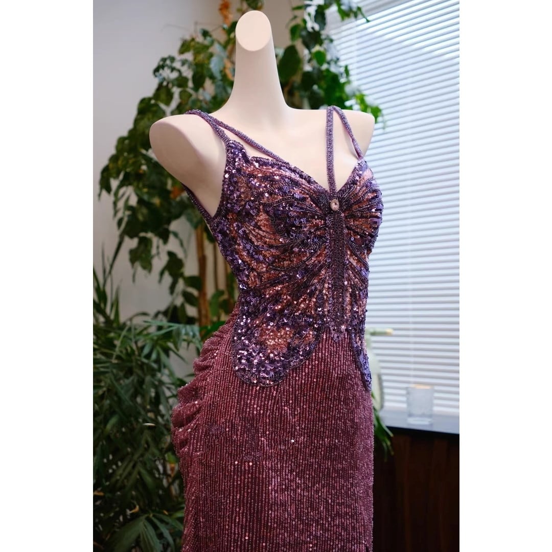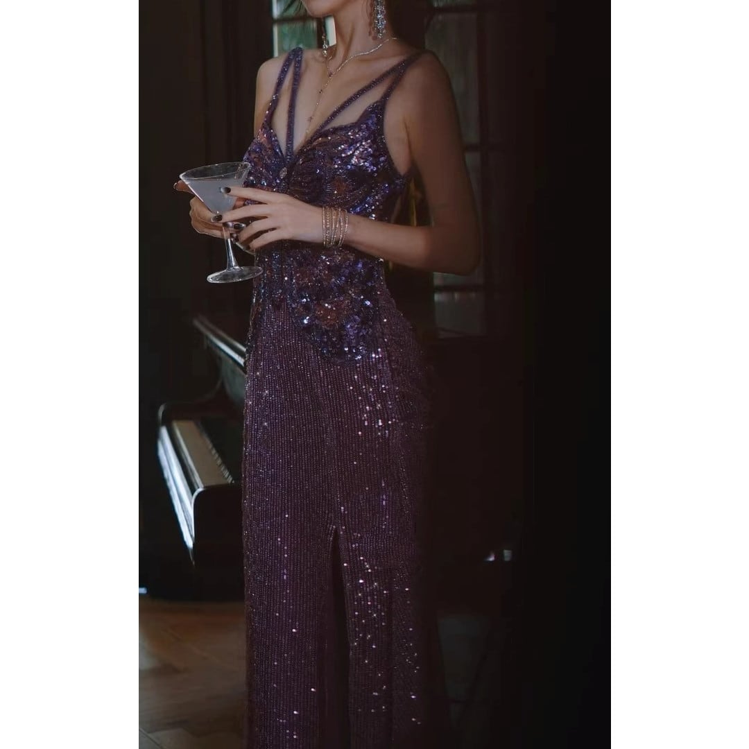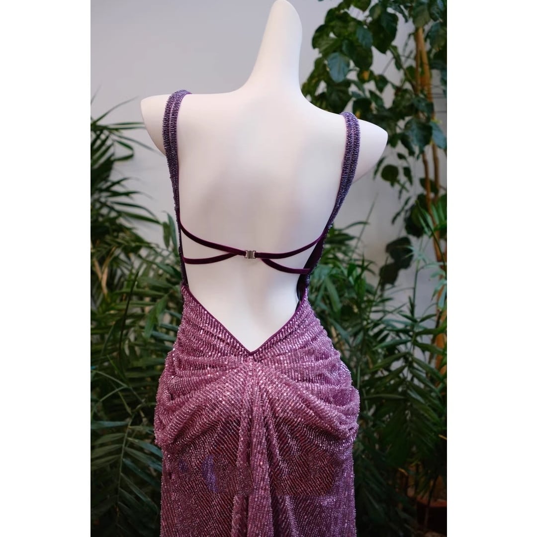 背中の開いたデザインが魅力的なマキシ丈ドレス。ストラップのデザインがアクセントとなり、より一層エレガントな印象を与えます。特別な日の装いや、パーティーシーンにおすすめです。
