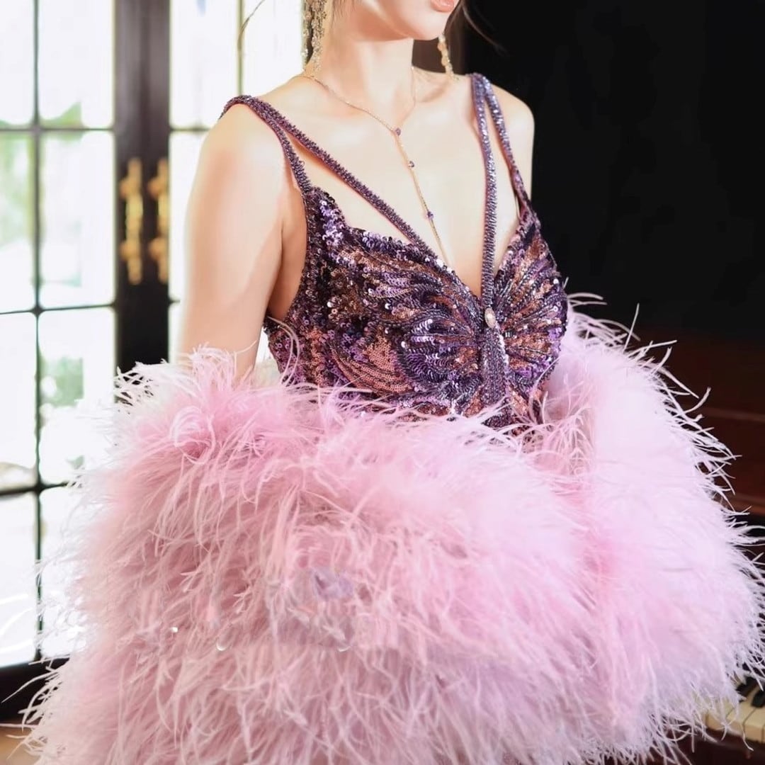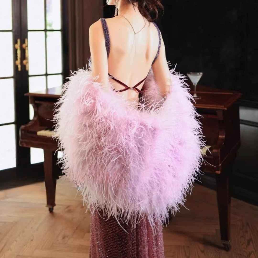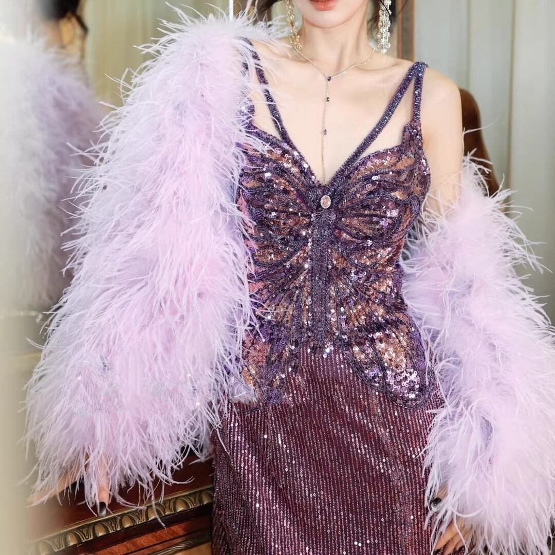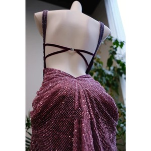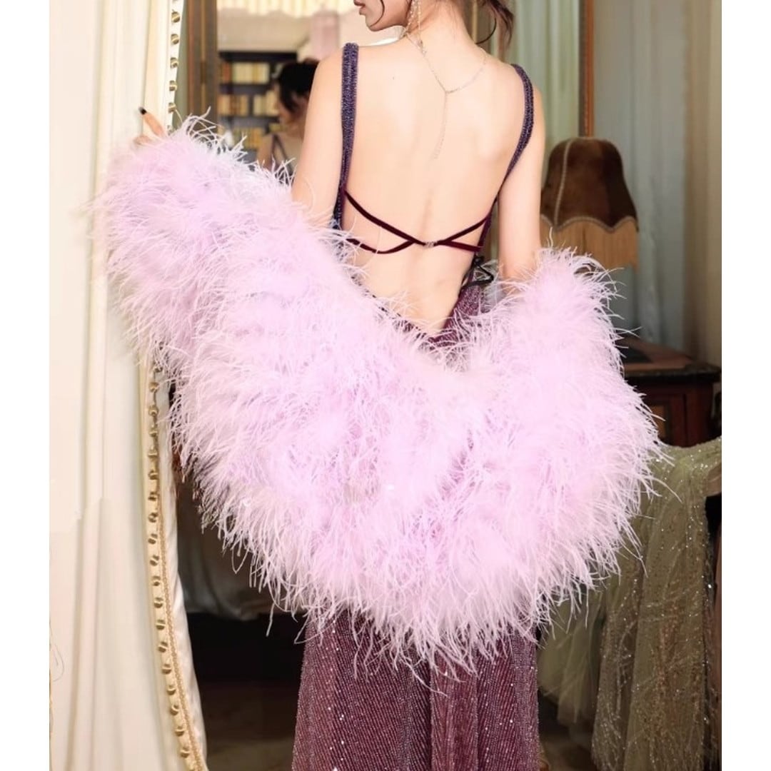 背中の開いたデザインが魅力的なマキシ丈ドレス。ストラップのデザインがアクセントとなり、より一層エレガントな印象を与えます。特別な日の装いや、パーティーシーンにおすすめです。