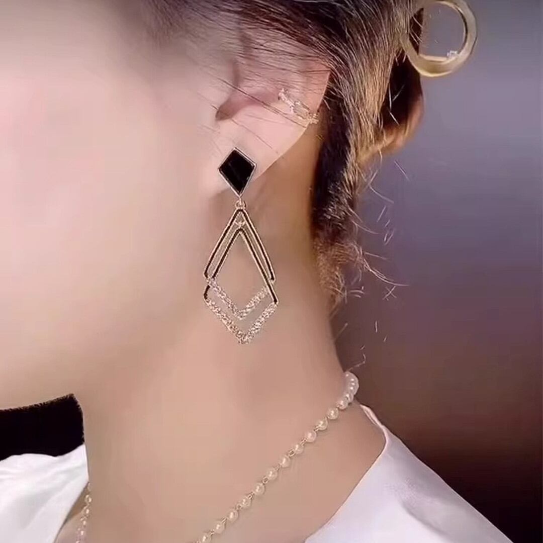 目を引くドロップ型のシルエットが魅力的なイヤリング。耳元で揺れるたびに、繊細なラインストーンの輝きが上品さをプラスします。普段使いはもちろん、パーティーシーンなど華やかな装いにもおすすめです。