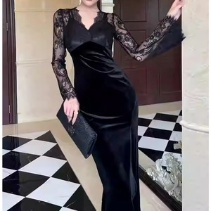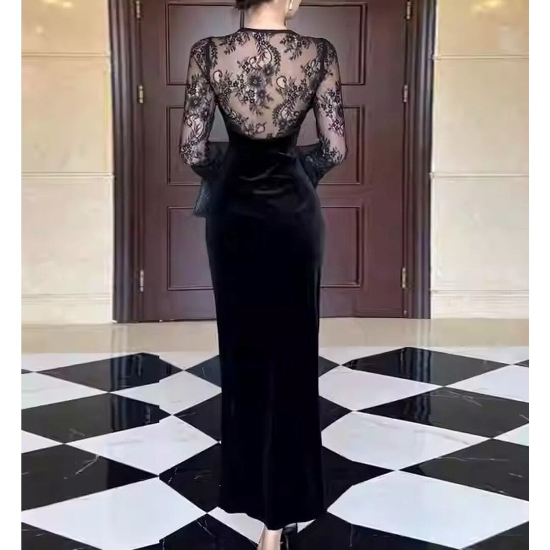 レースとスリットがエレガントな印象を演出するマキシドレス。長袖デザインで、上品な肌見せが可能です。特別な日のディナーやパーティーなど、華やかなシーンに最適です。