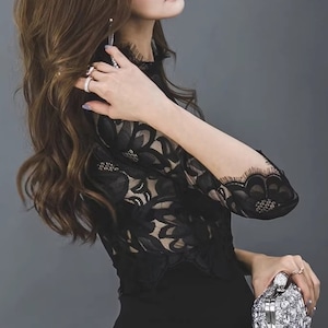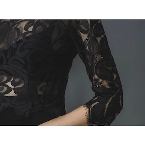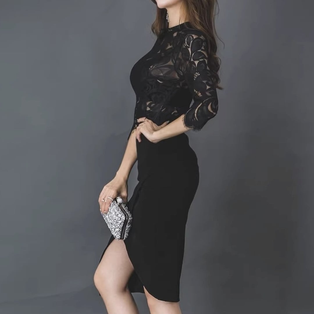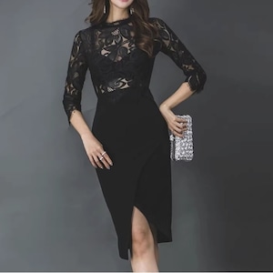 エレガントな雰囲気を演出するミディ丈のタイトドレス。繊細なレースをあしらった長袖のデザインが、上品さを際立たせます。パーティや特別な日の装いにはもちろん、アクセサリーや小物次第で様々なシーンで活躍します。シルエットの美しさを引き立て、女性らしい魅力を最大限に引き出してくれる一着です。