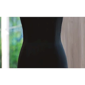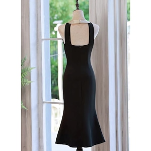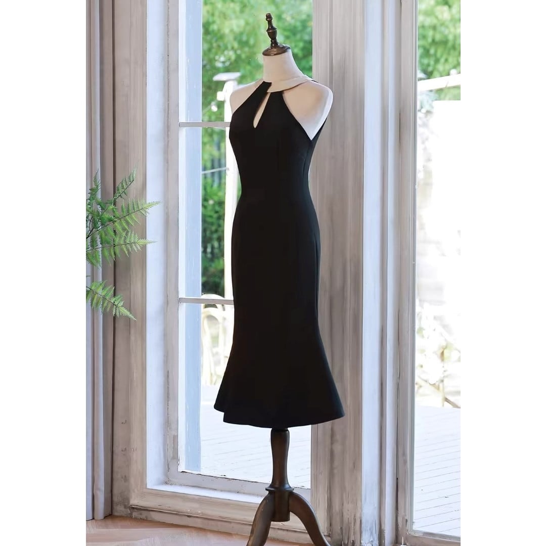 ホルターネックデザインが目を引くミディ丈のマーメイドドレス。首元を美しく見せ、洗練された印象を与えます。程よくボディラインに沿うシルエットが女性らしさを引き立て、裾のマーメイドラインが動きのあるエレガントな雰囲気を演出。パーティーシーンや特別な日に、上品な大人の魅力を引き出す一着です。
