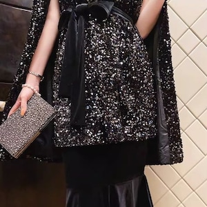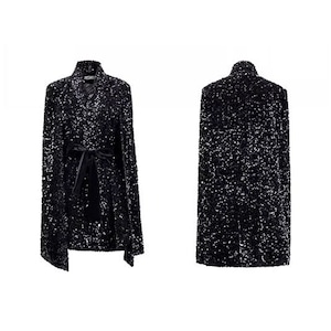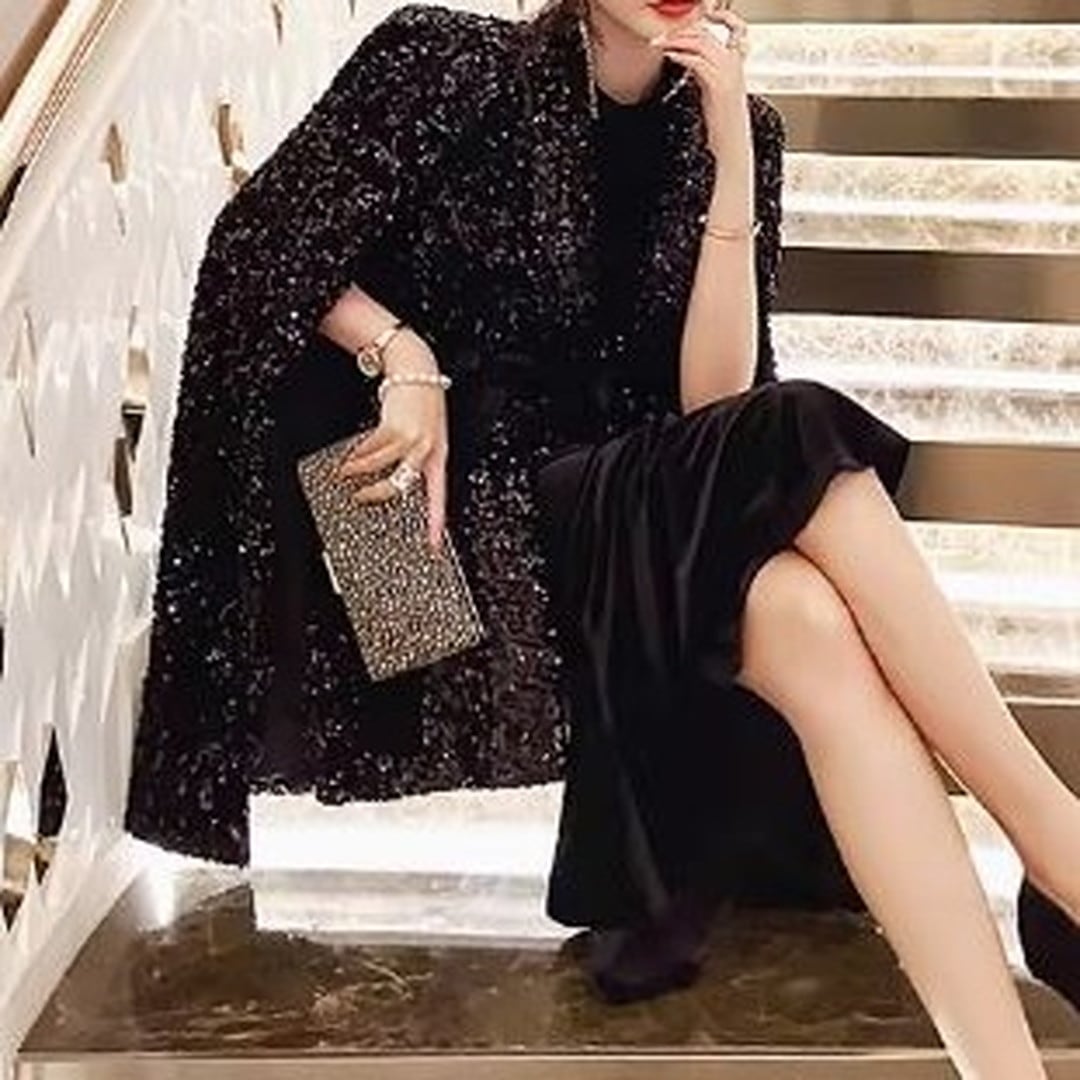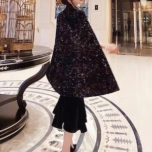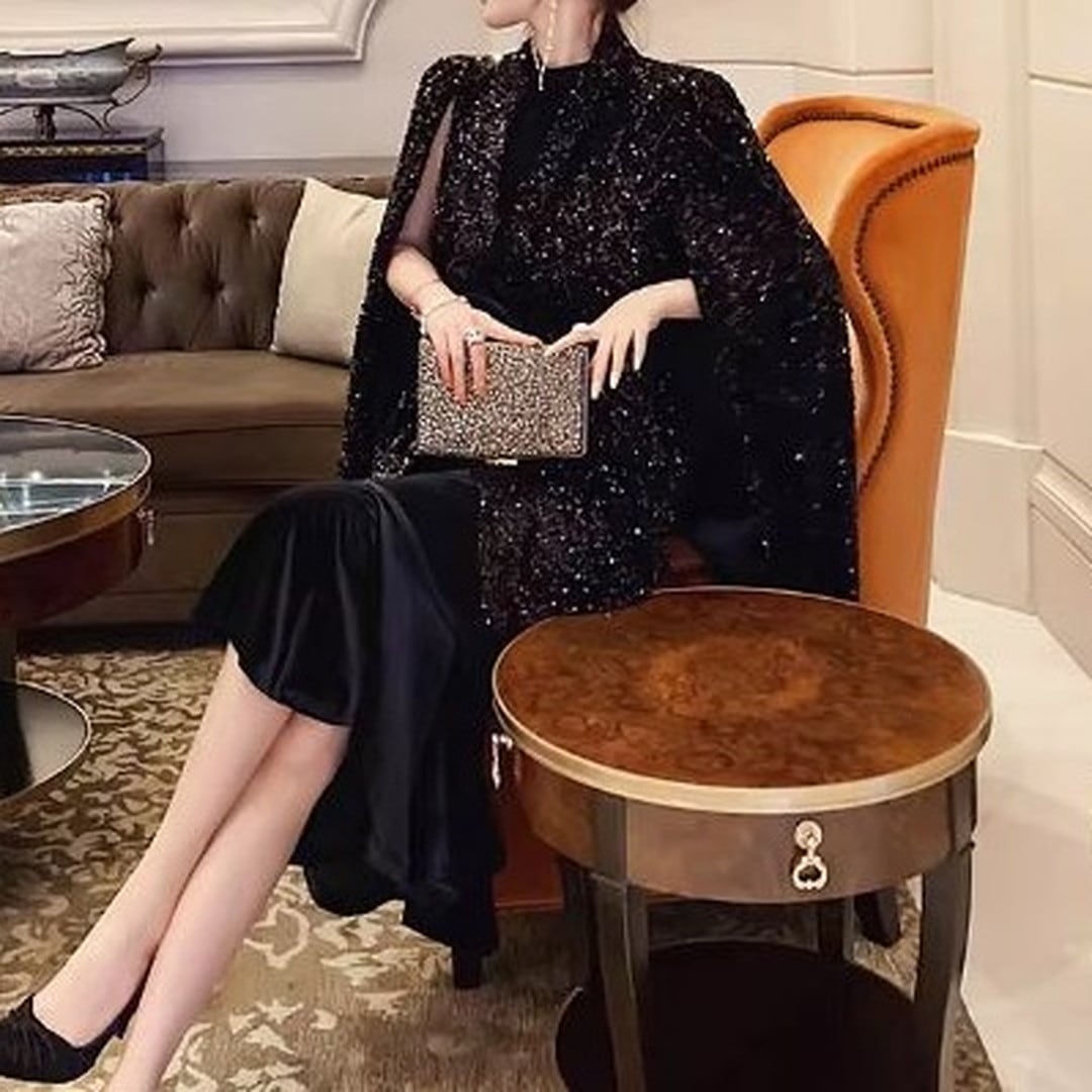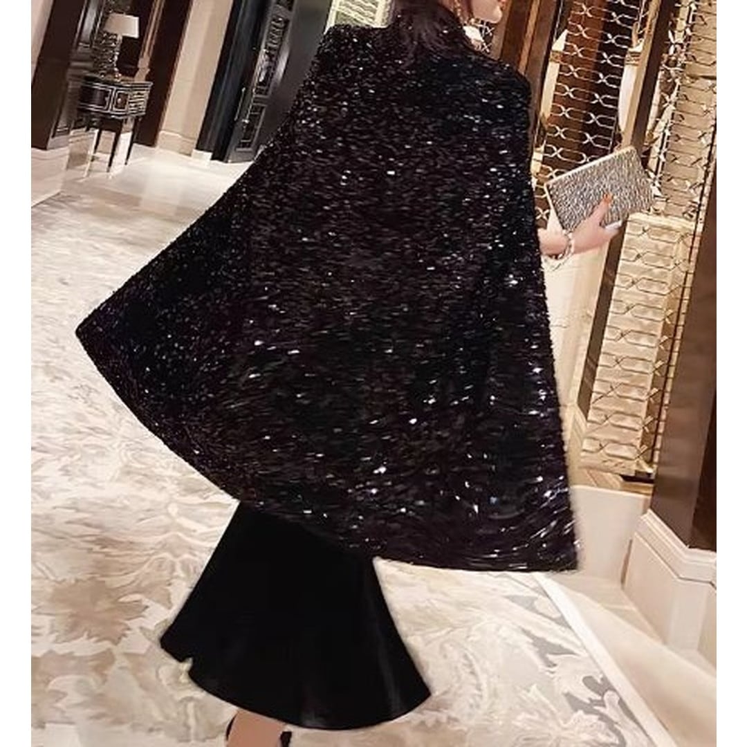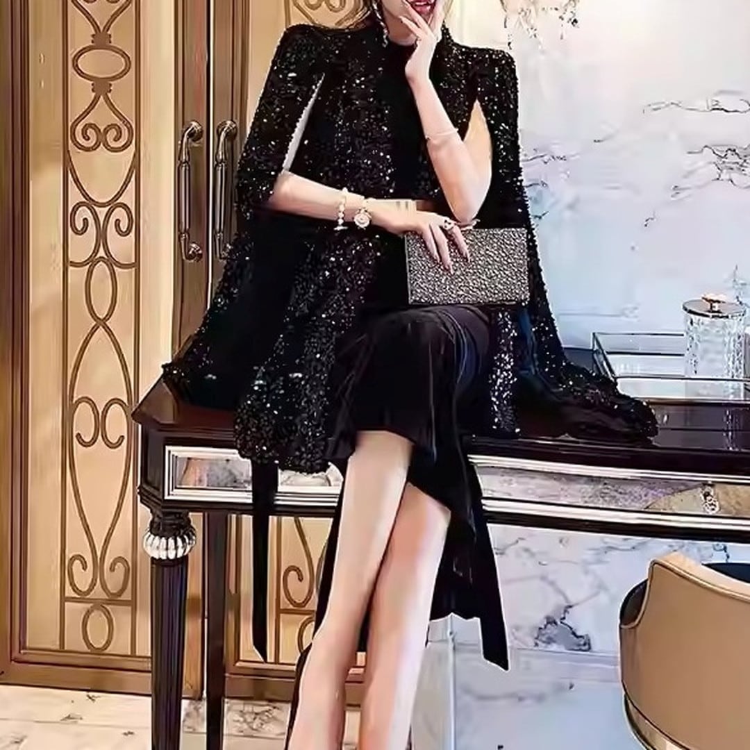 華やかなシーンに映えるミディ丈のケープドレス。上半身を覆うスパンコールのケープが、動くたびに光を反射し、周囲の視線を惹きつけます。ウエストを絞ったデザインで、スタイルアップ効果も期待できます。パーティーや特別なディナーなど、とっておきの日にふさわしい一着です。