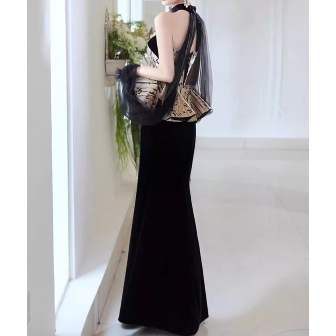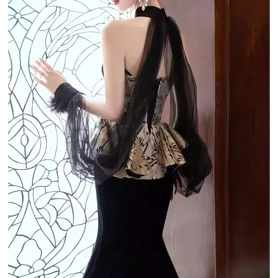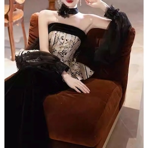 特別な日の装いに、上品な華やぎを添えるドレス。ベアトップのデザインがデコルテを美しく演出し、ペプラムヘムがフェミニンな印象を与えます。マーメイドラインのスカートが、大人の女性らしいシルエットを際立たせます。パーティーやイベントなど、華やかなシーンに最適です。
