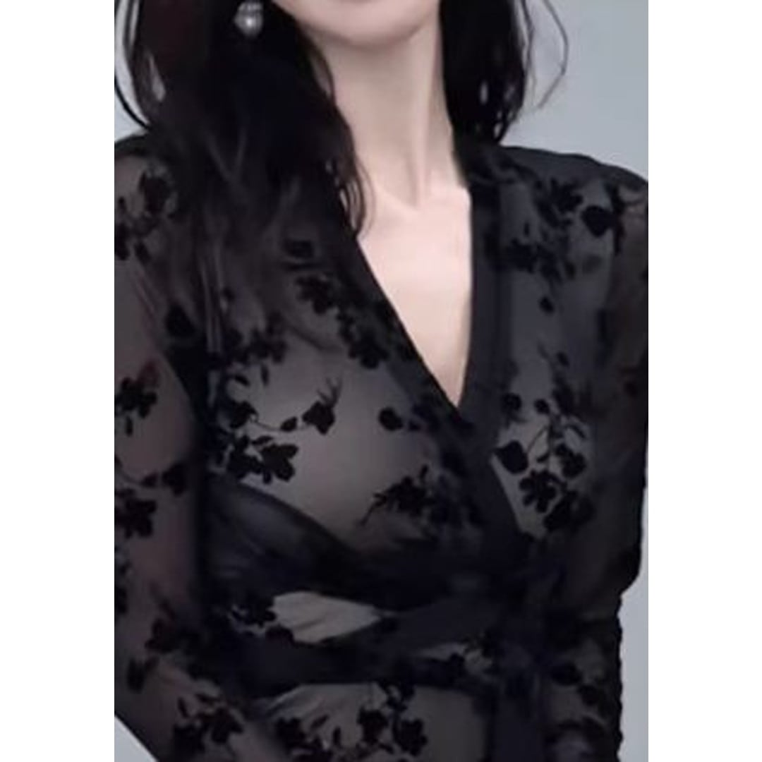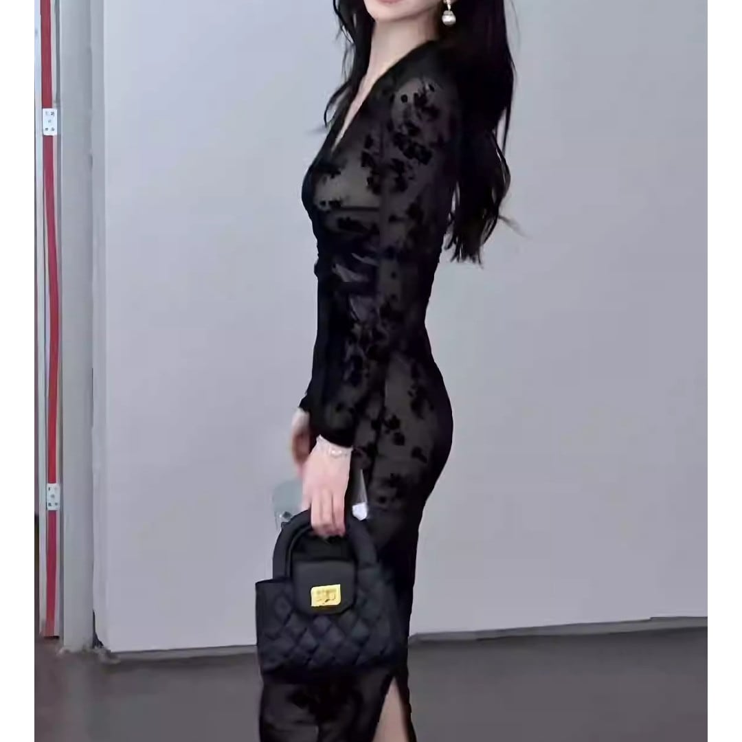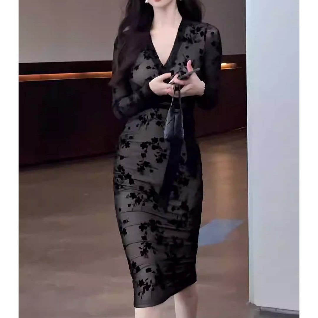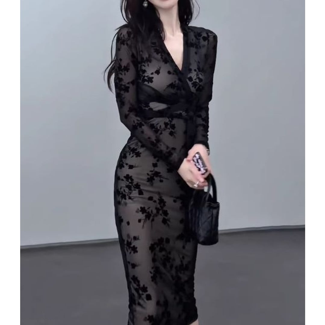 深めのVネックがデコルテを美しく見せるミディドレス。長袖なので、一枚で着ても上品な印象に。パーティや食事会など、少し特別なシーンにおすすめです。シルエットが美しく、スタイルアップ効果も期待できます。