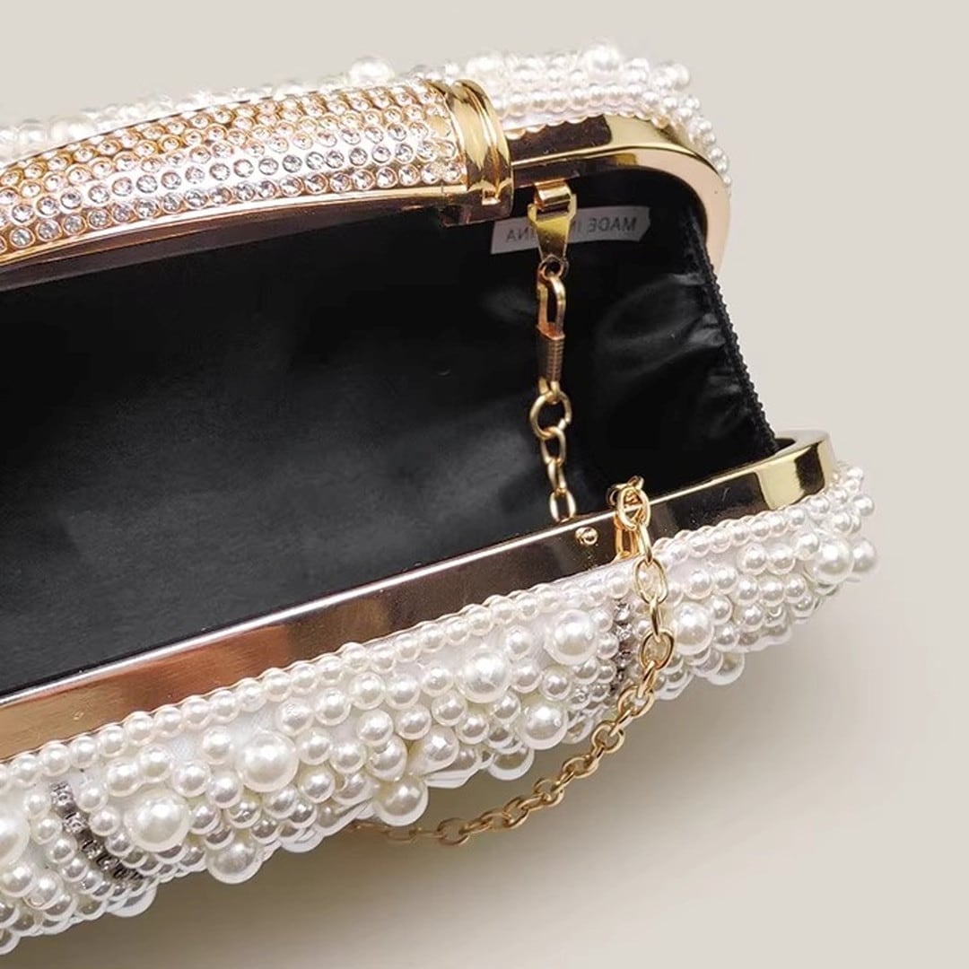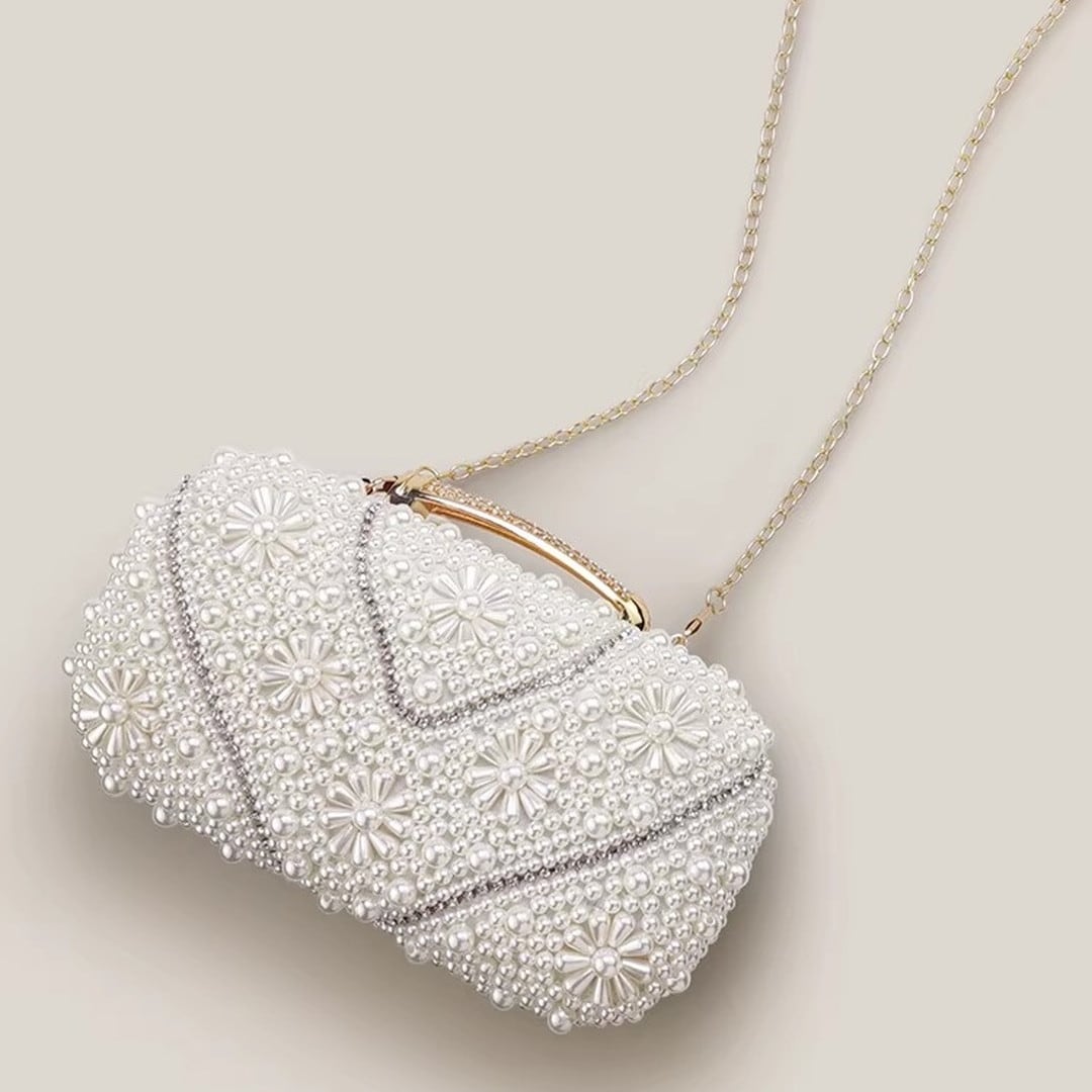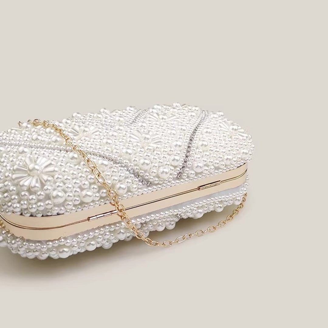 パール装飾が華やかなスクエアクラッチバッグ。チェーンストラップ付きで、ショルダーバッグとしても使用できます。結婚式やパーティーなどのフォーマルなシーンはもちろん、普段使いにもコーディネートのアクセントとして活躍します。上品なデザインで、あなたの装いをより一層引き立てます。