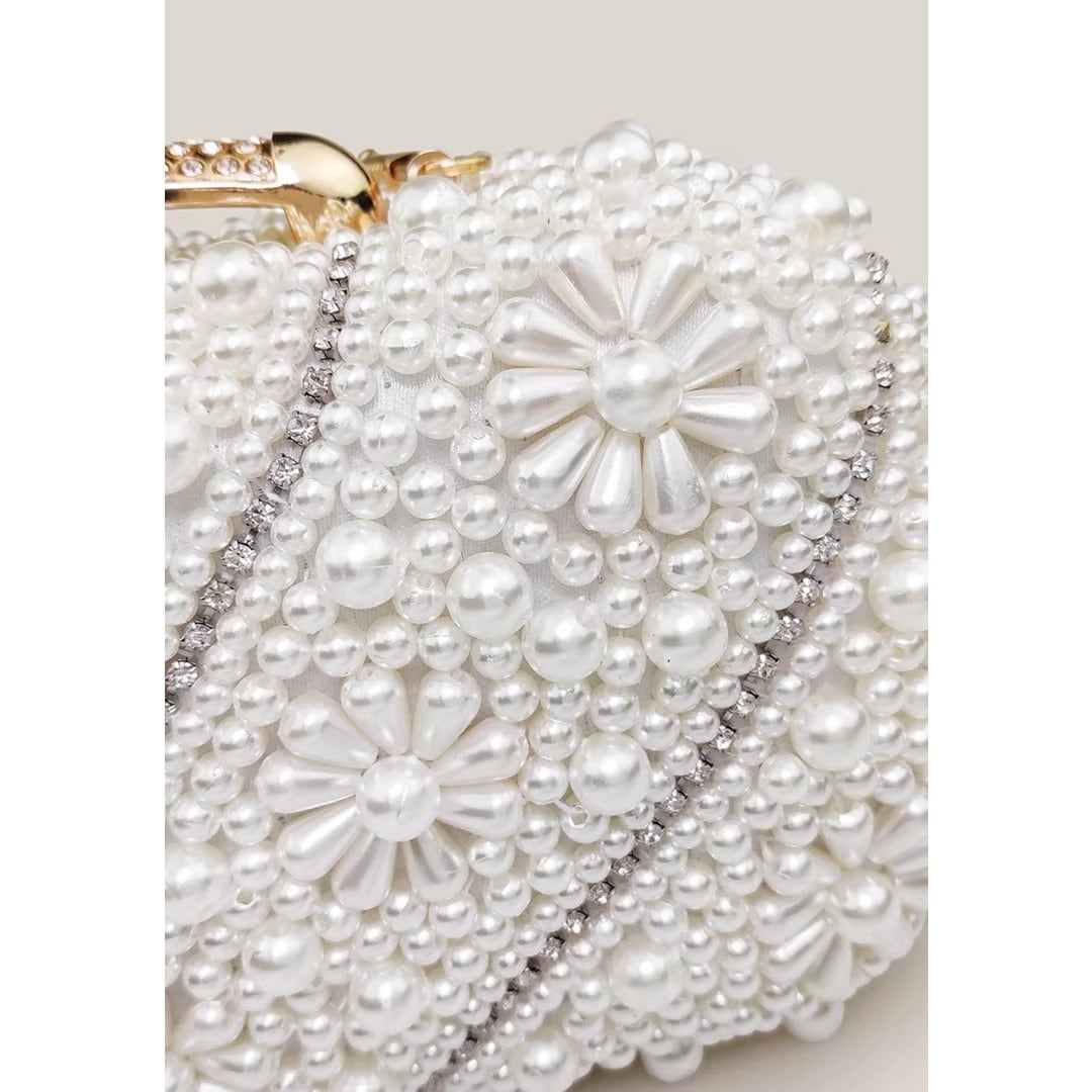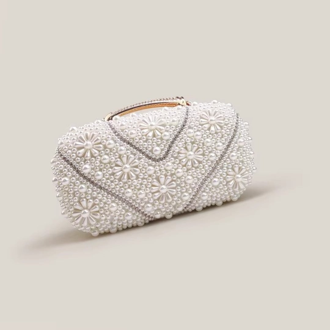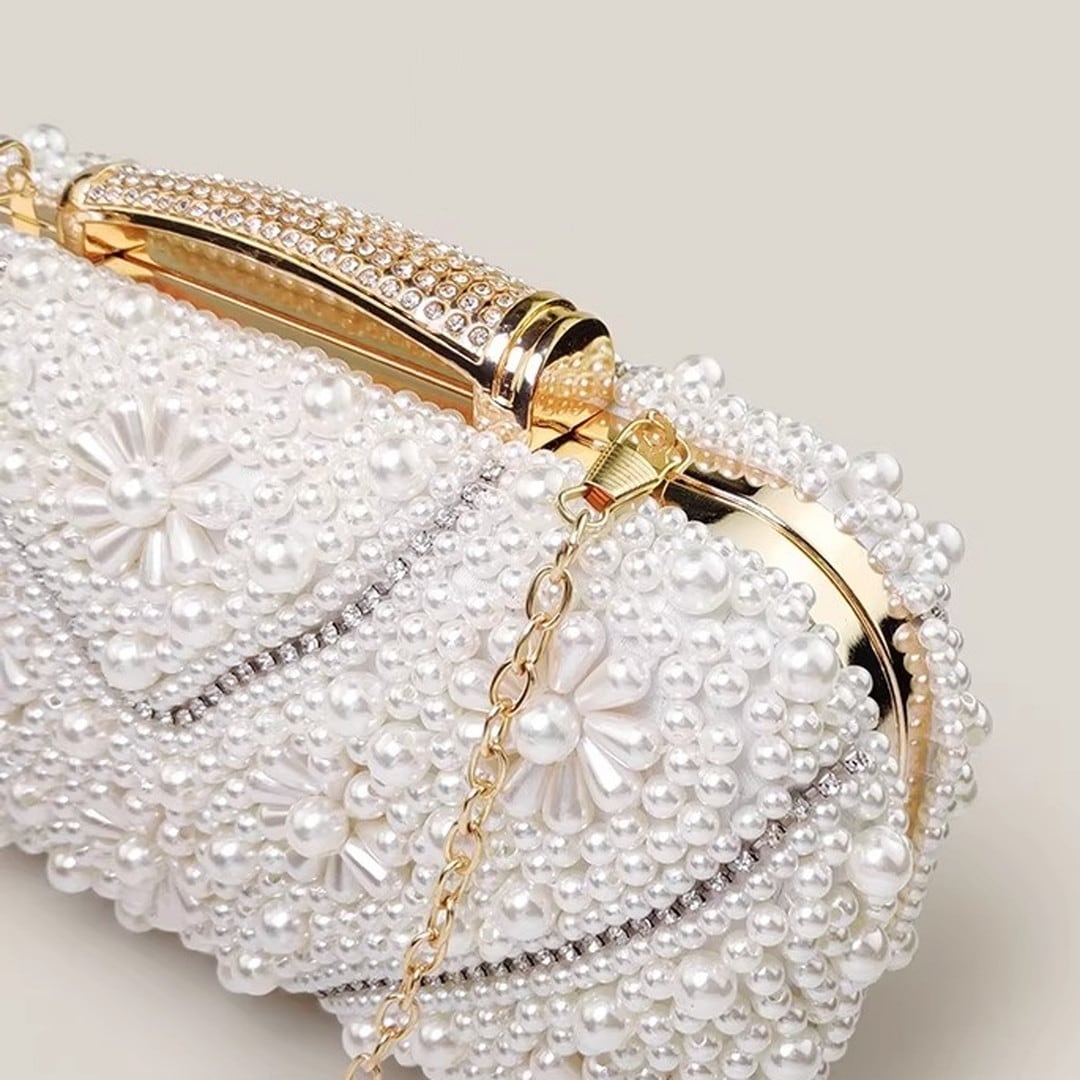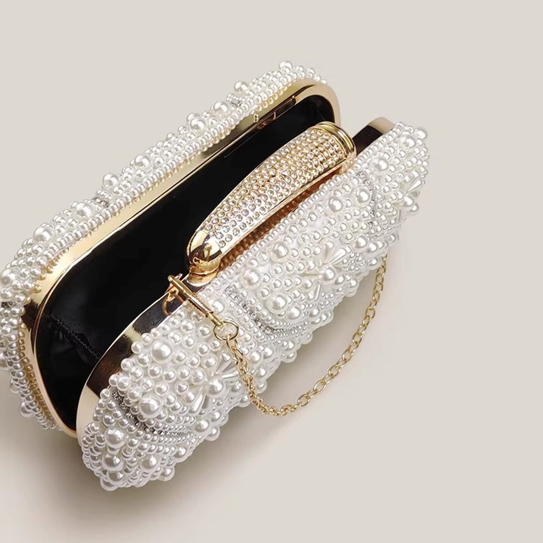パール装飾が華やかなスクエアクラッチバッグ。チェーンストラップ付きで、ショルダーバッグとしても使用できます。結婚式やパーティーなどのフォーマルなシーンはもちろん、普段使いにもコーディネートのアクセントとして活躍します。上品なデザインで、あなたの装いをより一層引き立てます。