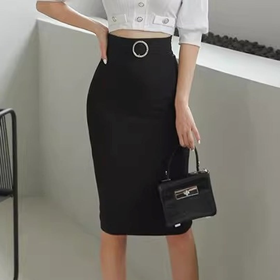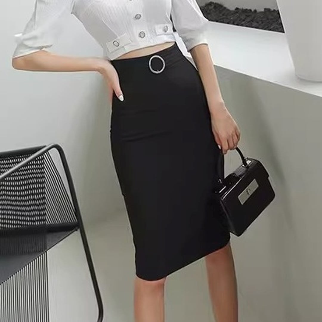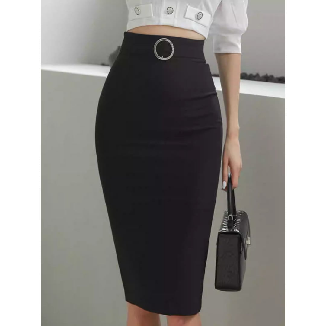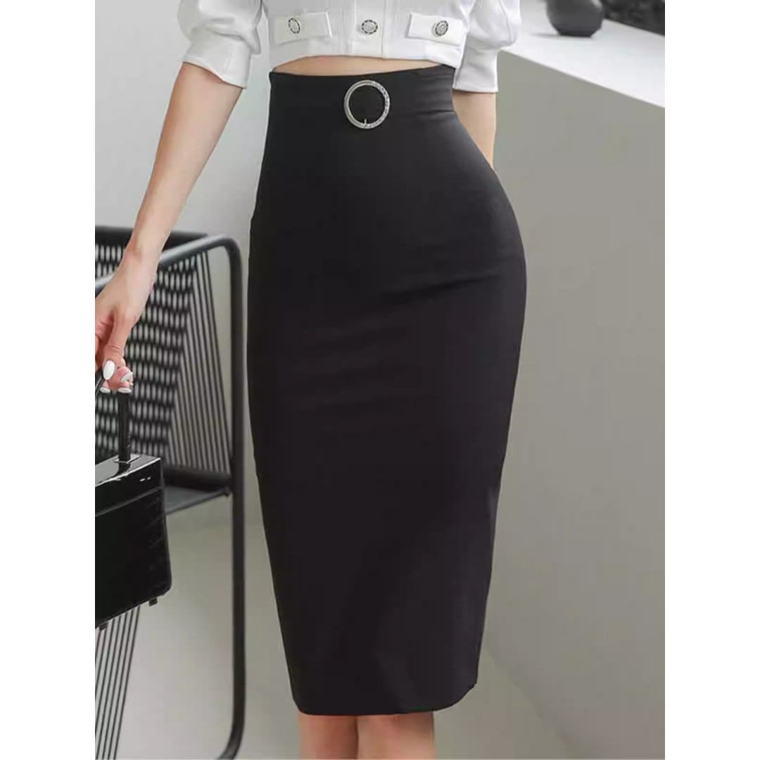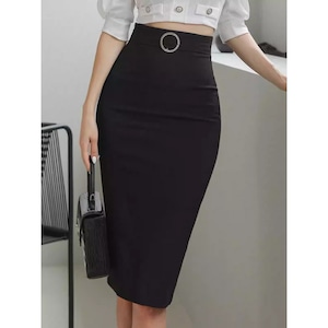 スマートな印象を与えるミディ丈のタイトスカートです。ウエストのベルトと特徴的なバックルがアクセントとなり、シンプルなトップスと合わせても洗練されたスタイルが完成します。オフィスシーンはもちろん、少しフォーマルな場所にも適しており、着回し力の高い一枚です。