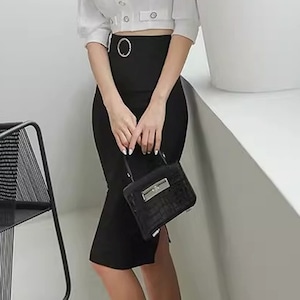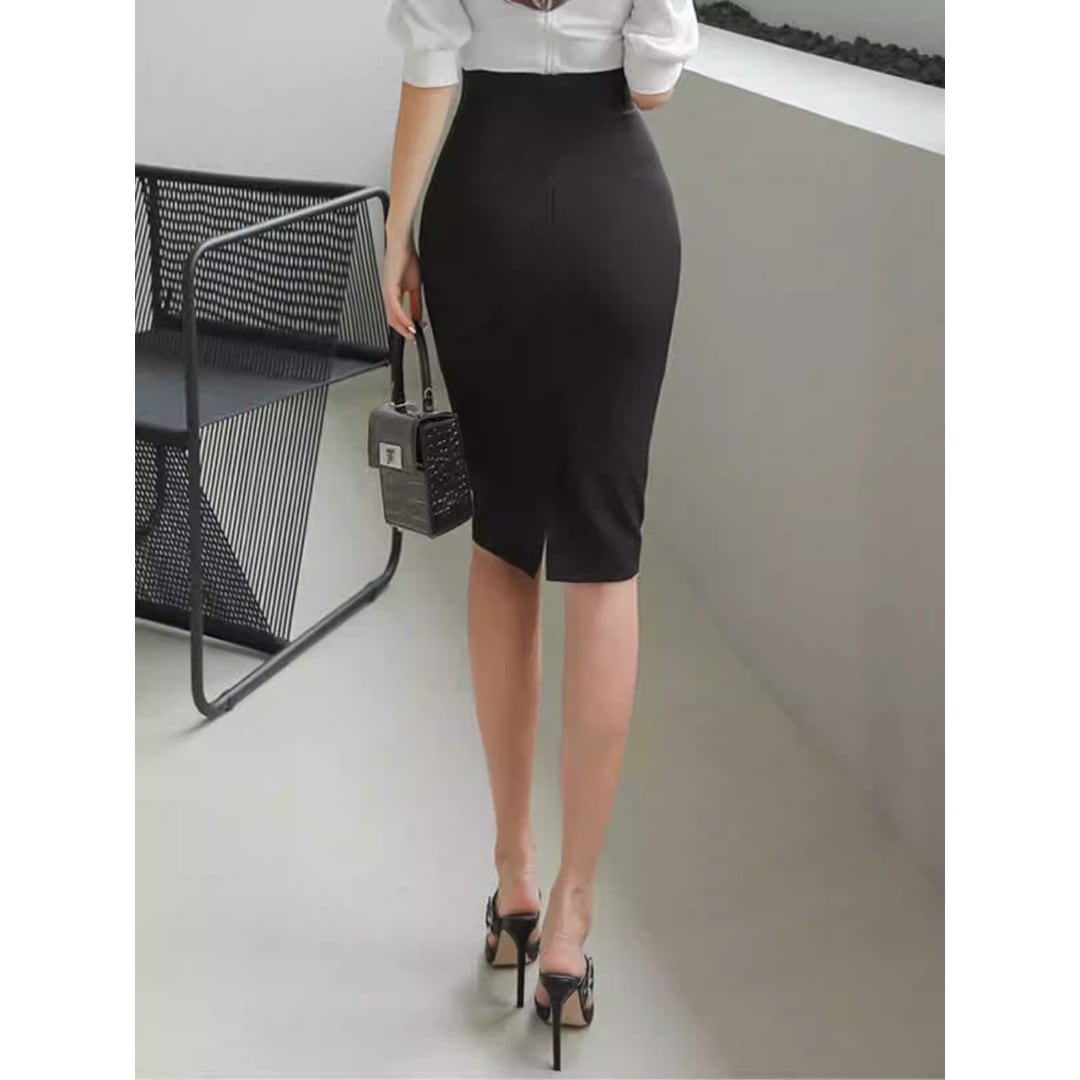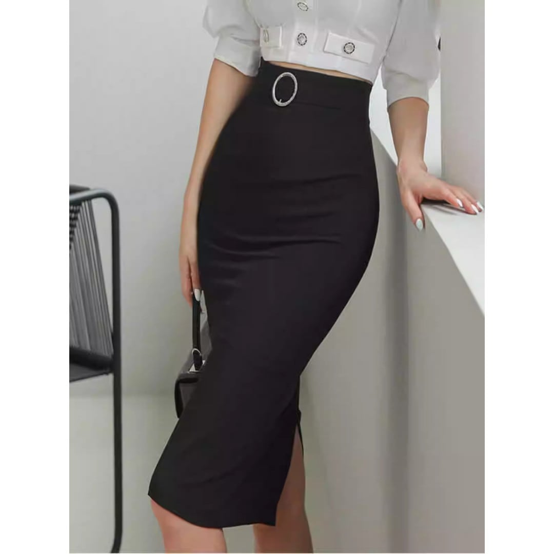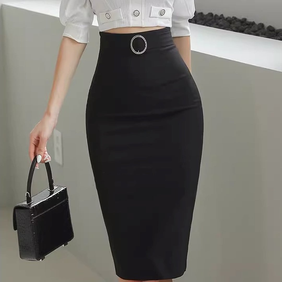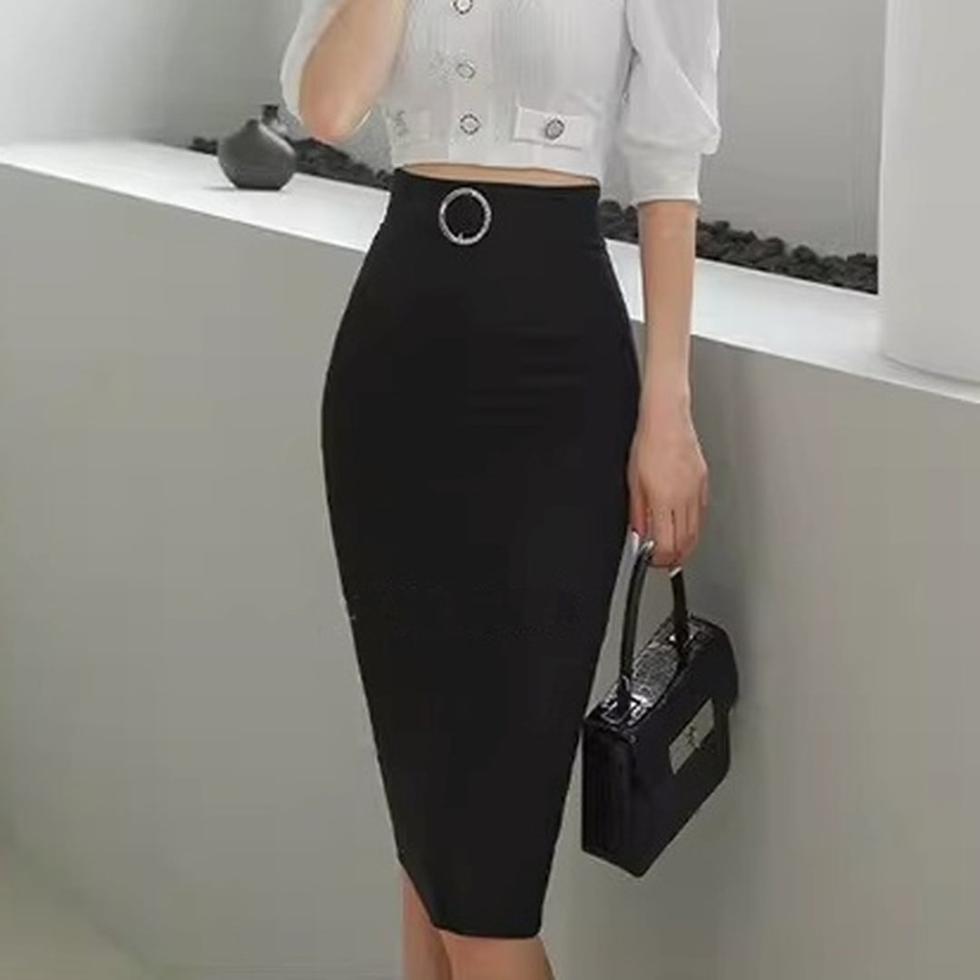 スマートな印象を与えるミディ丈のタイトスカートです。ウエストのベルトと特徴的なバックルがアクセントとなり、シンプルなトップスと合わせても洗練されたスタイルが完成します。オフィスシーンはもちろん、少しフォーマルな場所にも適しており、着回し力の高い一枚です。
