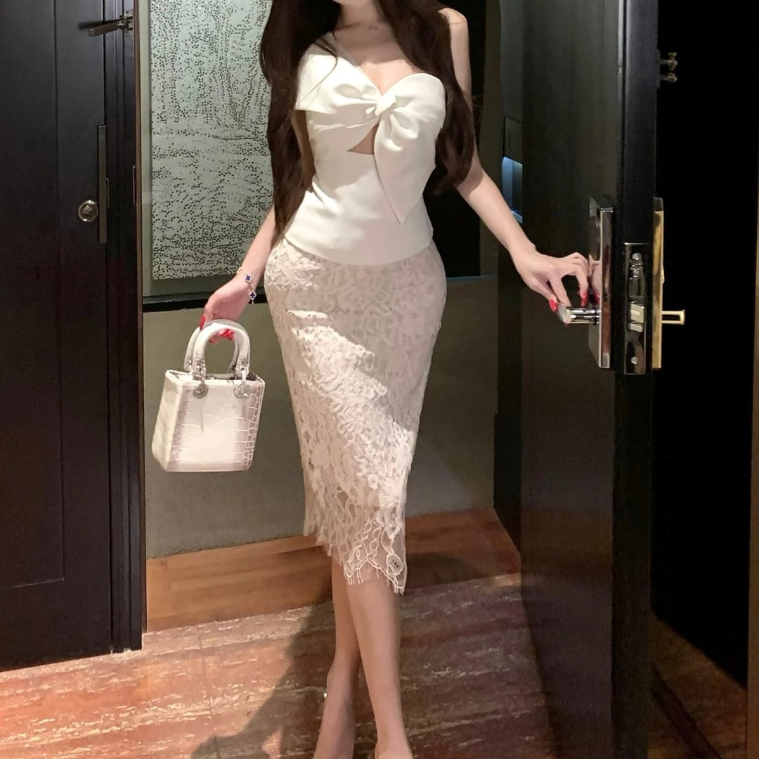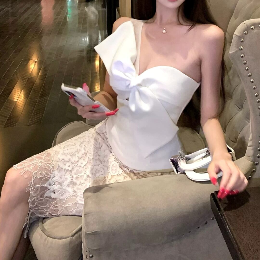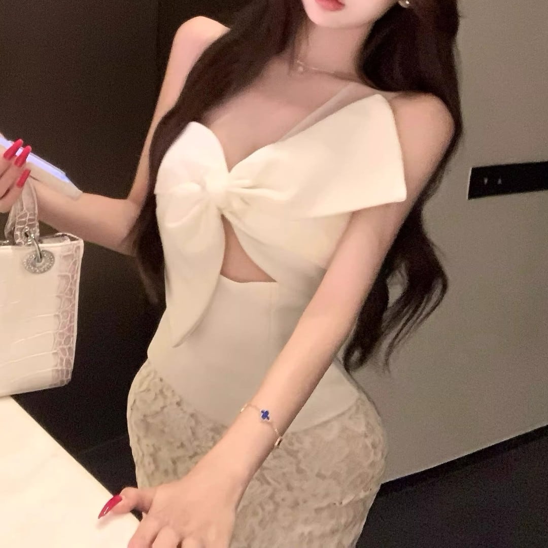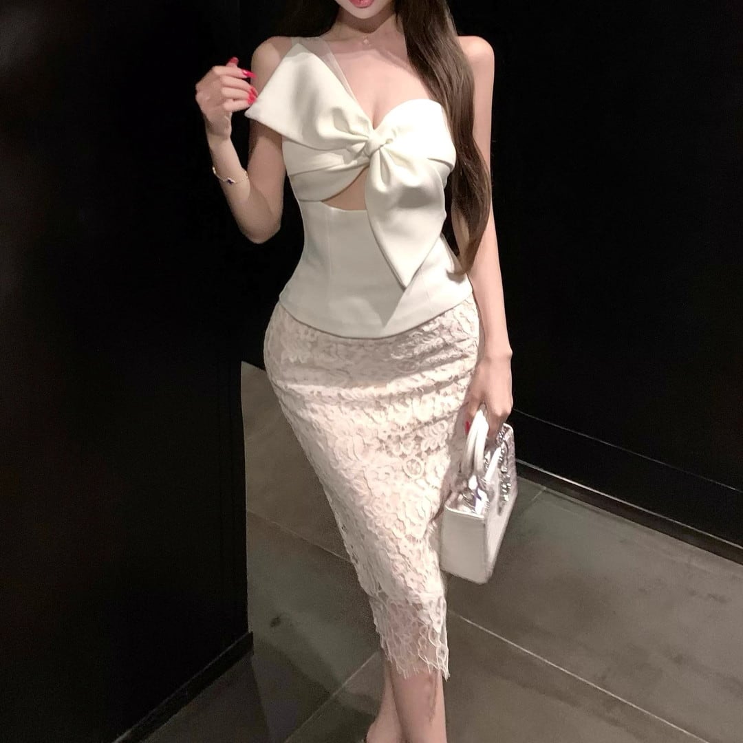リボンのディテールが目を引く、ノースリーブのミディドレスです。バスト下のカットアウトデザインが、さりげない肌見せを叶え、洗練された印象を与えます。特別な日の装いや、パーティーシーンにもおすすめです。