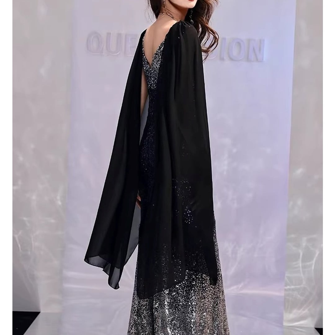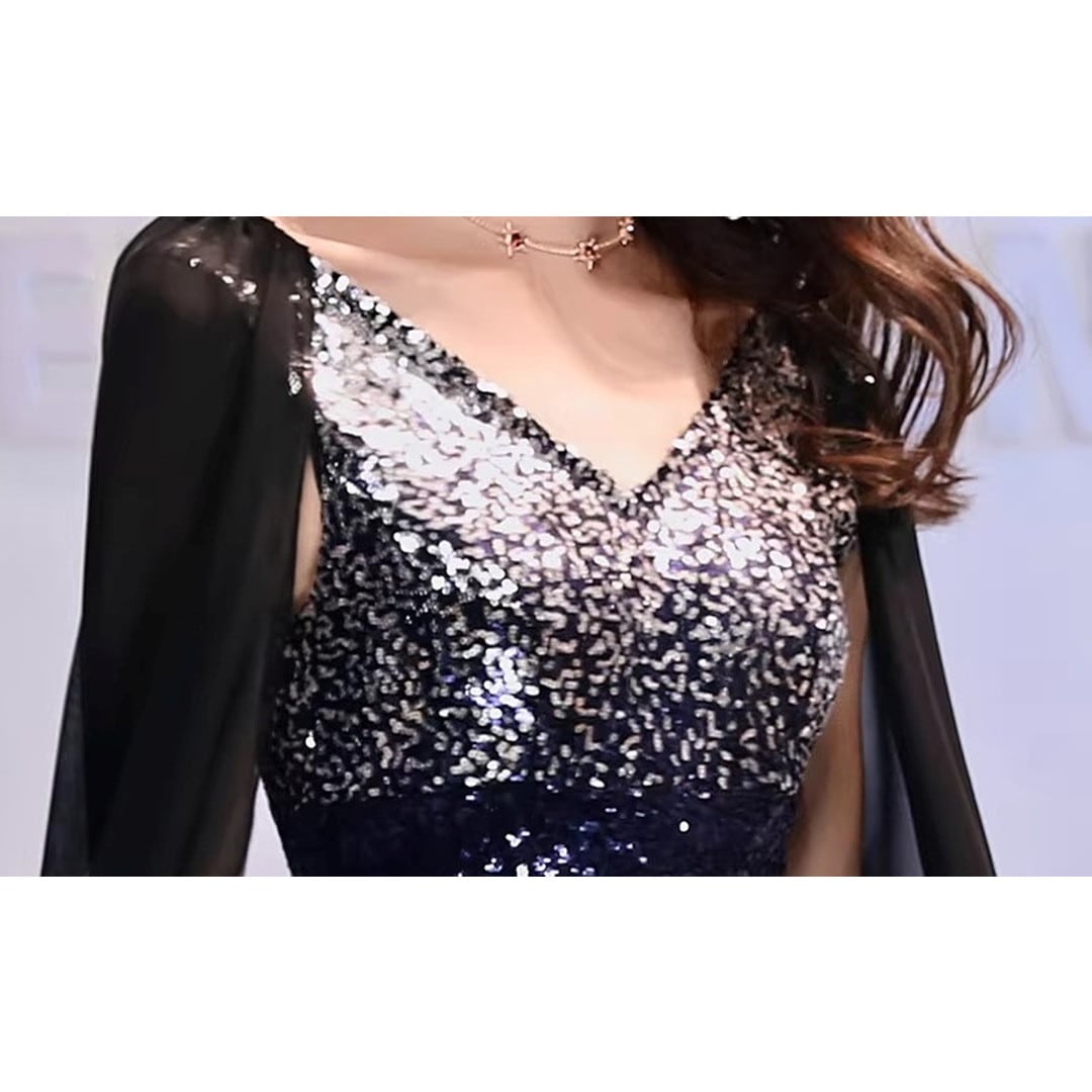 きらめくスパンコールが視線を奪う、ロングマキシイブニングドレス。深みのあるカラーから足元にかけてのグラデーションが、洗練された印象を与えます。付属のシフォン素材のショールが、より一層エレガントな雰囲気を演出。特別な日の装いにふさわしい一着です。