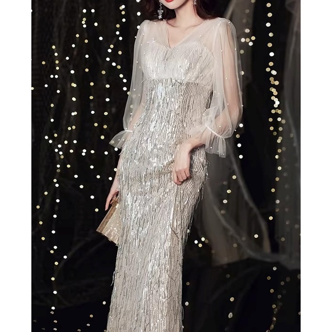 特別な夜にふさわしい、華やかなシーンを彩るドレス。ボディラインを美しく引き立てるマーメイドシルエットが、エレガントな印象を与えます。シースルーの袖が軽やかさをプラスし、上品な肌見せを演出。パーティや特別なイベントで、周囲の視線を惹きつける存在感のある一着です。