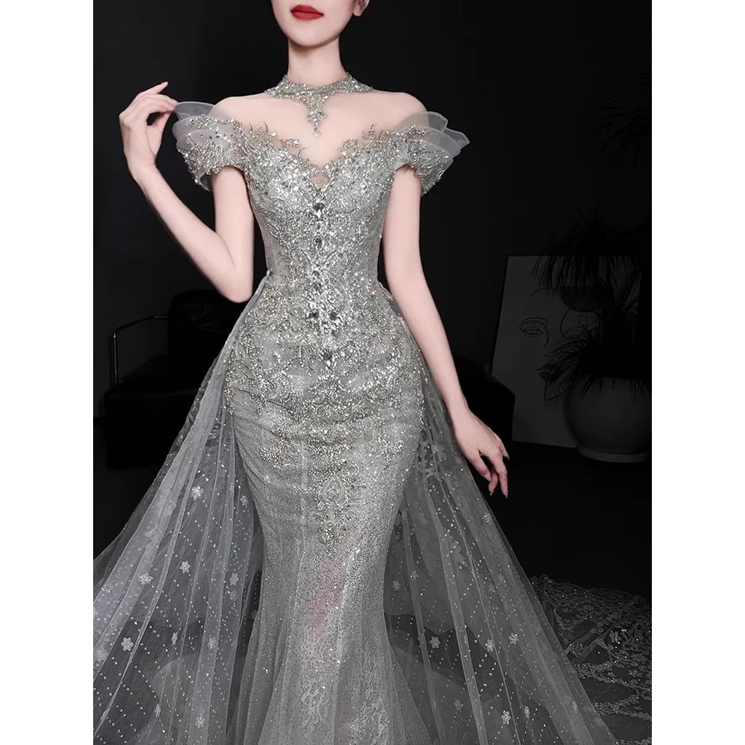 特別な夜を彩る、オフショルダーのマーメイドロングイブニングドレス。美しいシルエットが、あなたの魅力を最大限に引き出します。パーティーや特別なイベントで、注目の的になること間違いなしです。