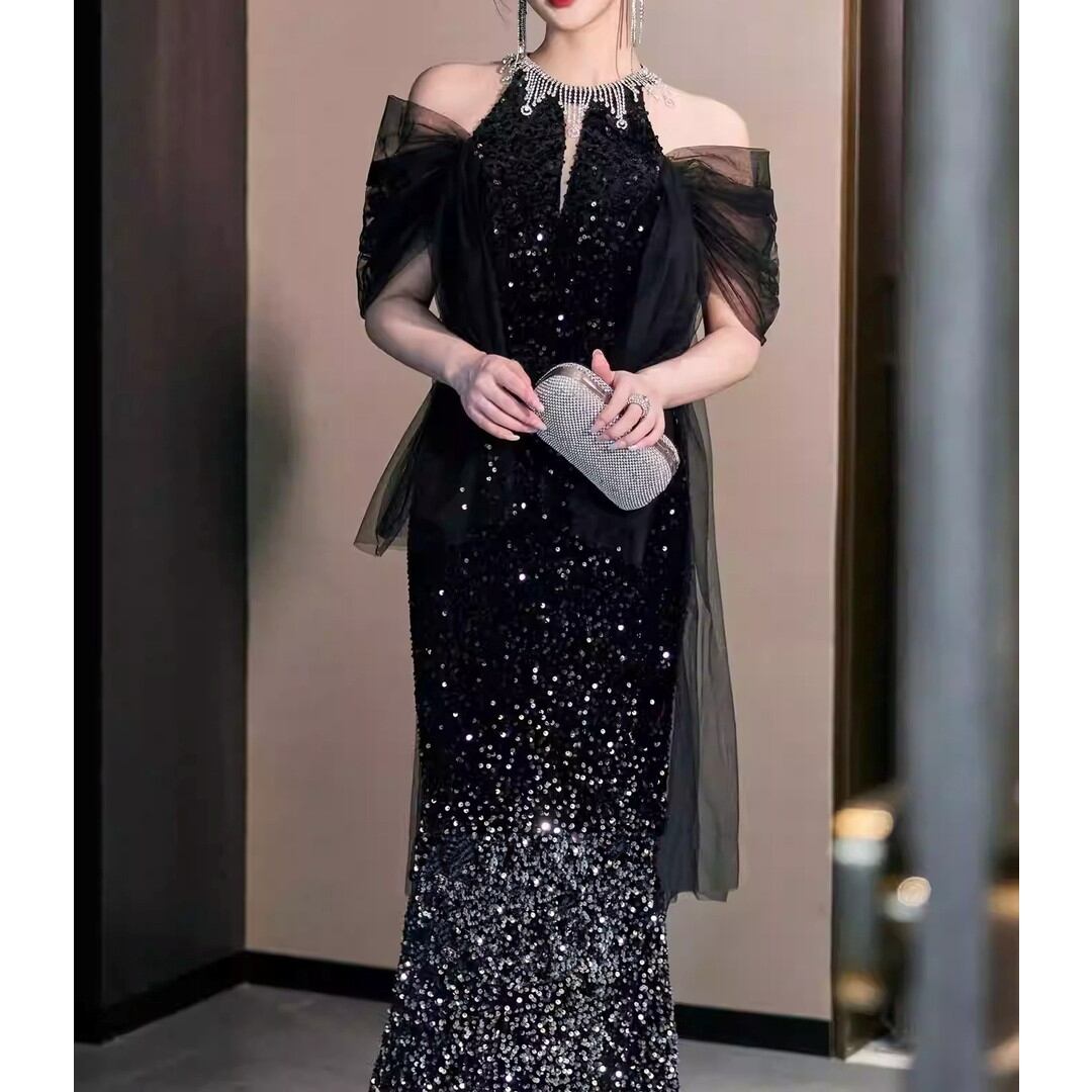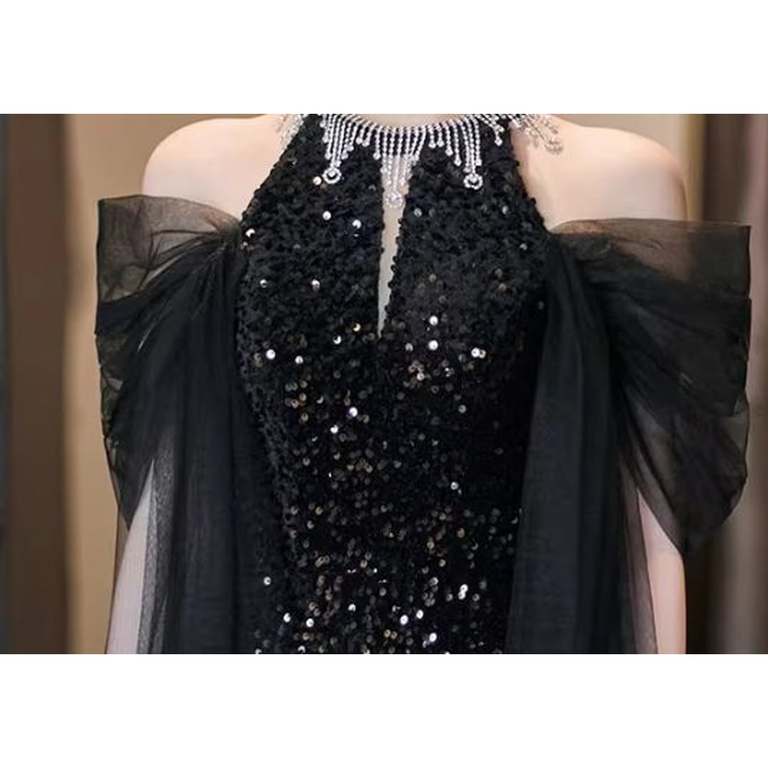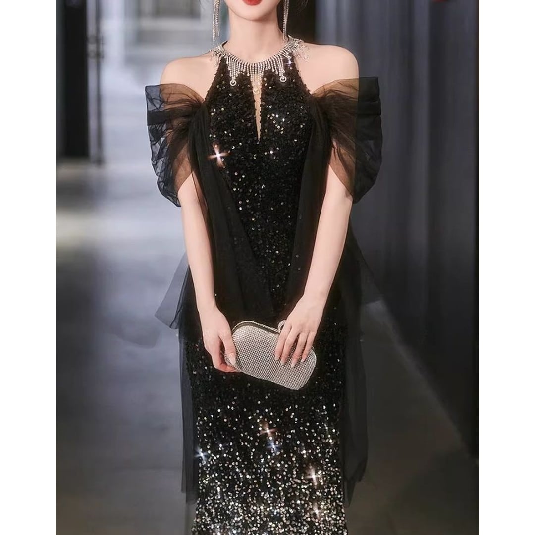 首元を美しく見せるホルターネックデザインと、きらびやかなスパンコールが印象的なマキシ丈のイブニングドレスです。パーティーや特別なイベントなど、華やかなシーンに最適です。美しいシルエットで、エレガントな大人の女性を演出します。