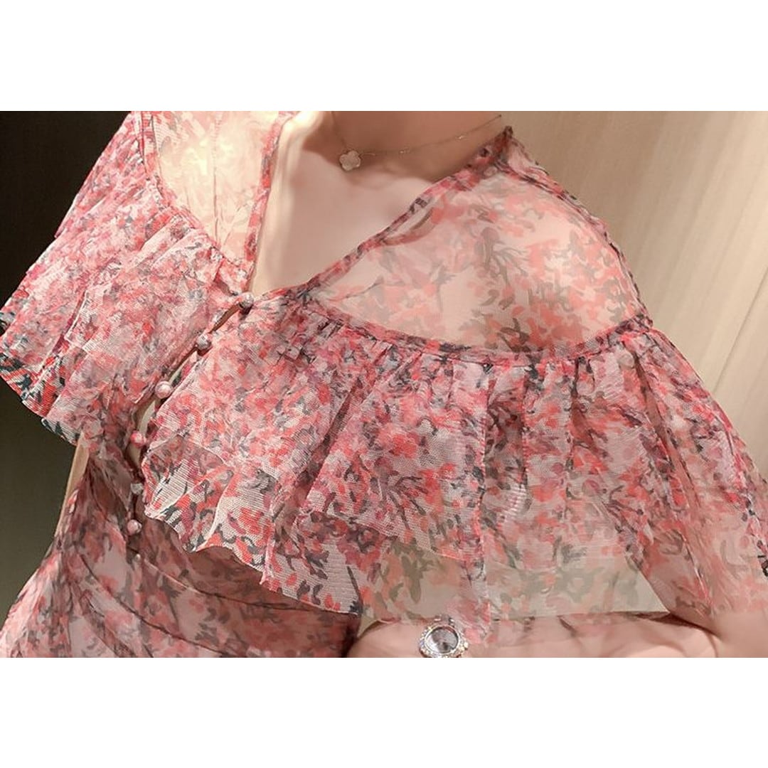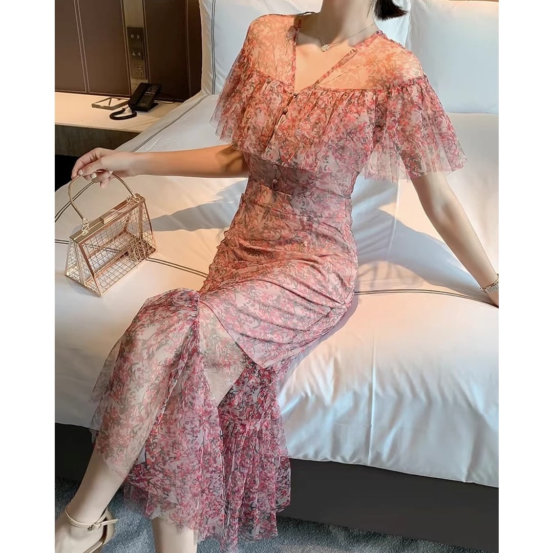 華やかながらも落ち着いた印象を与えるミディドレス。肩を飾るフリルと、裾にかけて広がるマーメイドラインが、女性らしいシルエットを演出します。特別な日の装いはもちろん、アクセサリーや小物との組み合わせで、パーティーシーンにもおすすめです。