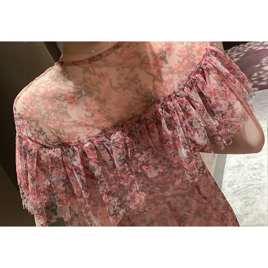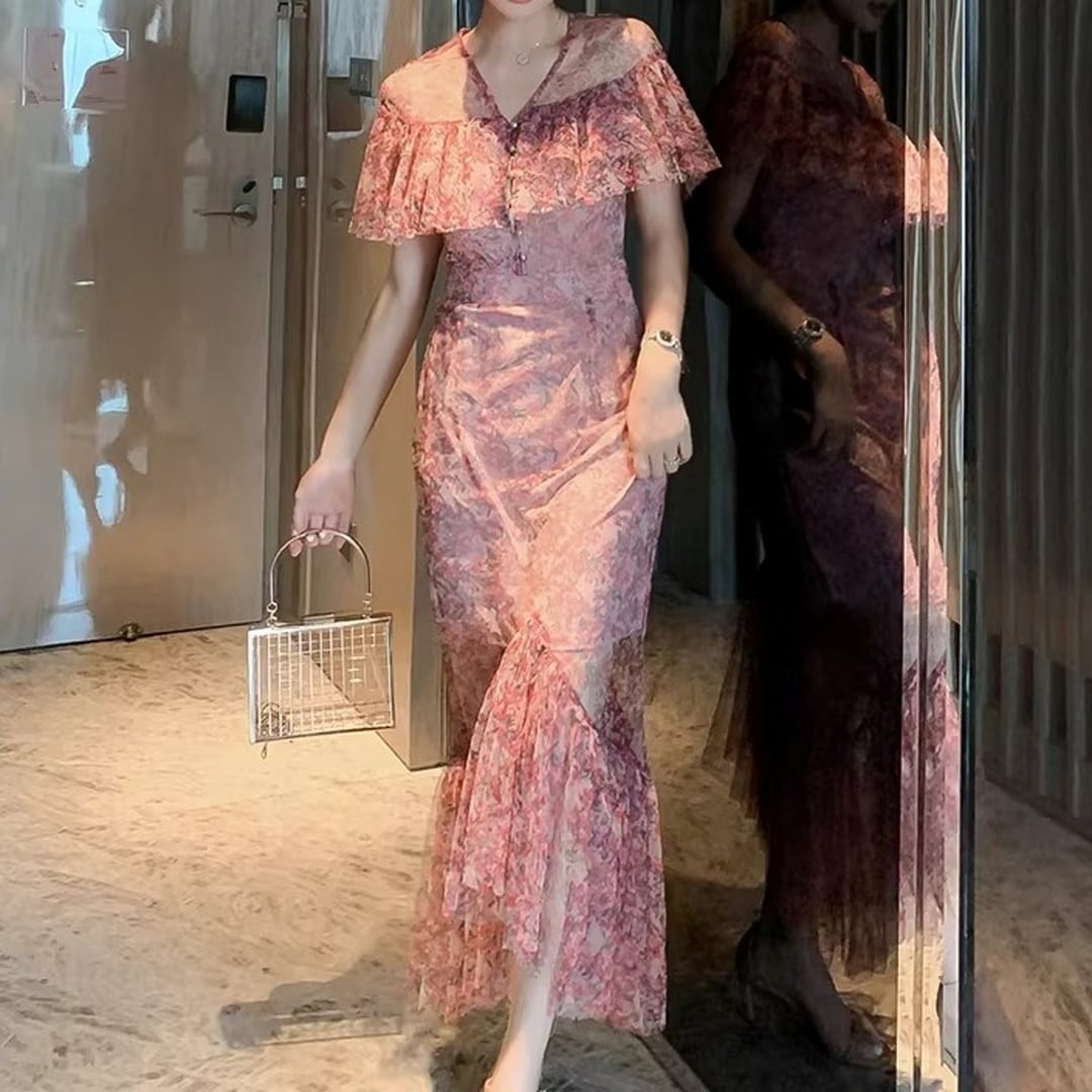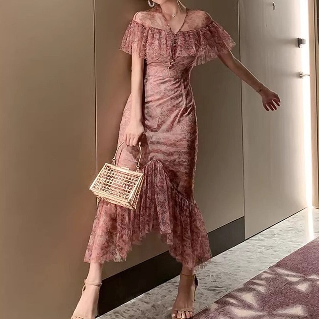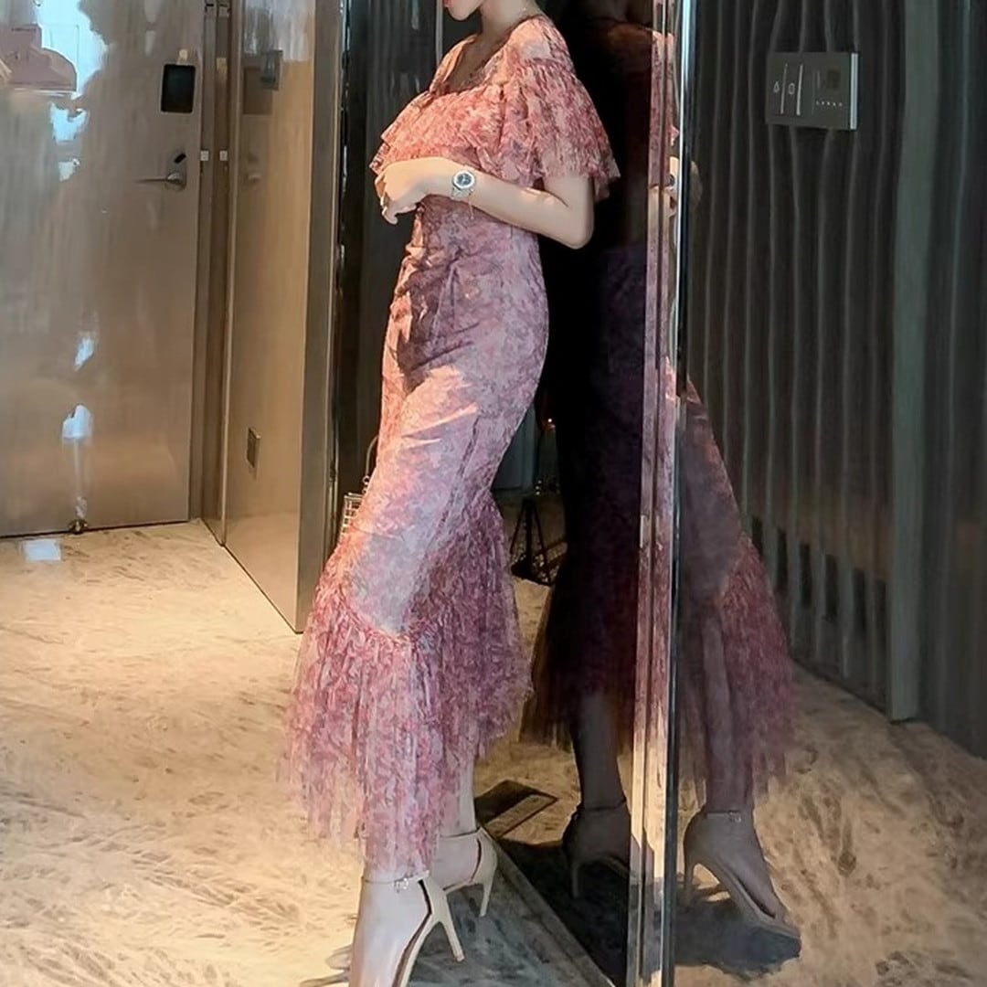 Frill Short Sleeve Mermaid Midi Dress V3327