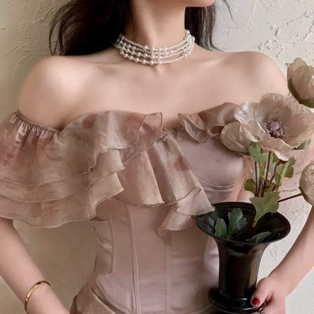 オフショルダーデザインがデコルテを美しく引き立てるミディドレス。フリルがあしらわれたデザインは、華やかさをプラスし、パーティーシーンにもおすすめです。シルエットが女性らしさを演出し、特別な日の装いにぴったりです。