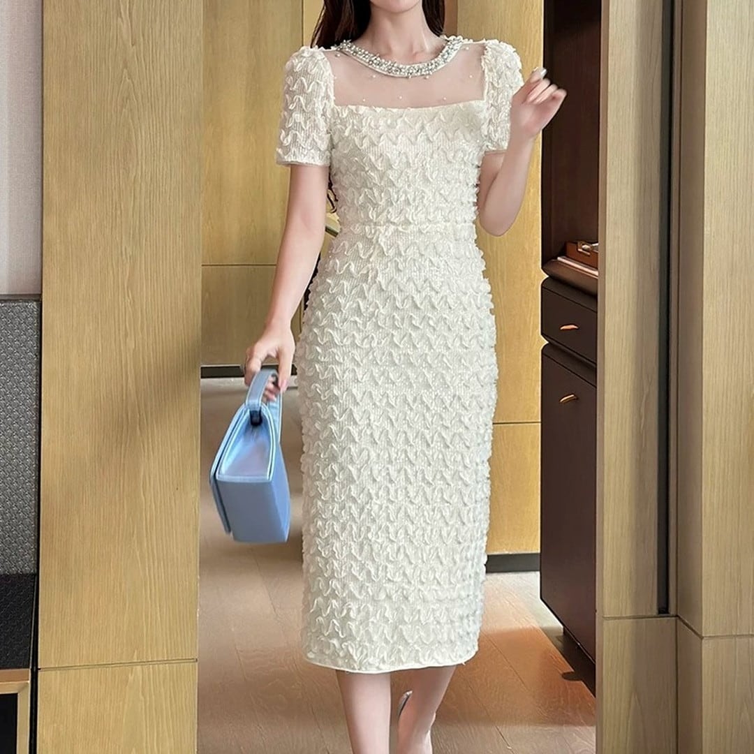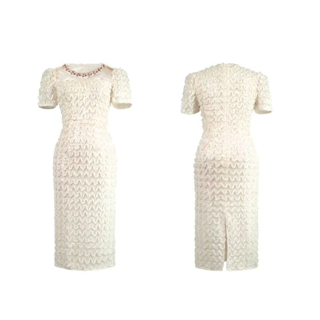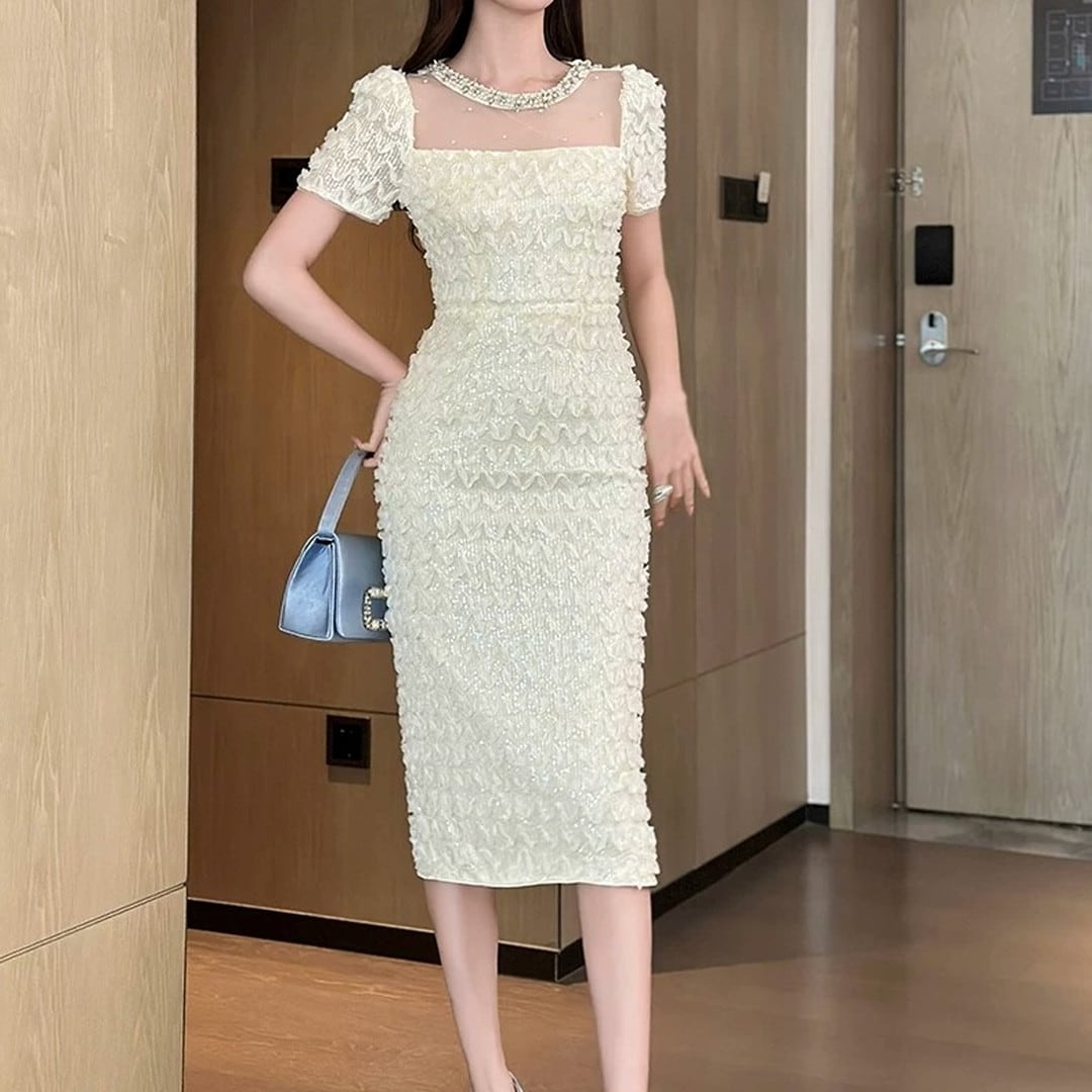 首元に配されたビーズ装飾とシアー素材の切り替えが、洗練された華やかさを演出します。ボディラインに美しく沿うタイトシルエットが、縦長のラインを強調し、エレガントな印象を与えます。ミディ丈のデザインは、フォーマルなシーンにも相応しく、特別な日の装いを格上げしてくれる一着です。