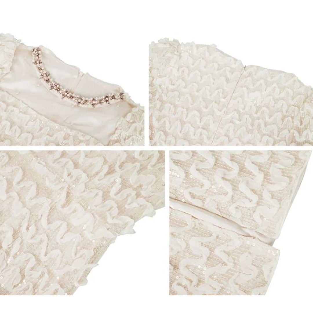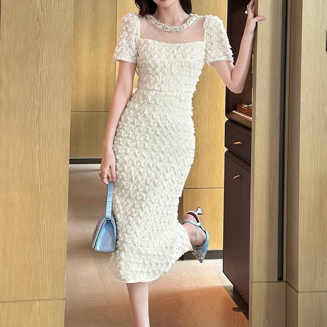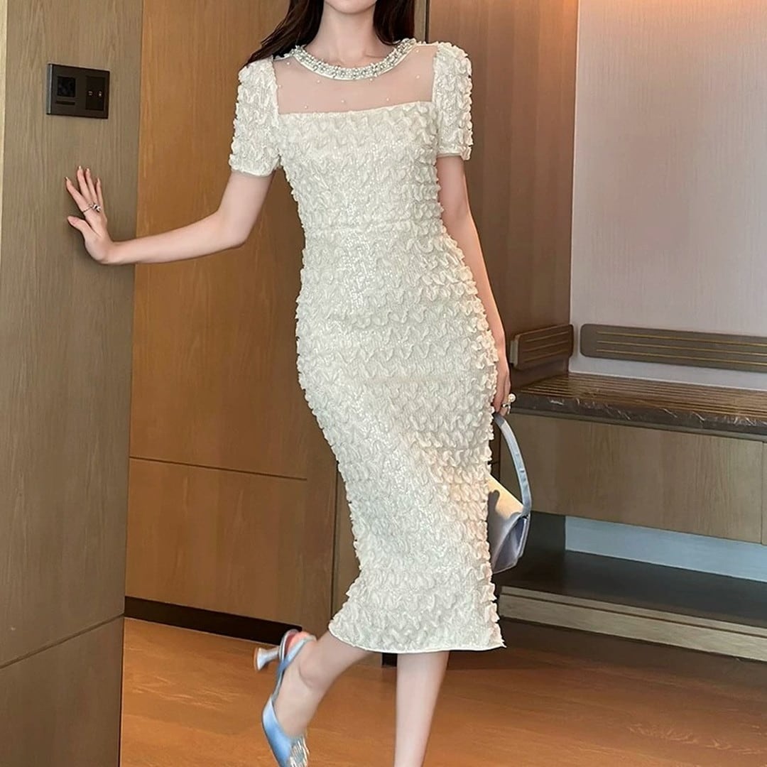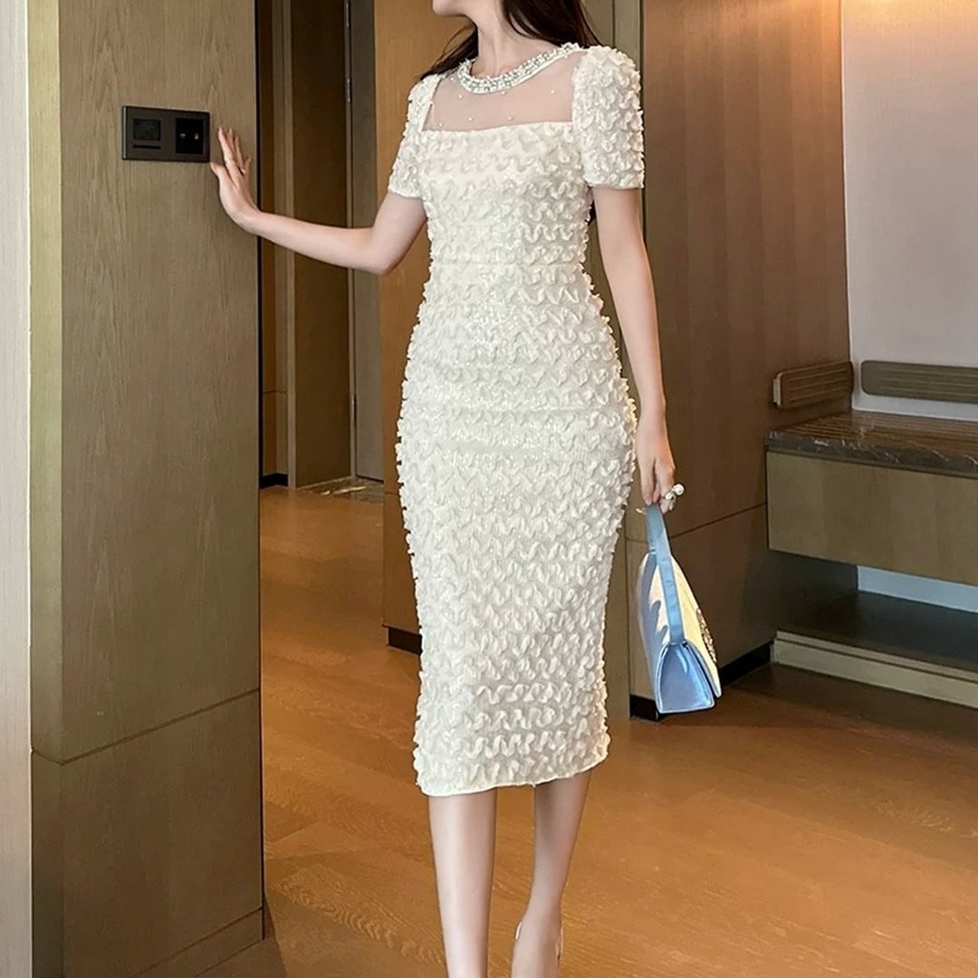 首元に配されたビーズ装飾とシアー素材の切り替えが、洗練された華やかさを演出します。ボディラインに美しく沿うタイトシルエットが、縦長のラインを強調し、エレガントな印象を与えます。ミディ丈のデザインは、フォーマルなシーンにも相応しく、特別な日の装いを格上げしてくれる一着です。