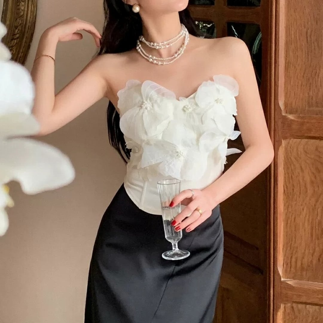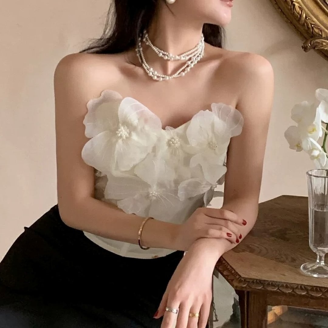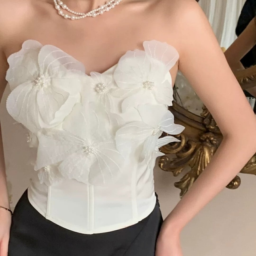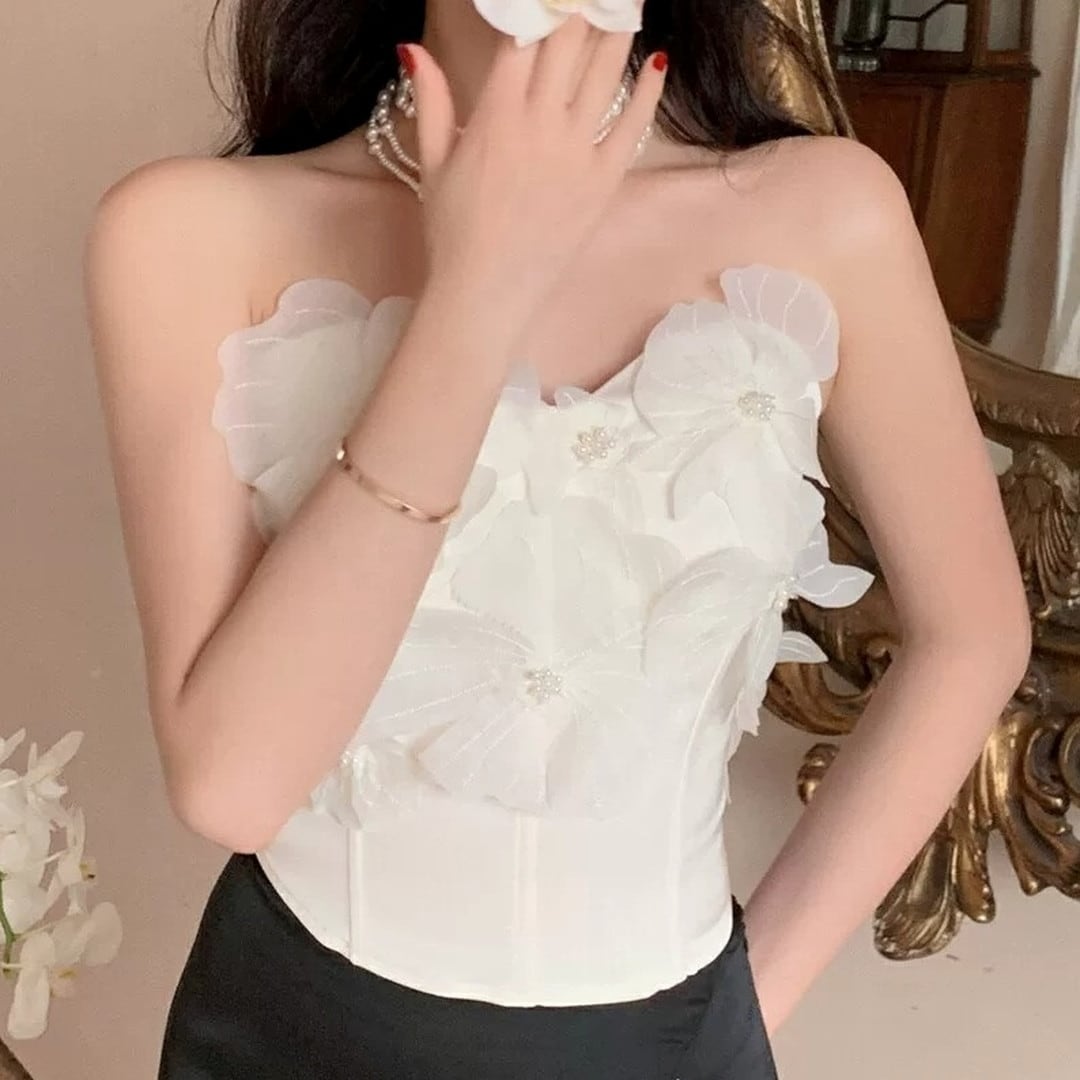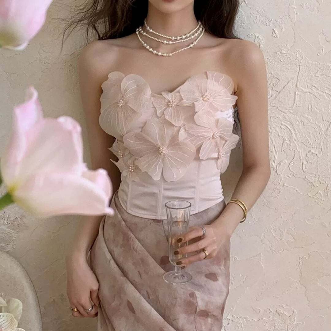 胸元を華やかに彩る、立体的なフラワーモチーフが特徴のトップスです。コルセット風のシルエットが、女性らしいボディラインを際立たせ、エレガントな雰囲気を演出します。特別な日の装いとして、パーティーやディナーなど、自信を持って華やかなシーンにぴったりの一枚です。