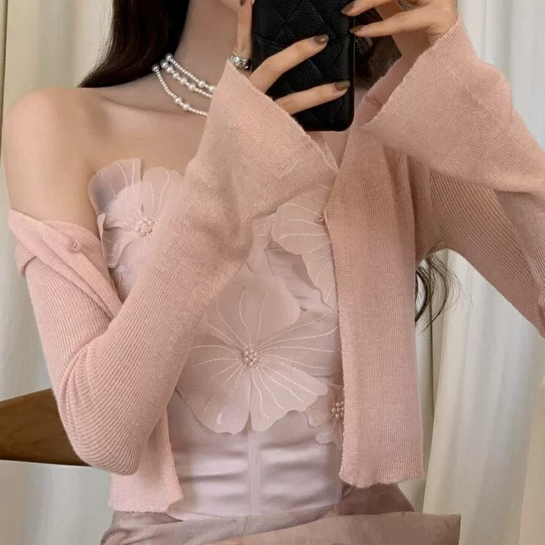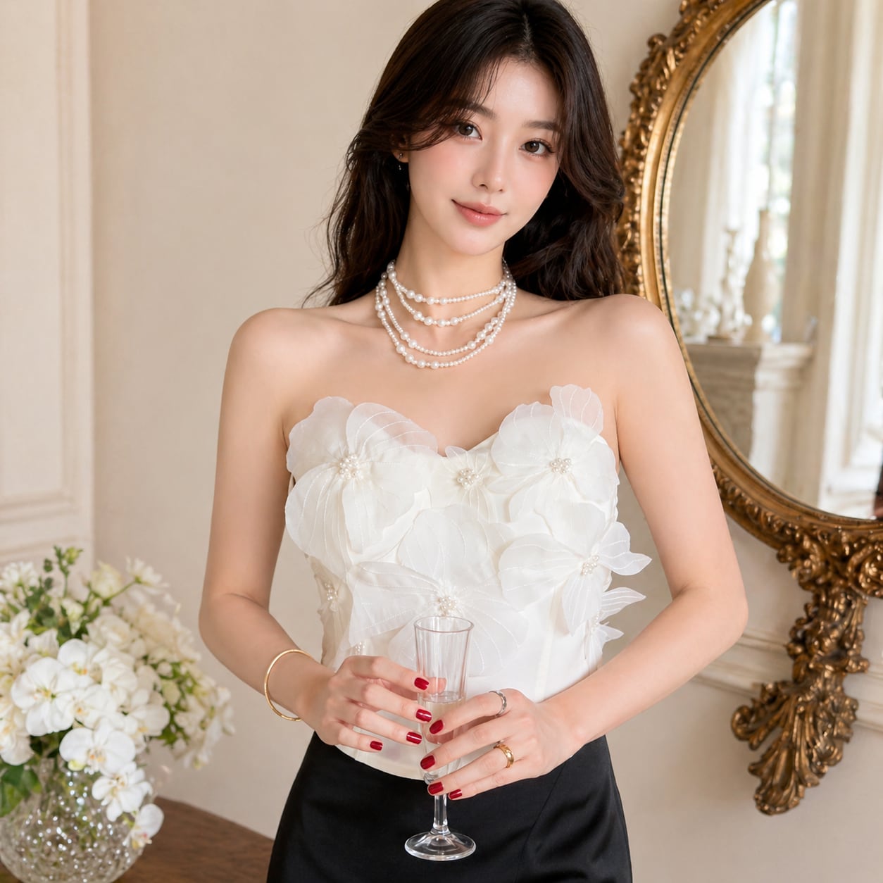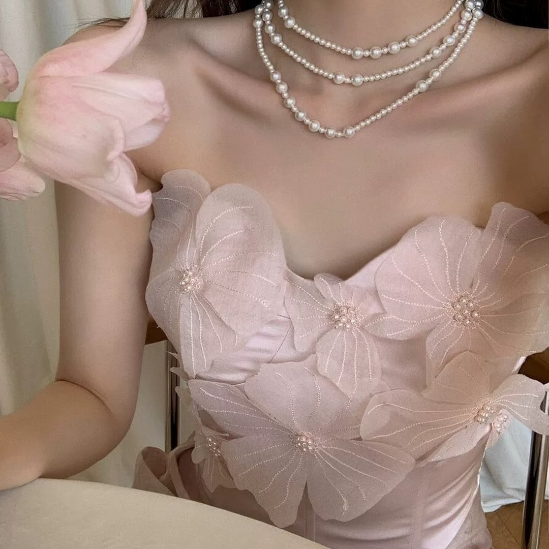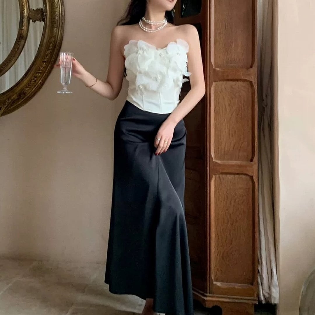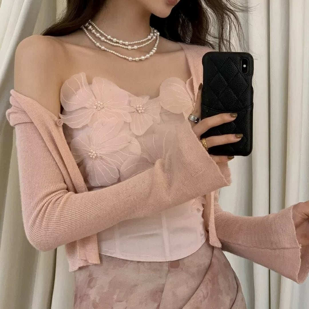 胸元を華やかに彩る、立体的なフラワーモチーフが特徴のトップスです。コルセット風のシルエットが、女性らしいボディラインを際立たせ、エレガントな雰囲気を演出します。特別な日の装いとして、パーティーやディナーなど、自信を持って華やかなシーンにぴったりの一枚です。