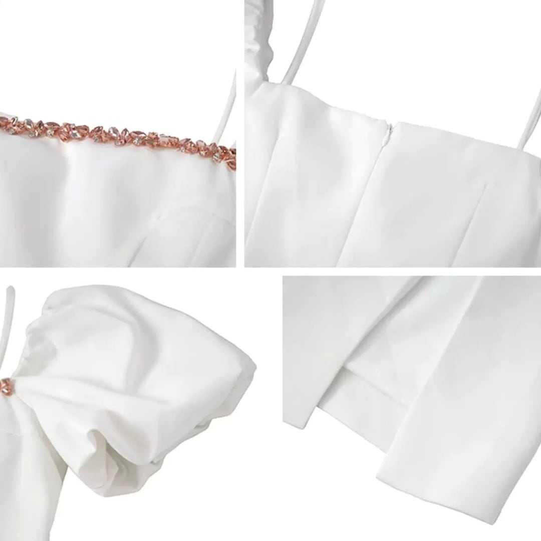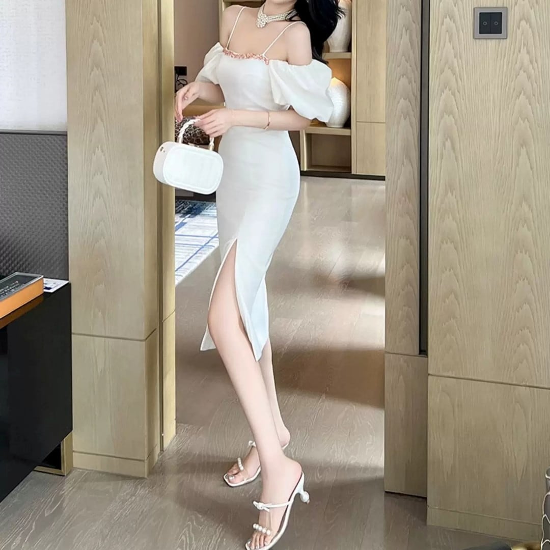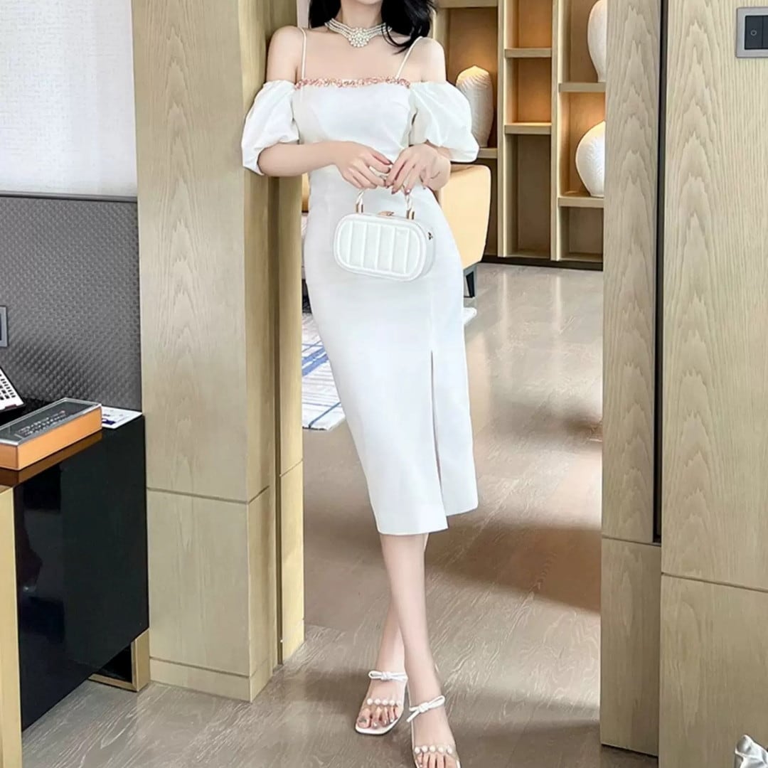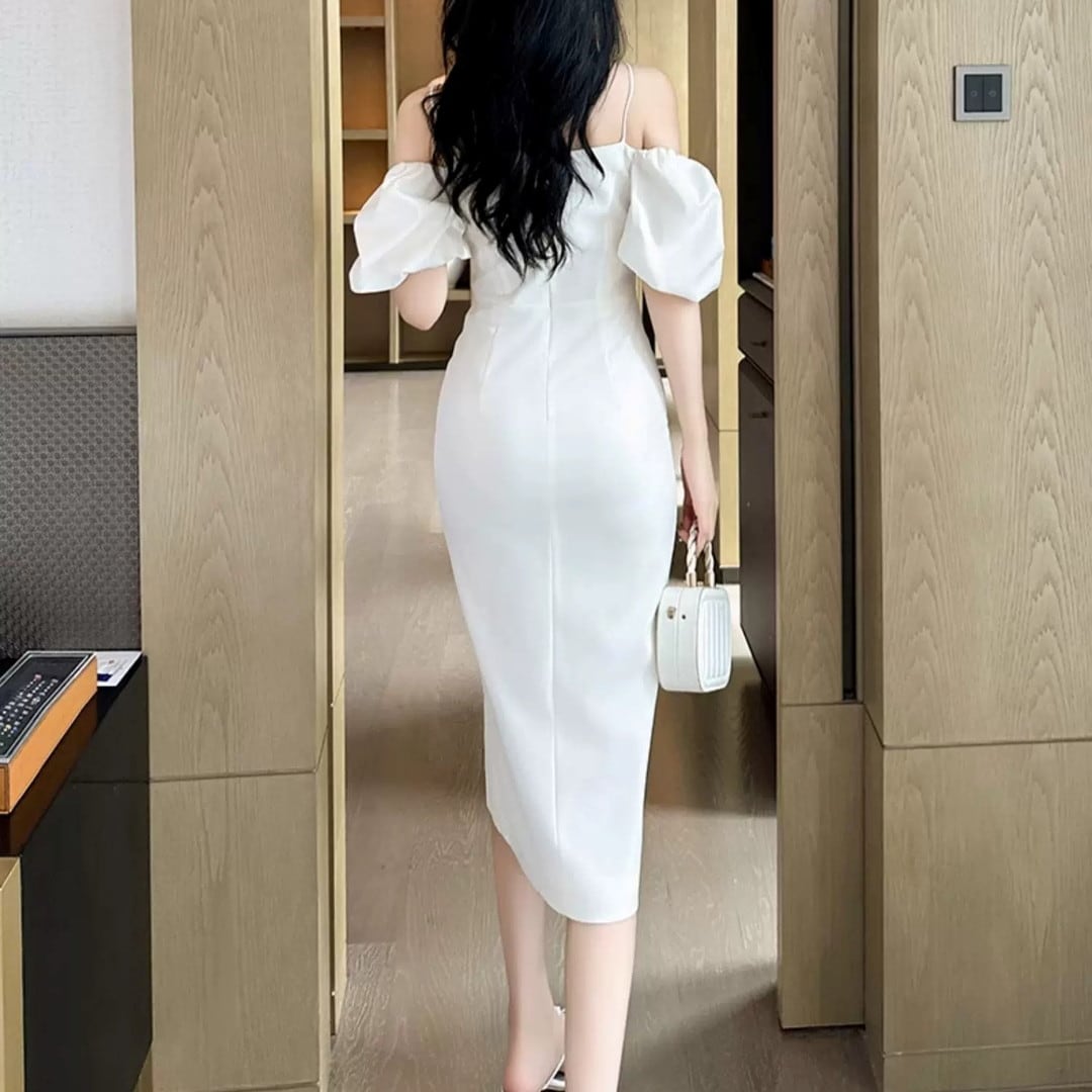 エレガントな装いを叶える、洗練されたシルエットのワンピースです。オフショルダーデザインがデコルテラインを美しく演出し、ボリュームのあるパフスリーブがフェミニンさをプラスします。サイドのスリットが歩くたびに動きを加え、洗練された大人の魅力を引き出します。特別な夜のディナーや、上品な装いが求められるシーンにおすすめです。