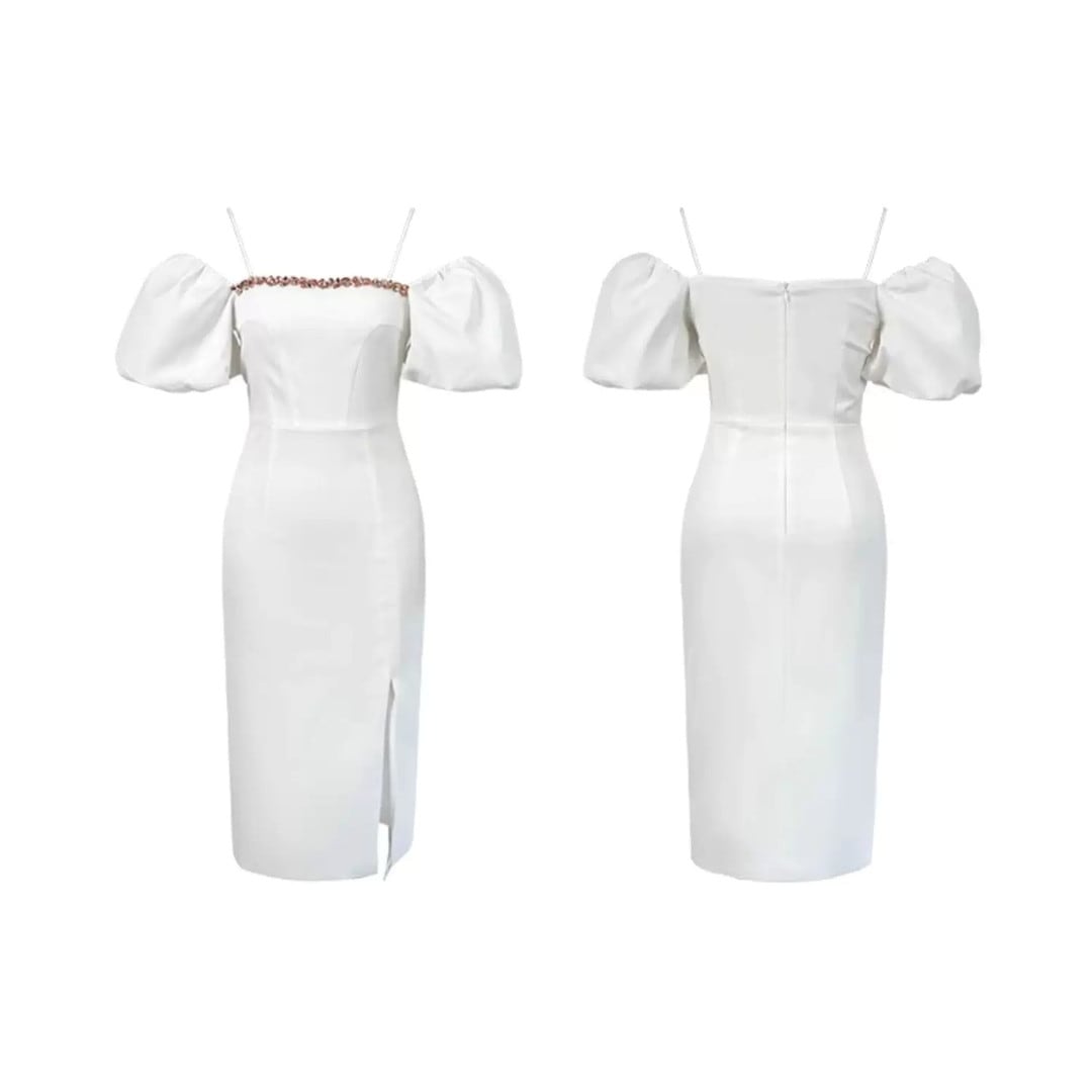 puff sleeve slit midi dress V3339
