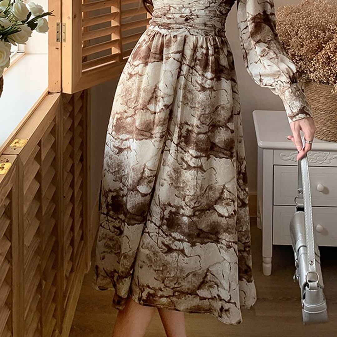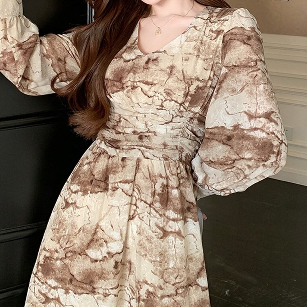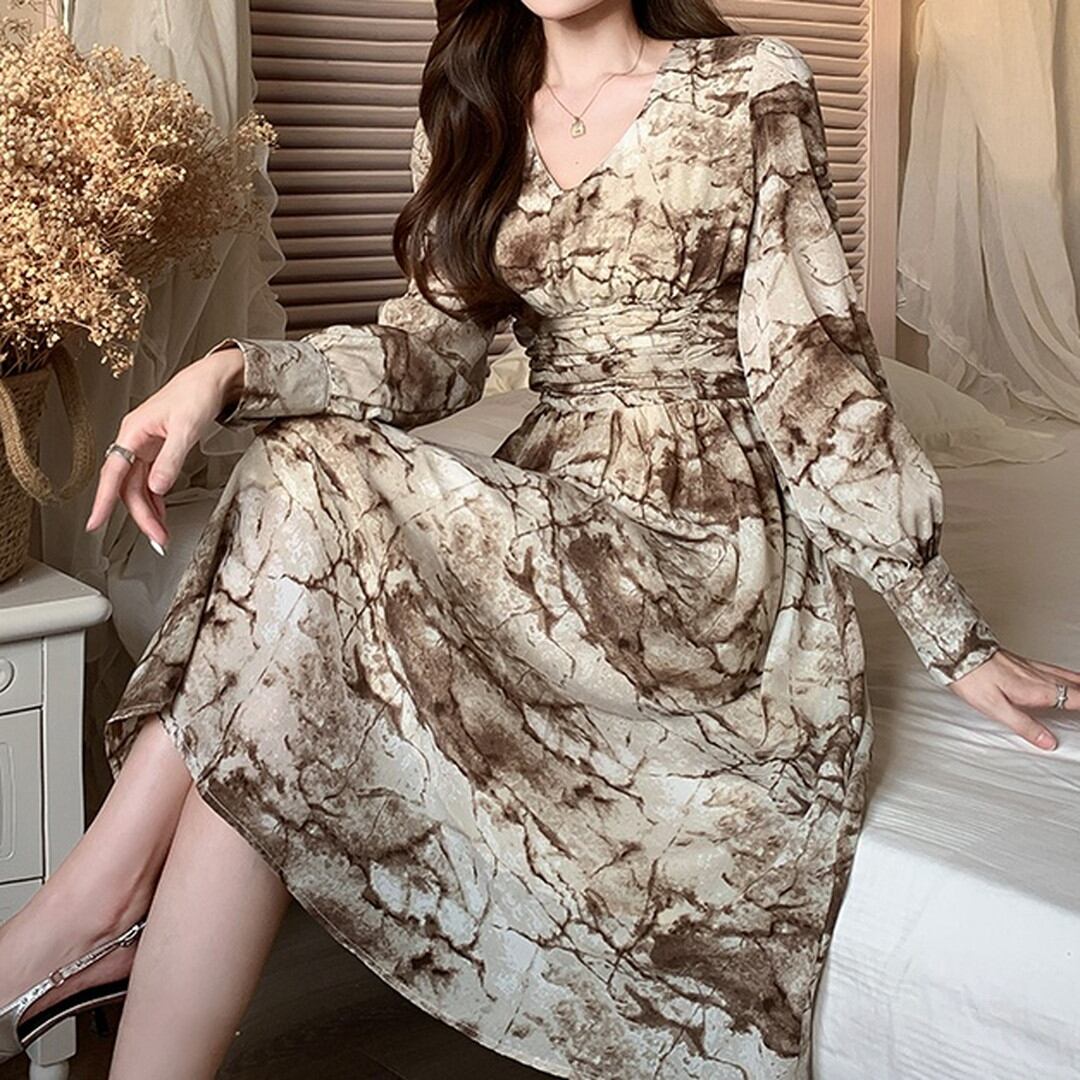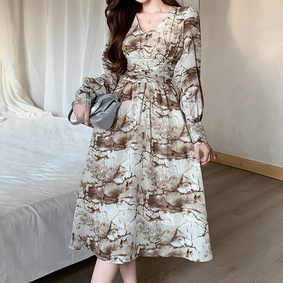 Printed Flared V-Neck High Waist Dress V1351