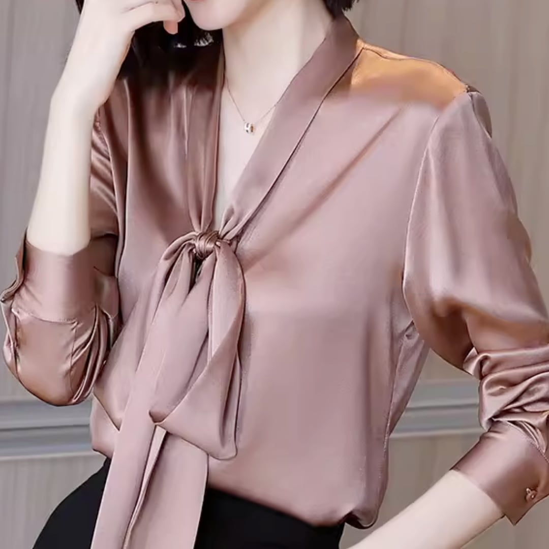 V-Neck Bow Tie Glossy Fabric Long Sleeve Simple Shirt(5color) V1411