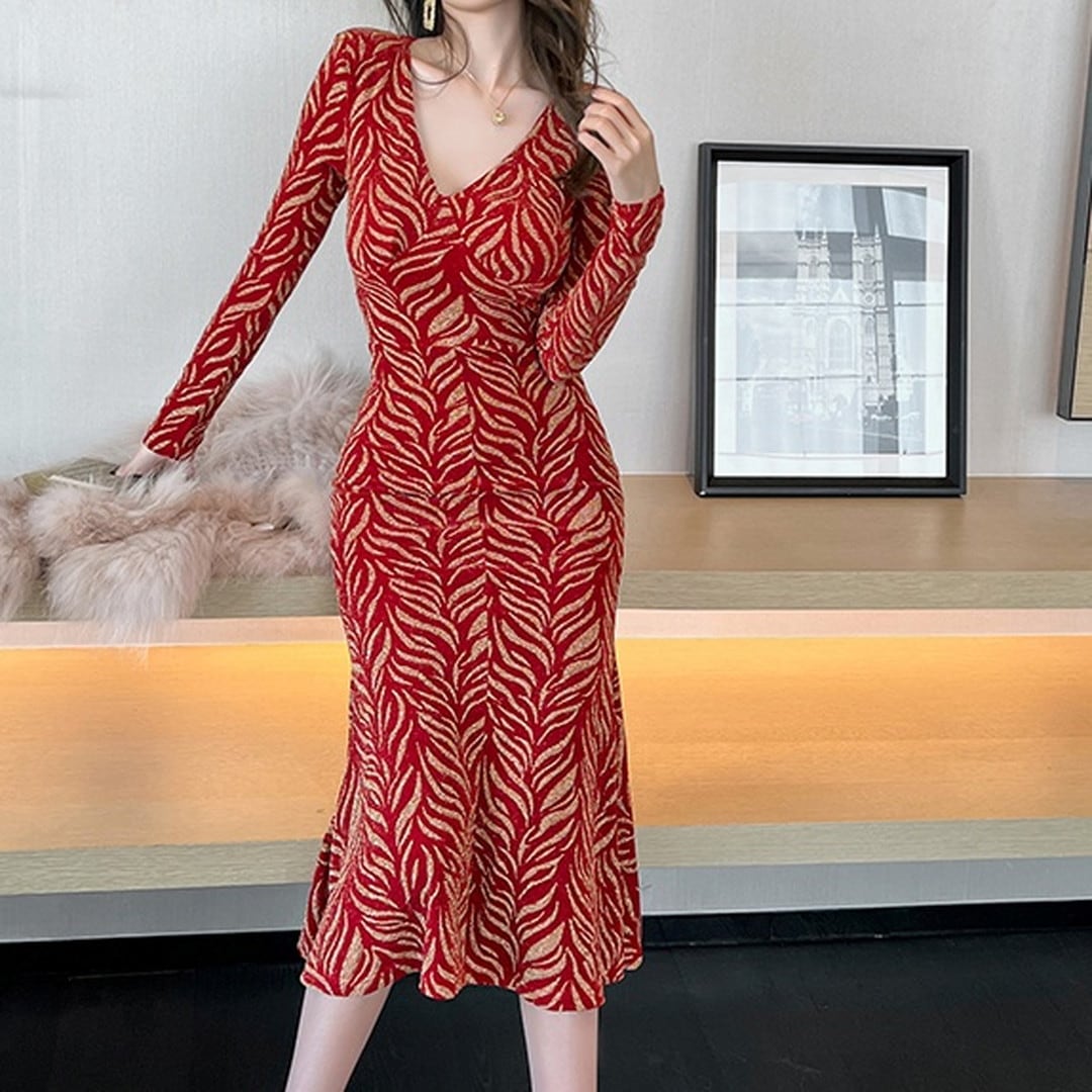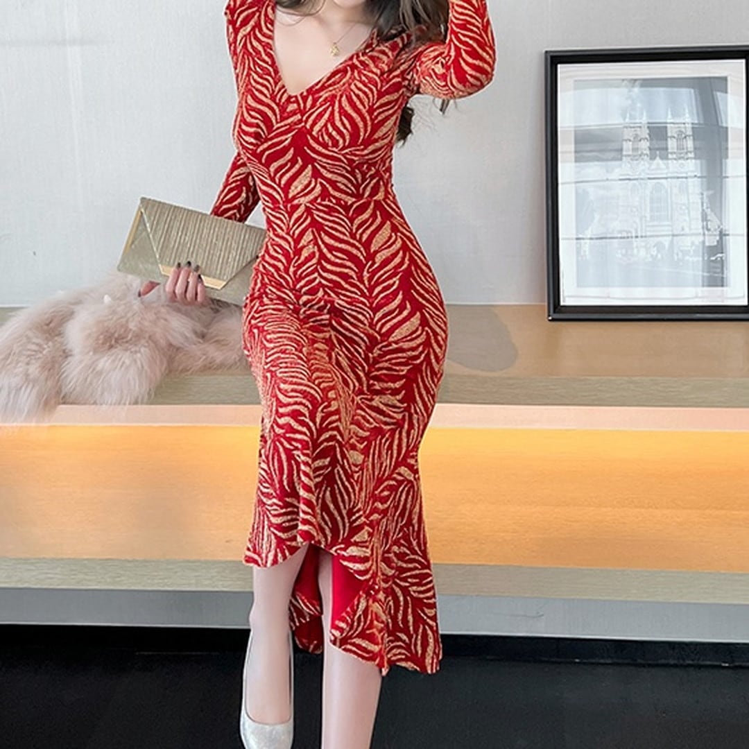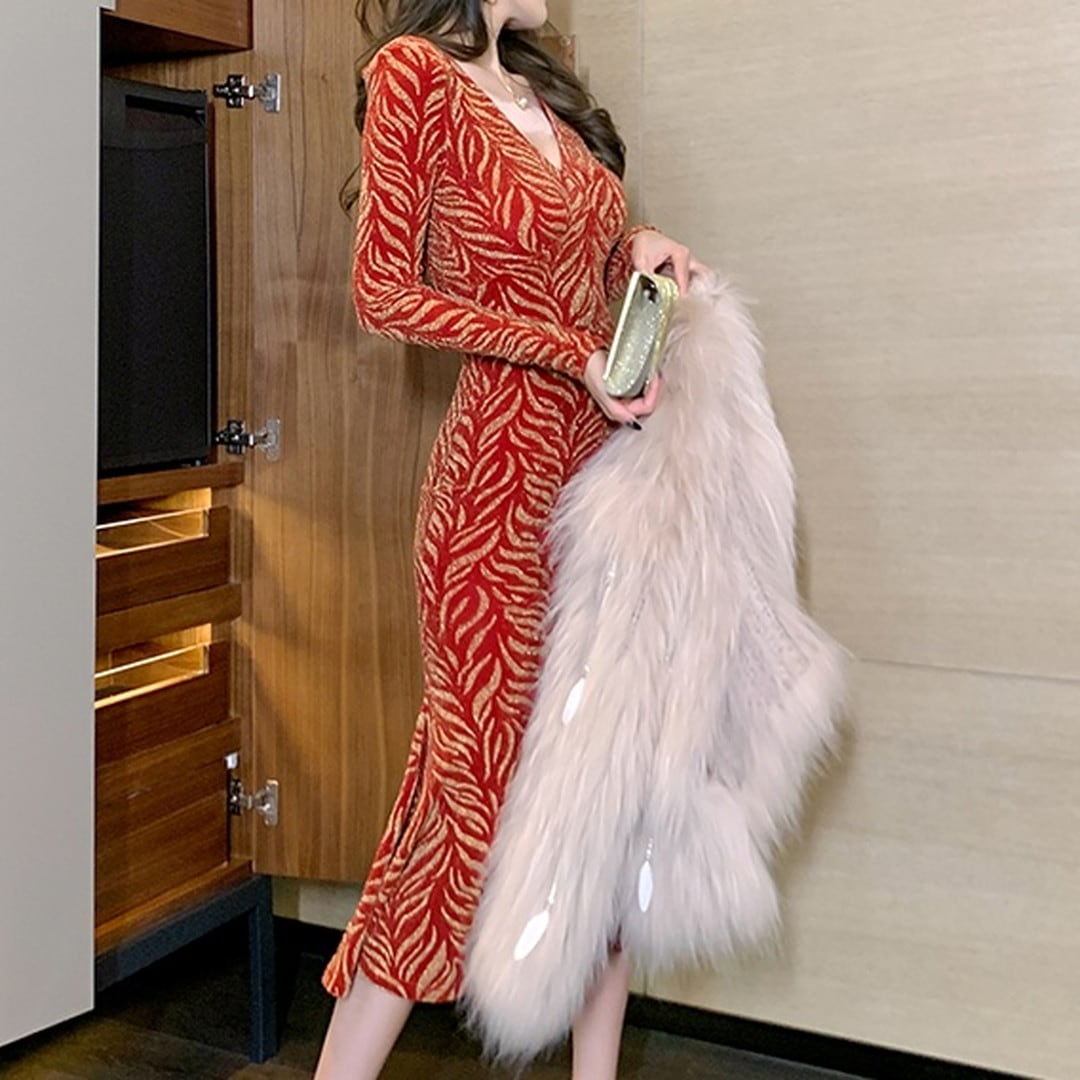 Vネックが顔周りを華やかにし、スリムなシルエットが美しさを引き立てます。
