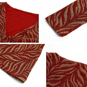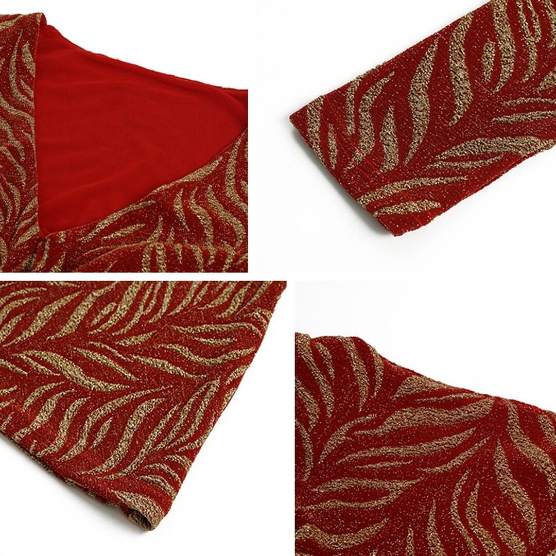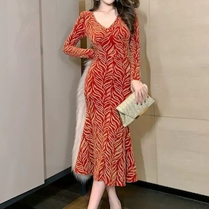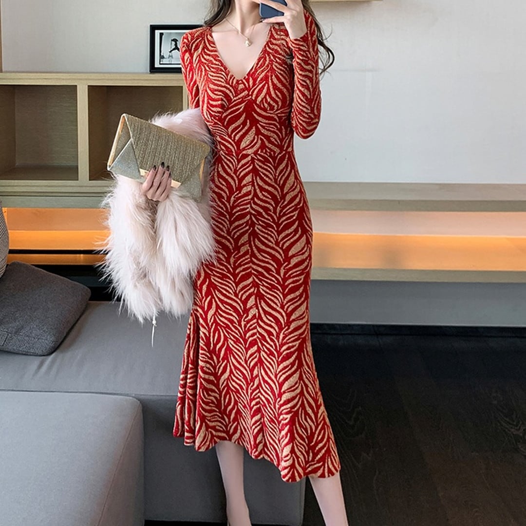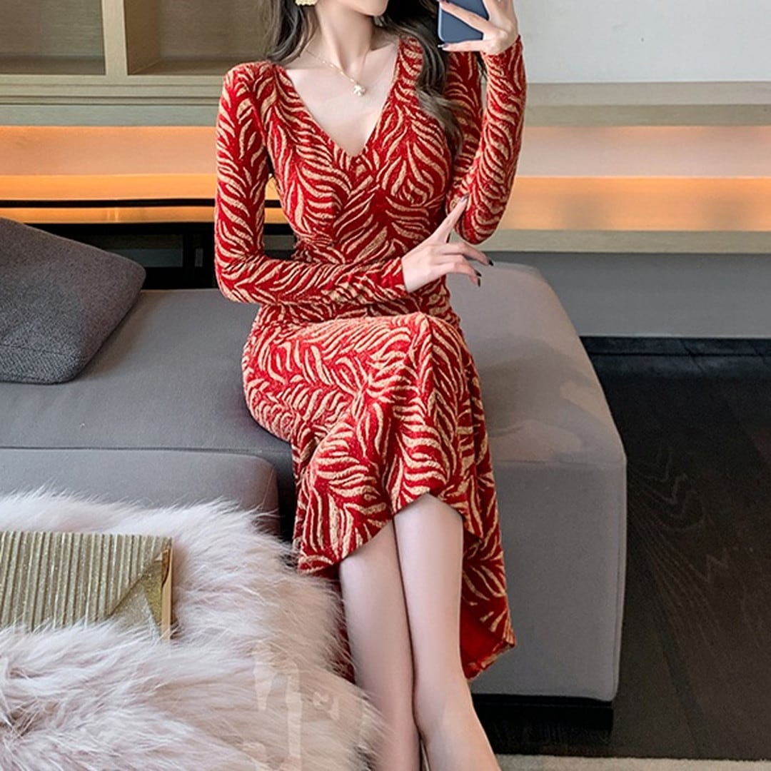 Vネックが顔周りを華やかにし、スリムなシルエットが美しさを引き立てます。