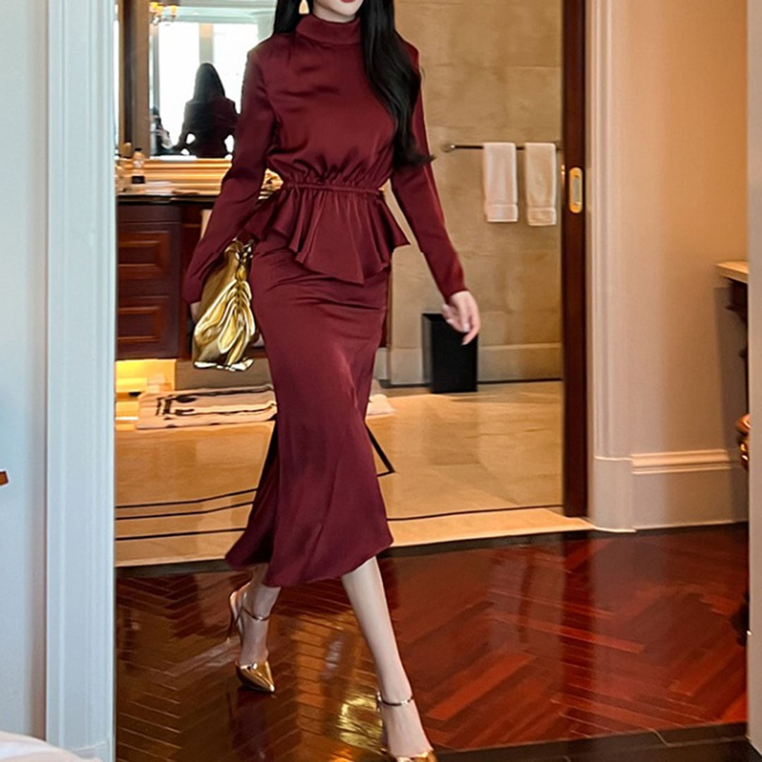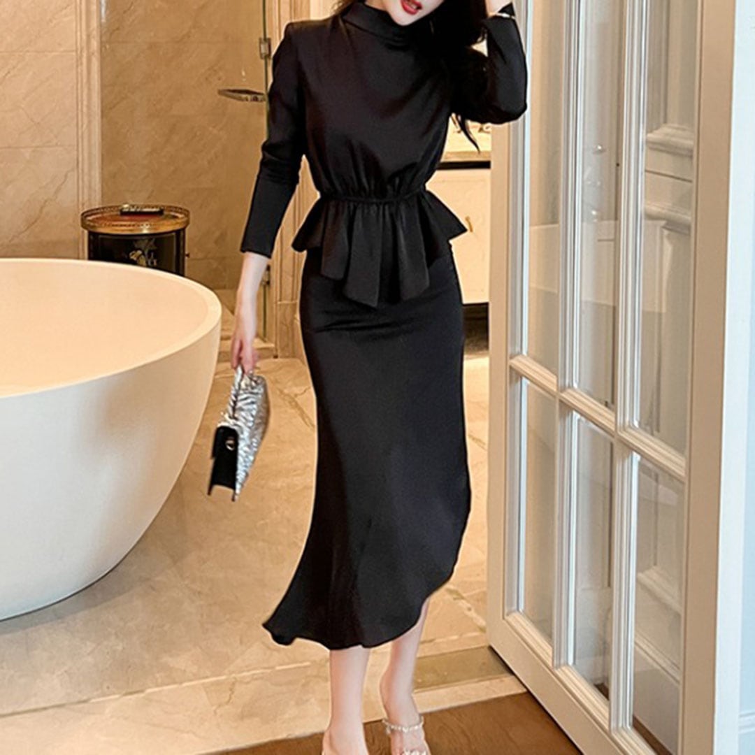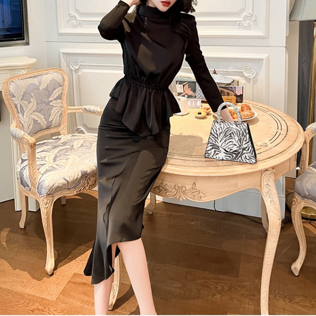 Long Sleeve Irregular Ruffled Dress High Neck Feminine Elegant Top and Bottom Set Dress Set up(2color) V1925