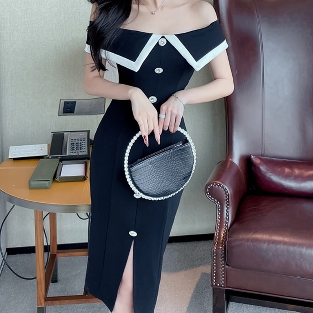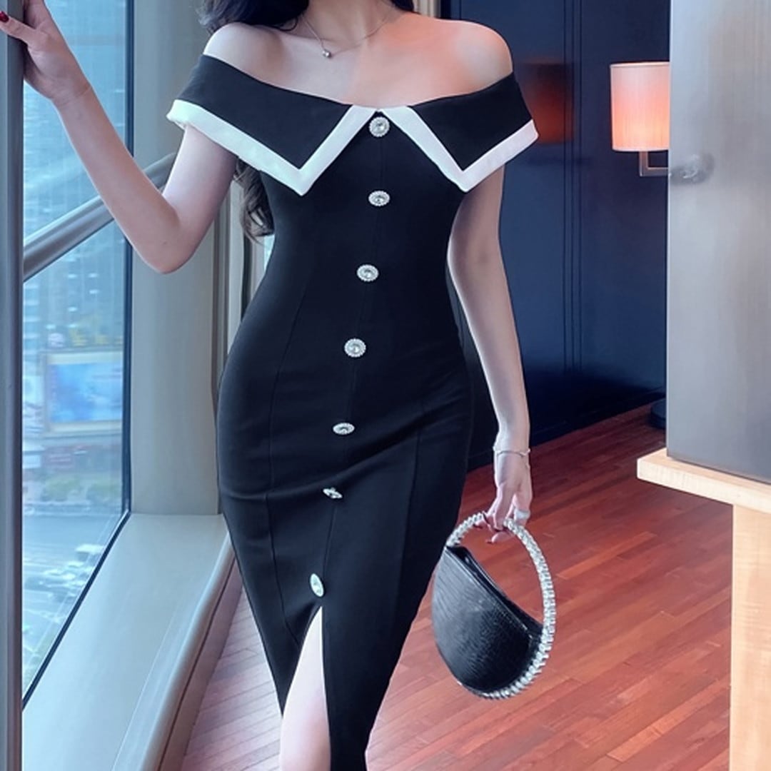 Off-the-shoulder Slim Waist Slit Skirt Dress V2093