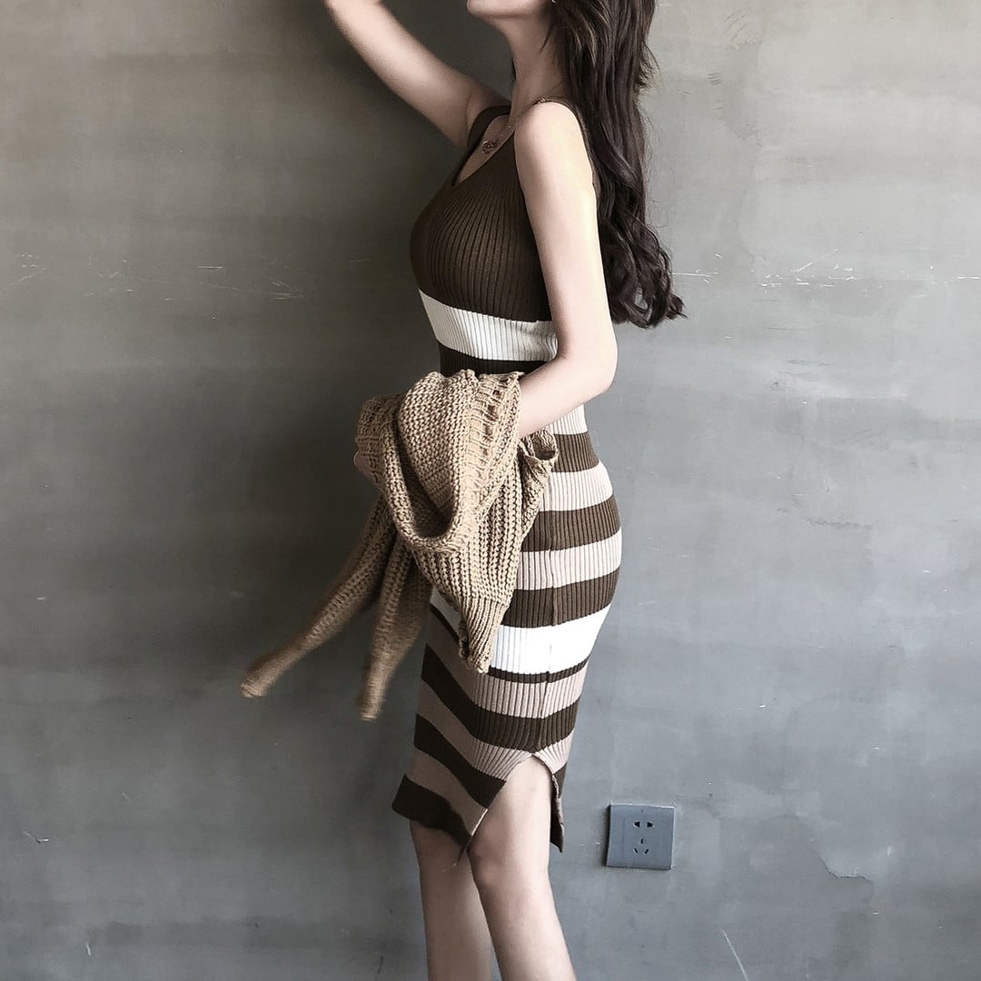 Spring and Fall Sexy Off-Shoulder Knit Striped Dress Two Piece Setup V2358